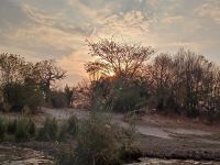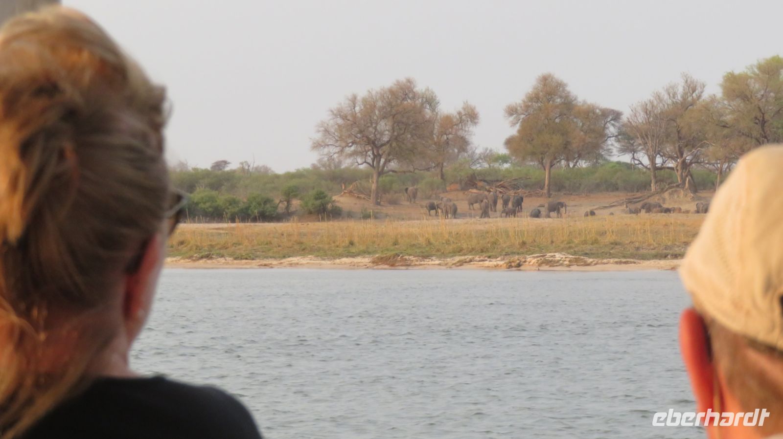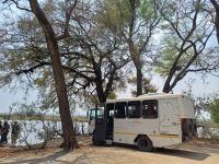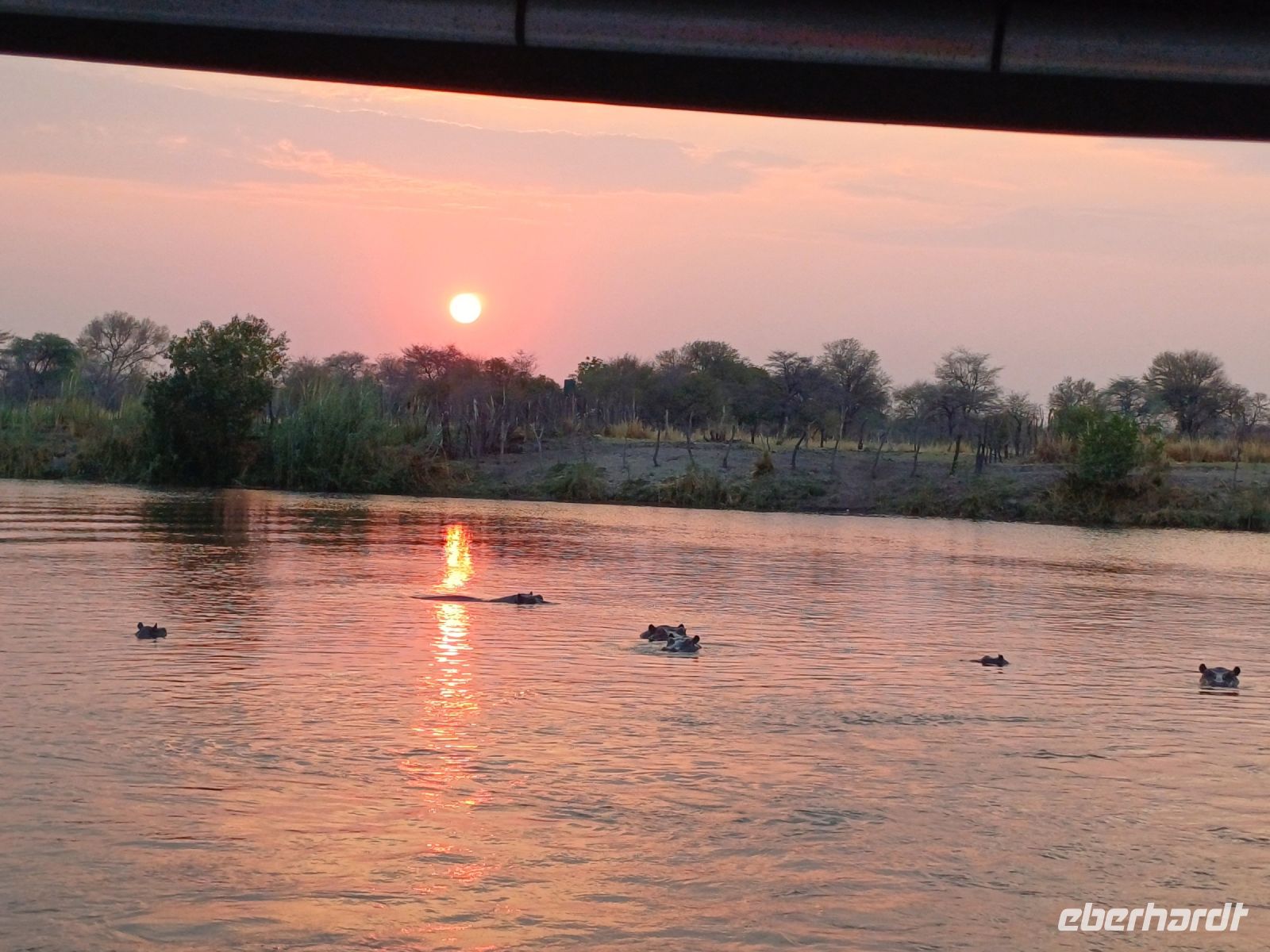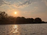 sollen wir uns schon mal gewöhnen. Erst mal Fieber messen und dann warten wir auf unsere Visa‘s, wohlgemerkt jedes einzelne per Hand geschrieben. Am Ausgang erwarten uns Jaco, unser Guide mit dem Truck. Endlich – wir sind angekommen! Auf geht es in Richtung Grenze nach Botswana und weiter nach Kasane. Am Nachmittag erreichen wir die kleine River View Lodge und beziehen unsere hübschen Chalets. Nach einem ersten Kenneltern-Date, dem ersten afrikanischen Sonnenuntergang und einem leckeren Abendessen fallen wir alle müde in unsre