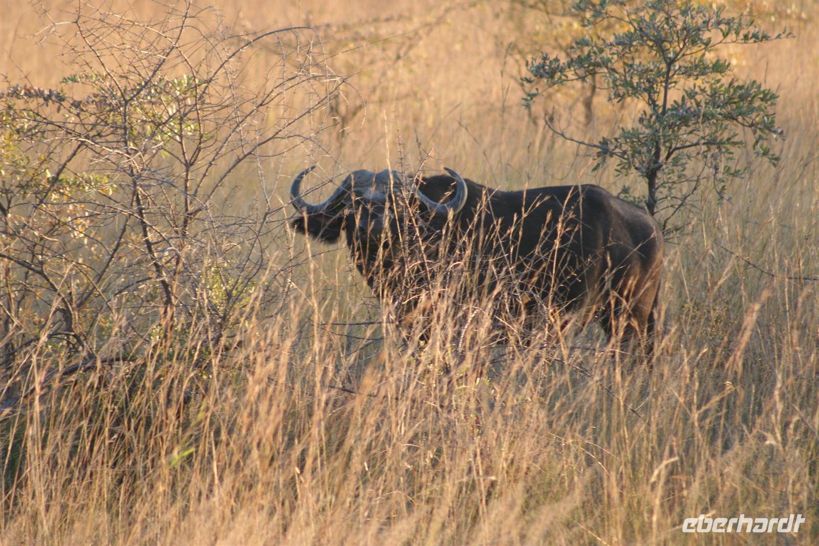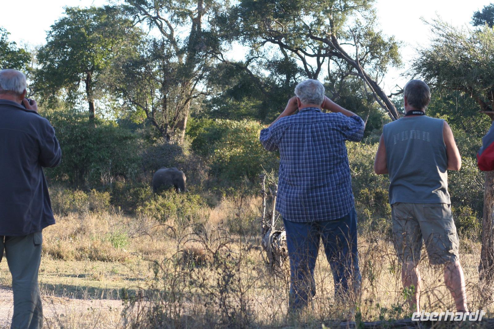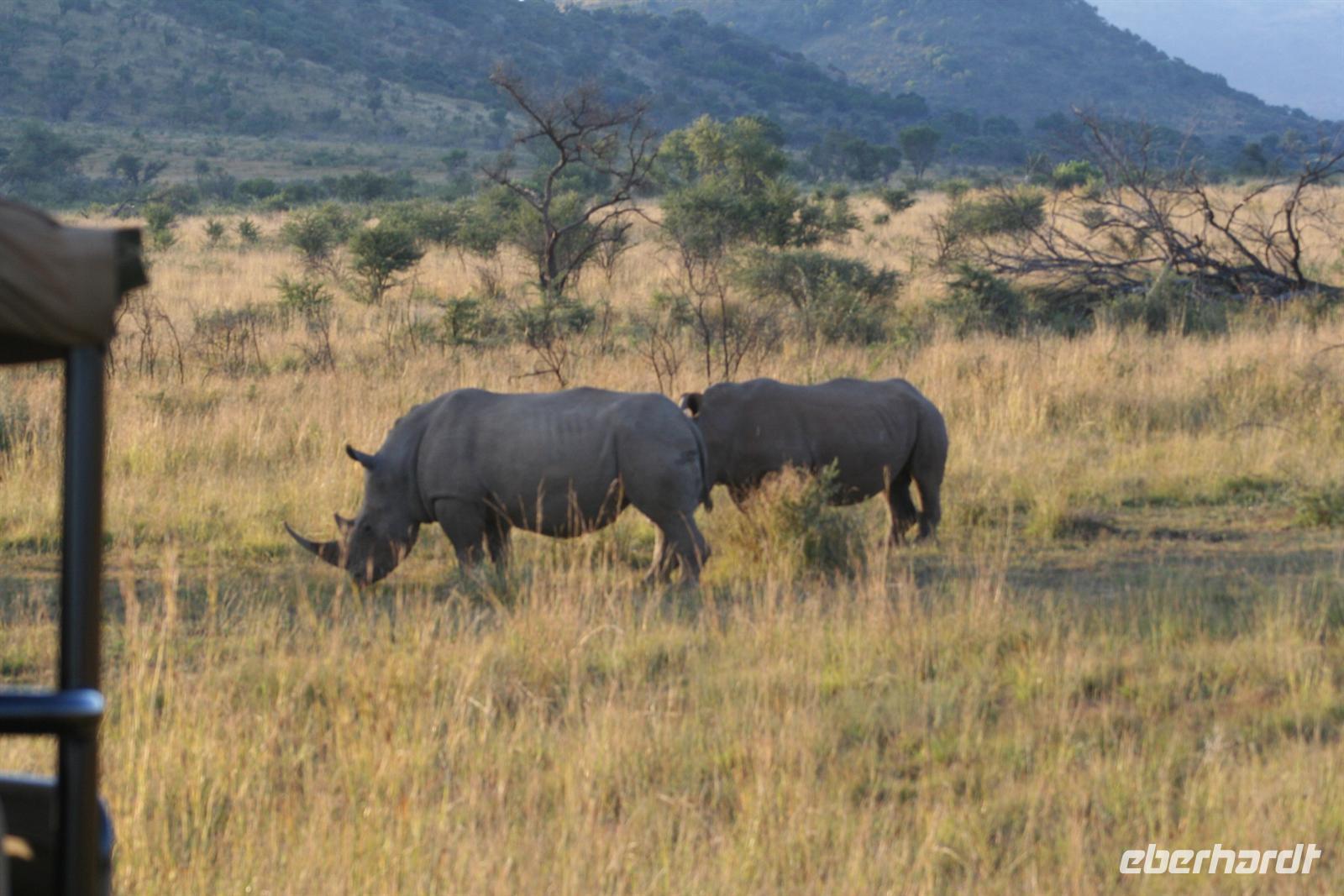 Am nächsten Morgen standen wir früh auf, um den Pilanesberg NP auf einem Morning Walk zu erkunden. In zwei kleinen Gruppen mit je zwei Rangern des NP brachen wir noch vor Sonnenaufgang auf. Zunächst mit Jeeps fuhren wir auf Sandwegen durch den Park. Noch in der Dunkelheit kreuzte eine Nashorn-Mutter mit ihrem knapp 2 Wochen alten Sprössling unseren Weg. Langsam ging die Sonne hinter den Bergen auf und Nebelschwaden entwichen - ein mystisches Schauspiel. Bald darauf parkte unser Jeep in einem weitläufigen Tal mitten im Busch. Wir schulterten unsere Rucksäcke und unsere Ranger kontrollierten ihre "Ausrüstung" (Gewehr und Fernglas). Im Gänsemarsch stapften wir durch das meterhohe Gras. Spannend und abenteuerlich, unsere Ranger checkten immer wieder die Umgebung und führten uns in die Geheimnisse eines Rangers ein. Nicht nur Fernglas, sondern auch Tiergeräusche, der Wind, Raubvögel am Himmel und Spuren am Boden oder an Bäumen sind ausgezeichnete "Berichterstatter" im Busch. Unser Ziel war ein Anhöhe, in den Morgenstunden war es für uns ein BERG, den wir auf unterschiedlichste Weise erklommen. Oben angekommen genossen wir die nun intensiven Sonnenstrahlen, die herrliche Umgebung. Wir entdeckten eine Wasserbock-Herde, Zebras, Warzenschweine, Gnus, Giraffen, Hippo, Elefant, hörten einen Löwen brüllen und auch der graue "Go away" Vogel begrüßte uns lautstark.
