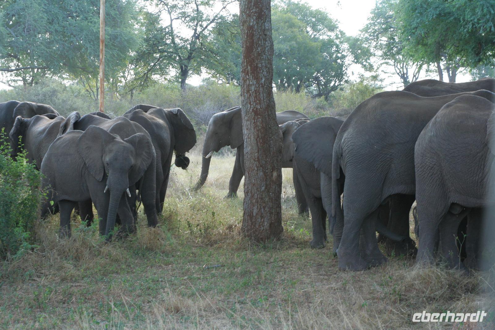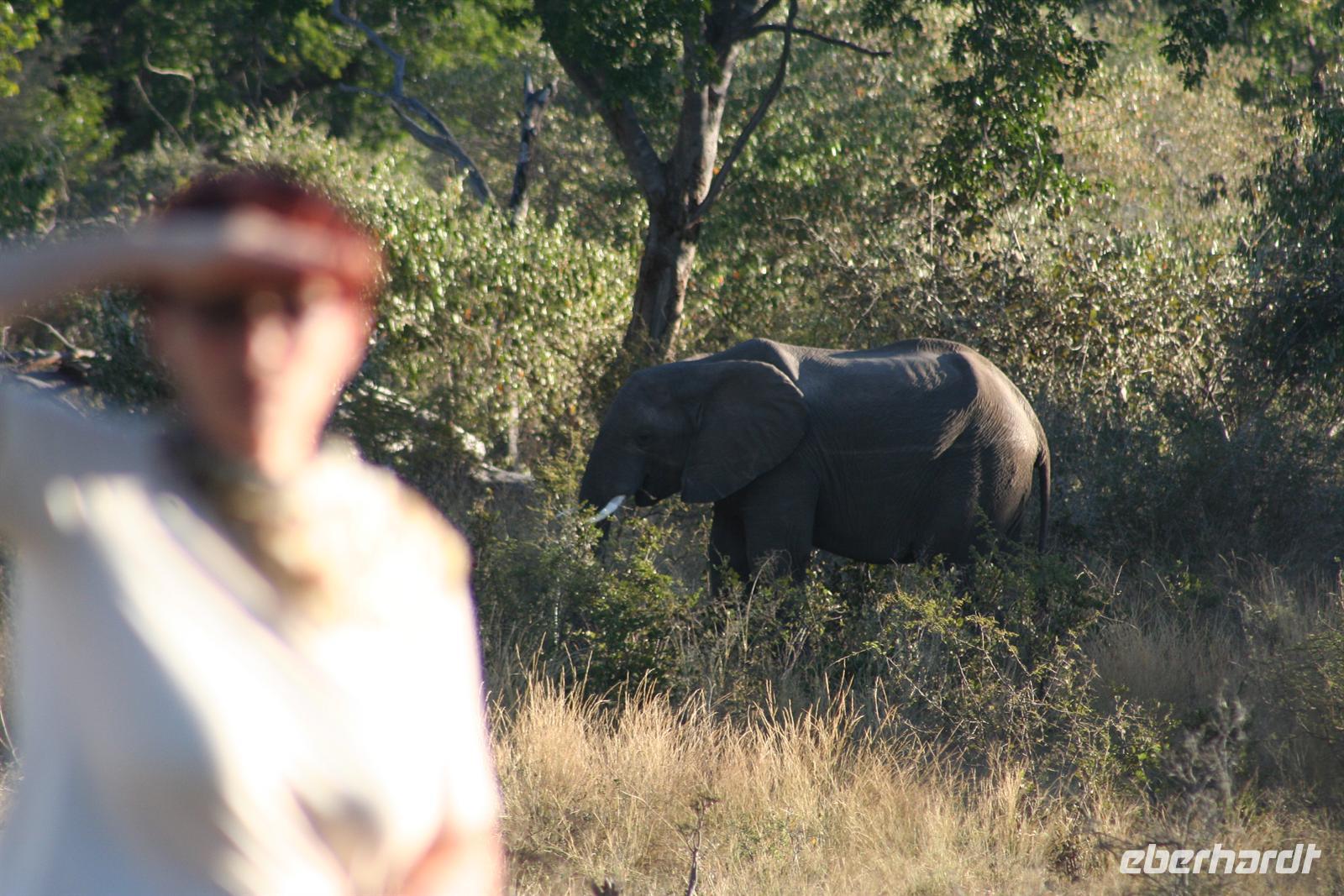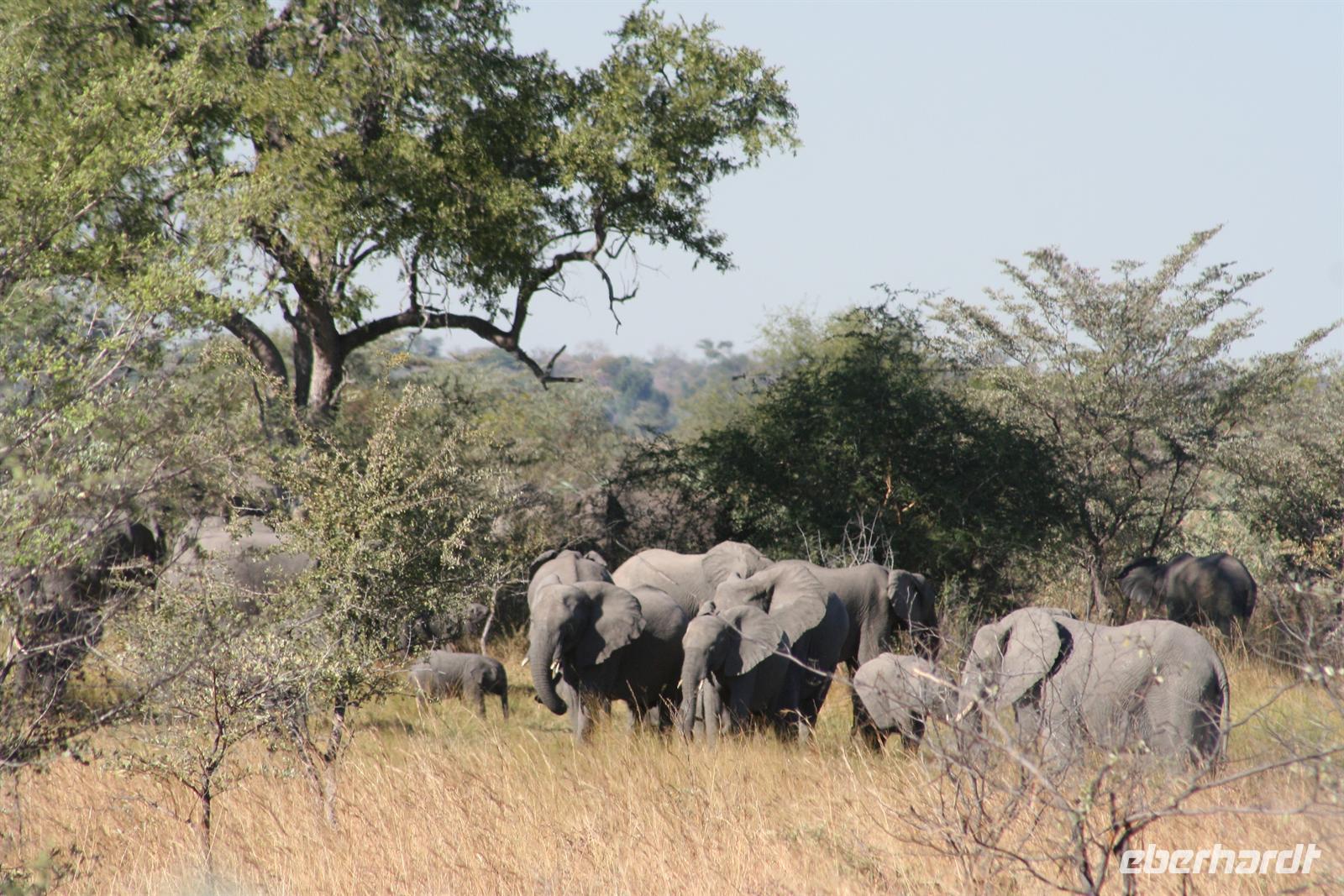 Noch vor Morgengrauen waren wir am nächsten Tag bereit, um auf spannende Jeep-Safari in den Chobe NP aufzubrechen. Mit 2 Fahrzeugen ging es los. Ein spannendes Gefühl im Dunklen die geheimnisvollen Geräusche des afrikanischen Busches zu deuten, aus dem Dickicht blitzten uns scheu die Augen von Impalas an. Den Sonnenaufgang erlebten wir am Chobe Fluss, einfach einmalig. Auf einer Anhöhe hielten wir und schlürften überwältigt unseren warmen Kaffee oder Tee. Und weiter gings, uns hatte das Jagdfieber gepackt. Am Ufer des Chobe gaben sich nun Elefantenherden "die Klinke in die Hand" und wir waren mittendrin. Vor uns, hinter uns, dazwischen - so viele Elefanten und so nah - jetzt bestätigten sich die Aussagen der Reiseführer: Chobe NP- das Elefantenparadies! Wir waren nur platt.