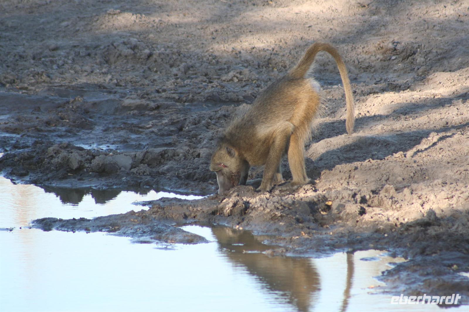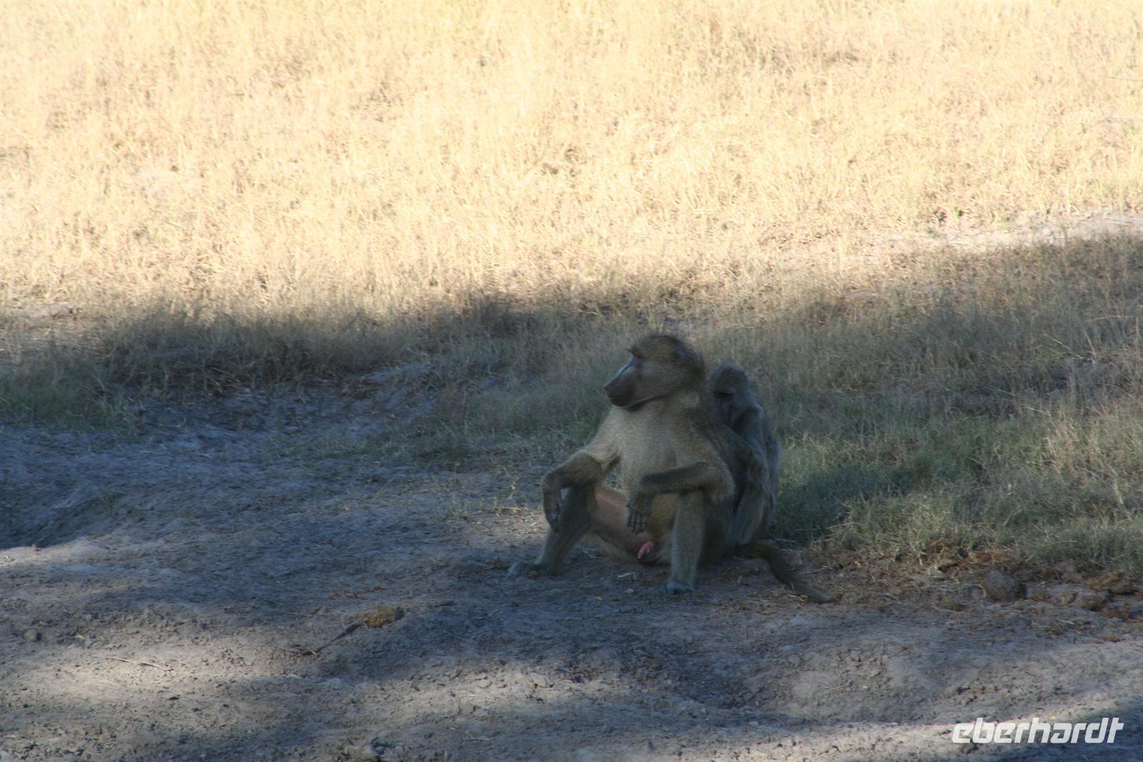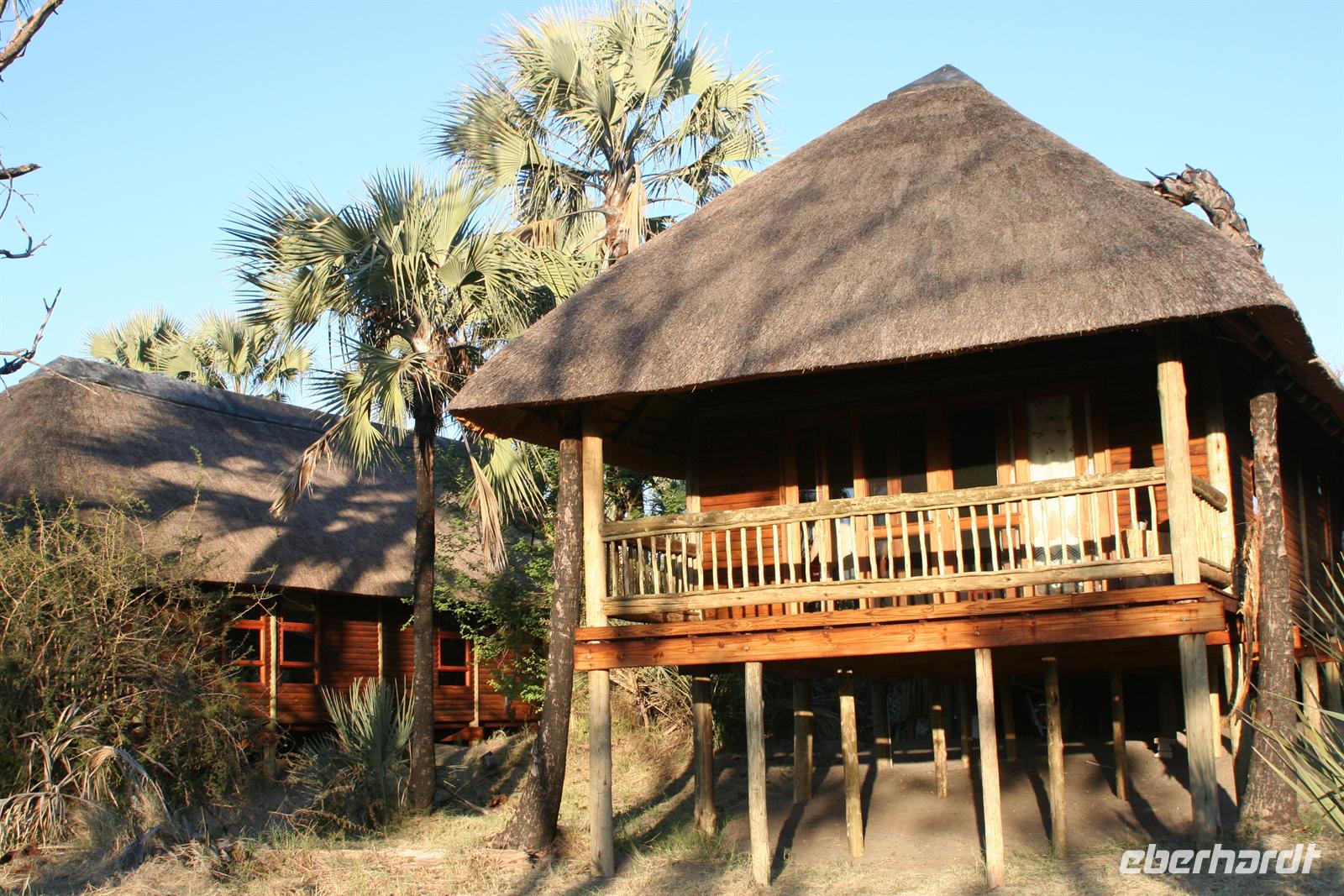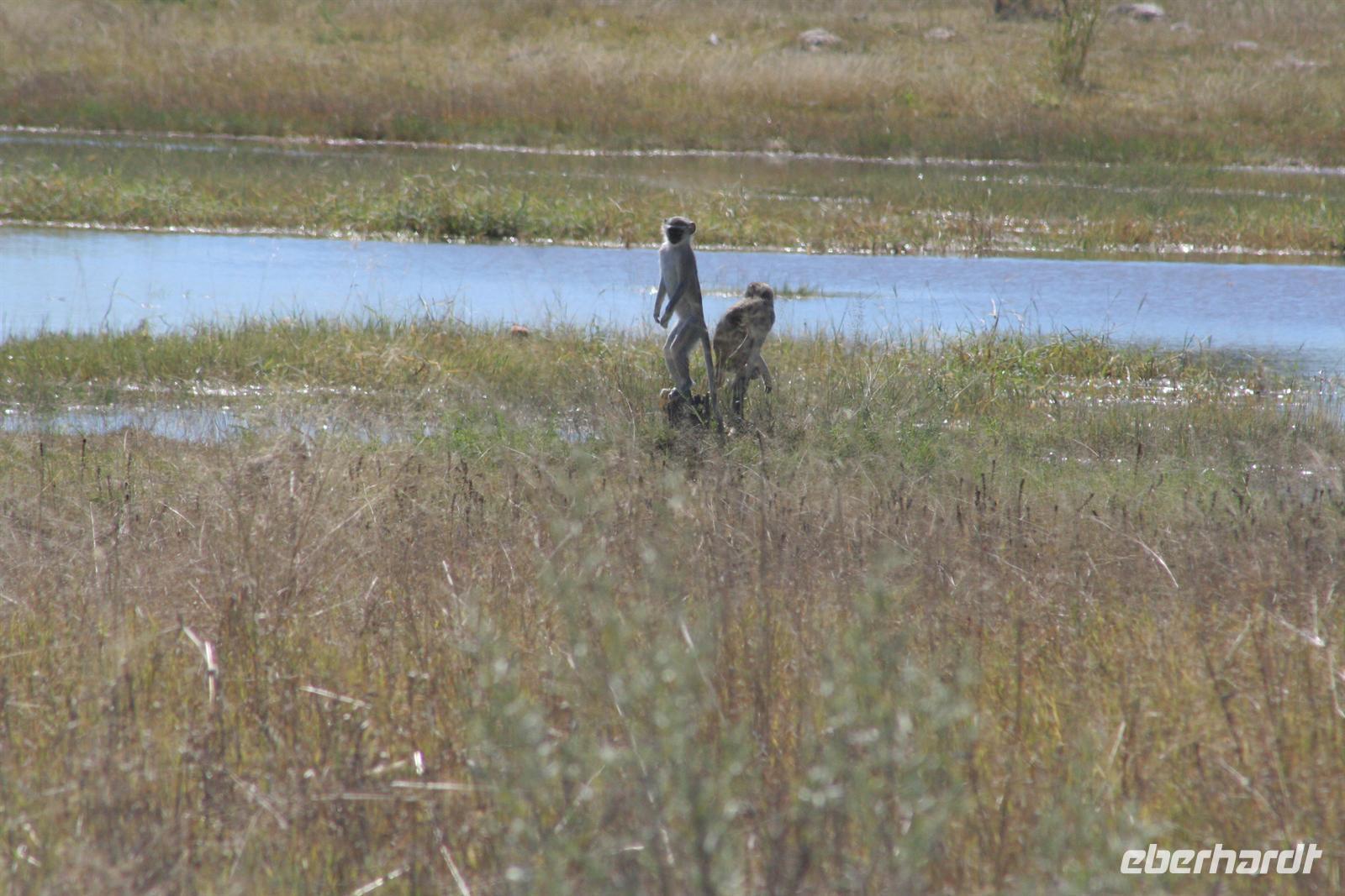 In Etsha 13 stellten wir unser Expeditionsfahrzeug gut bewacht bei Einheimischen unter und stiegen samt Gepäck in Allradfahrzeuge um. Weiter ging die abenteuerliche Fahrt auf Nguma Island durch den Busch und durch Wasser, teilweise mußten wir in Mokoros wegen des Wassers umsteigen. Nach 1,5 h spannender Fahrt begrüßte uns Nookie auf Ihrer "Nguma Island Lodge", einer kleinen Insel, westlich von Serango am "Pfannenstiel" des Okavango-Delta gelegen. Meine Gäste bezogen Ihre Zeltchalets auf Stelzen (mit eigener Du/WC und Terrasse) unter den neugierigen Augen der der kleinen Meerkatzen.