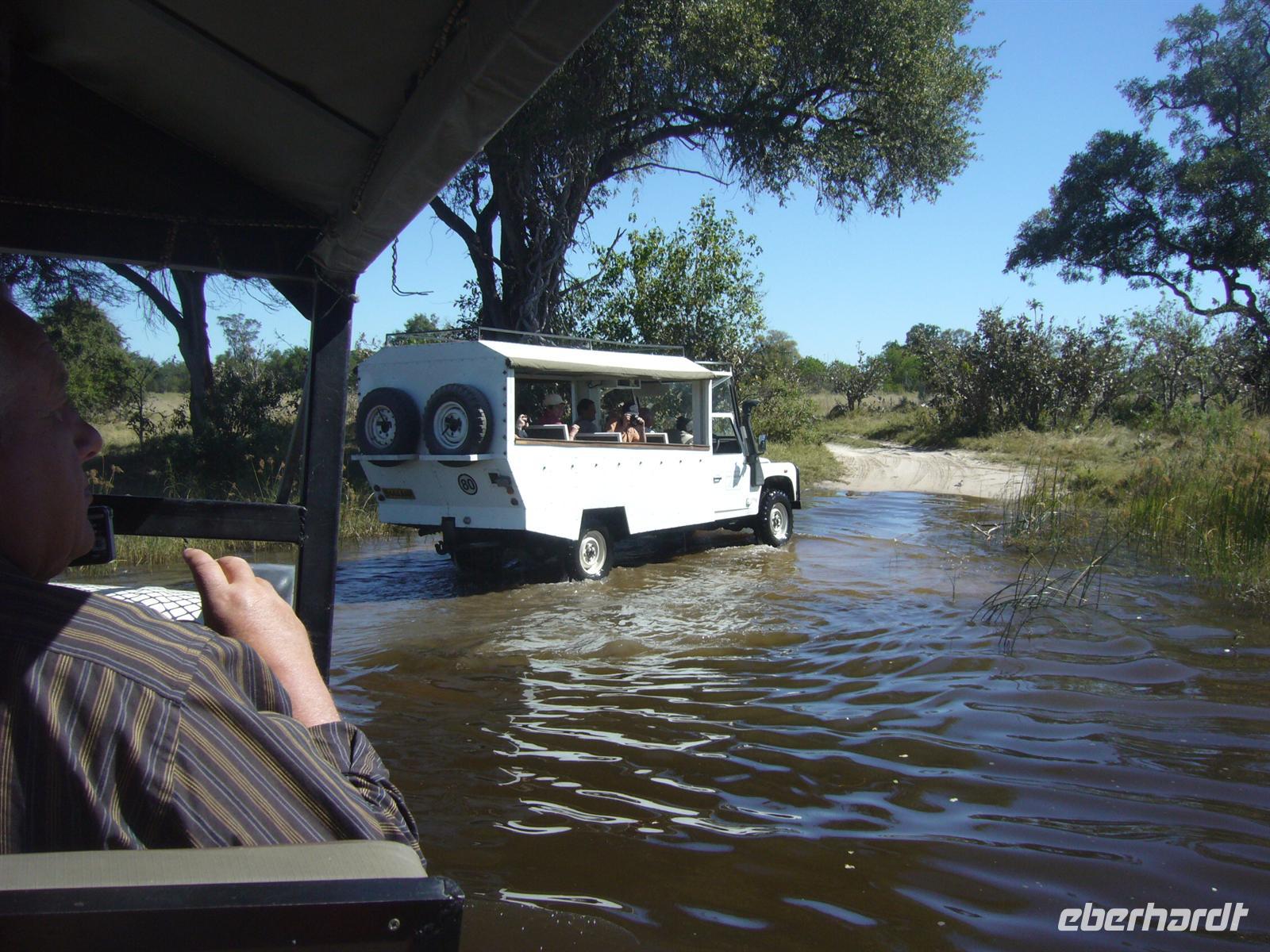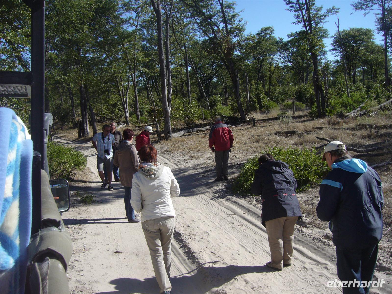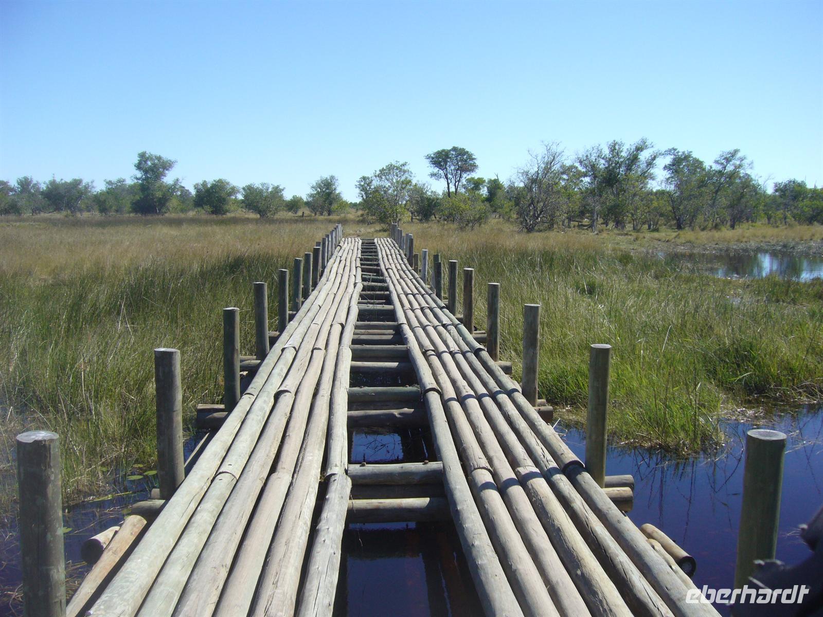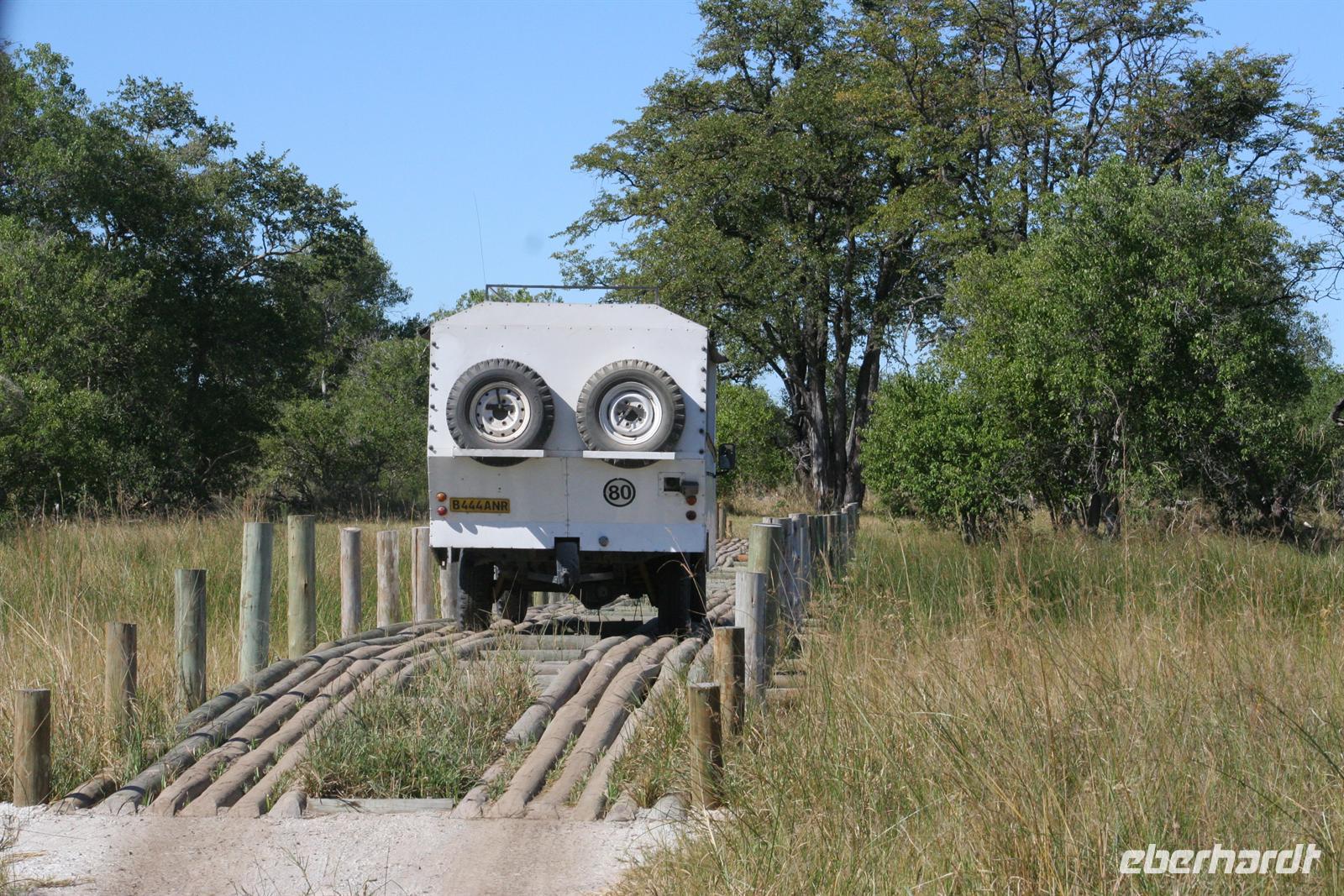 Gleich zu Beginn begrüßte uns eine große Herde Wildhunde, die neugierig unsere Fahrzeuge beschnupperten. Kurz darauf erblickten wir Giraffen und eine Elefantenherde überquerte den Weg zwischen unseren Fahrzeugen in einem Höllentempo. Unsere Guides folgten einer frischen Löwenspur. Doch plötzlich mußten wir einen ungeplanten Stopp mitten in dieser einsamen Wildnis einlegen. Ein Reifen war geplatzt. Wir stiegen aus. Während die Fahrer und Thomas versuchten zu reparieren, folgten die Eberhardt-Abenteurer der Löwenspur! Hier mußte ich das einzigste Mal als Reiseleiter ein Machtwort zu der sonst äußerst disziplinierten und tollen Gruppe sprechen: "Bitte nicht von den Fahrzeugen entfernen, wir sind hier hier in echter afrikanischer Wildnis und die Löwen echt!". Die Reparatur gestaltete sich auf dem sandigen Boden etwas schwieriger als gedacht, aber alles ging gut. Nach einer 1/2 Stunde setzten wir die Pirschfahrt durch die kleinen Lagunen und den Busch fort. Richtige Wegbeschilderungen (wie man das aus dem Etosha-NP in Namibia oder aus den südafrikanischen Parks kennt) gibt es hier kaum. Wir vertrauten unseren Fahrern und überquerten eigenwillige Brückenkonstruktionen, die von unseren Fahrern dokumentiert wurden.