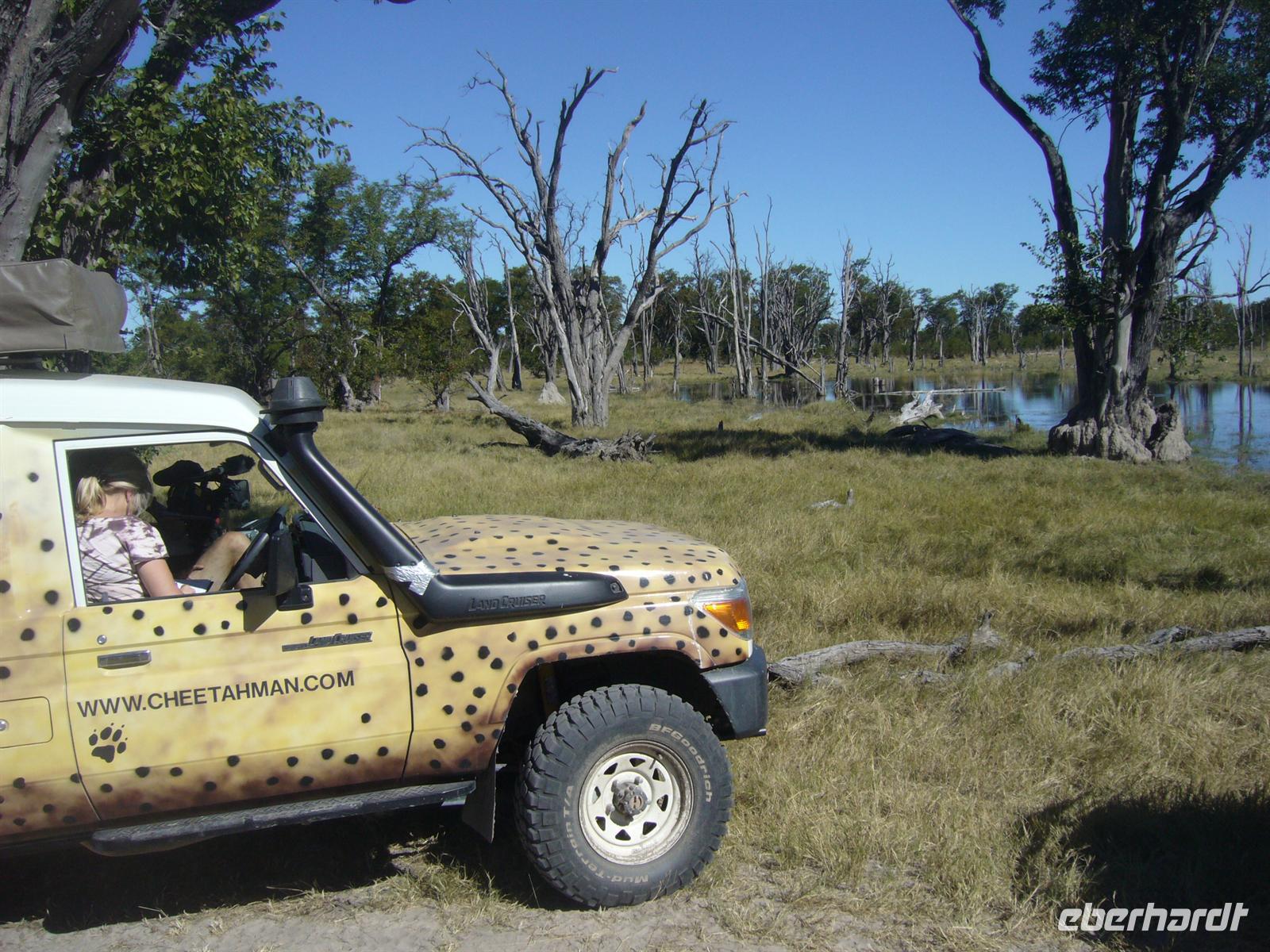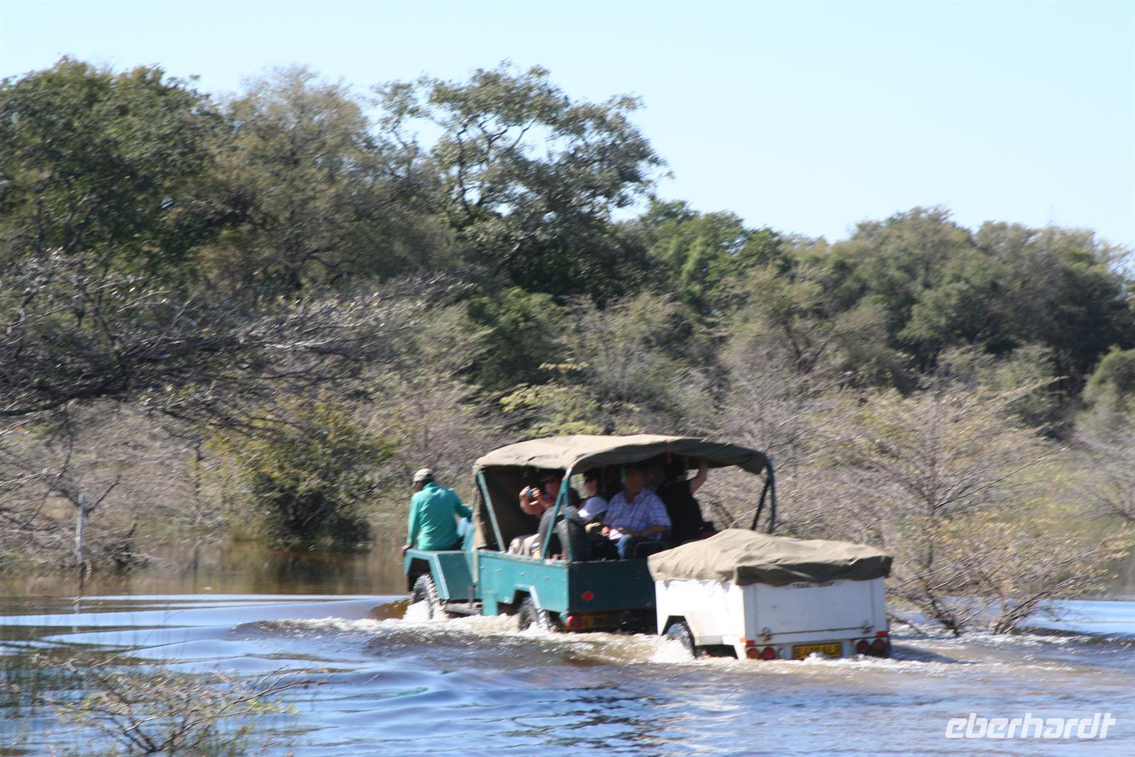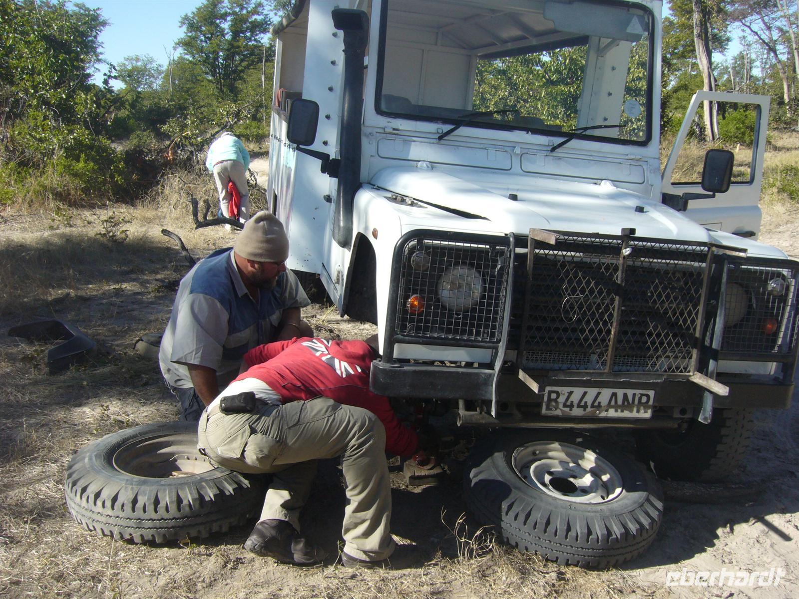 Gleich zu Beginn begrüßte uns eine große Herde Wildhunde, die neugierig unsere Fahrzeuge beschnupperten. Kurz darauf erblickten wir Giraffen und eine Elefantenherde überquerte den Weg zwischen unseren Fahrzeugen in einem Höllentempo. Unsere Guides folgten einer frischen Löwenspur. Doch plötzlich mußten wir einen ungeplanten Stopp mitten in dieser einsamen Wildnis einlegen. Ein Reifen war geplatzt. Wir stiegen aus. Während die Fahrer und Thomas versuchten zu reparieren, folgten die Eberhardt-Abenteurer der Löwenspur! Hier mußte ich das einzigste Mal als Reiseleiter ein Machtwort zu der sonst äußerst disziplinierten und tollen Gruppe sprechen: "Bitte nicht von den Fahrzeugen entfernen, wir sind hier hier in echter afrikanischer Wildnis und die Löwen echt!". Die Reparatur gestaltete sich auf dem sandigen Boden etwas schwieriger als gedacht, aber alles ging gut. Nach einer 1/2 Stunde setzten wir die Pirschfahrt durch die kleinen Lagunen und den Busch fort. Richtige Wegbeschilderungen (wie man das aus dem Etosha-NP in Namibia oder aus den südafrikanischen Parks kennt) gibt es hier kaum. Wir vertrauten unseren Fahrern und überquerten eigenwillige Brückenkonstruktionen, die von unseren Fahrern dokumentiert wurden.