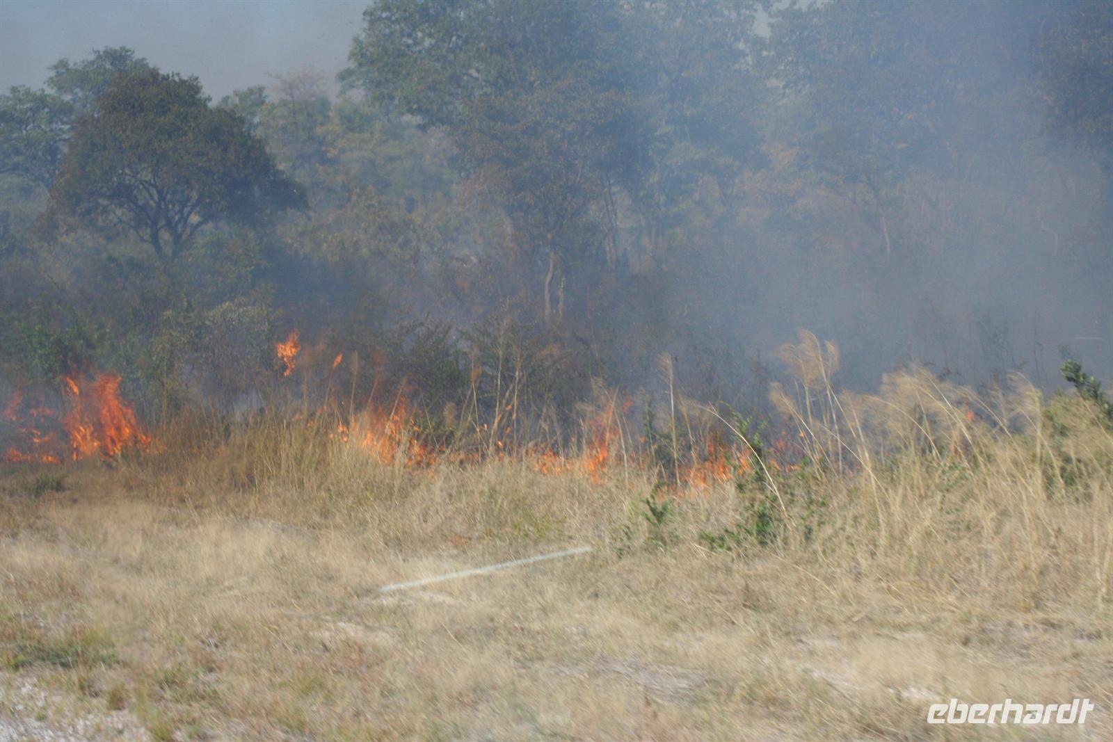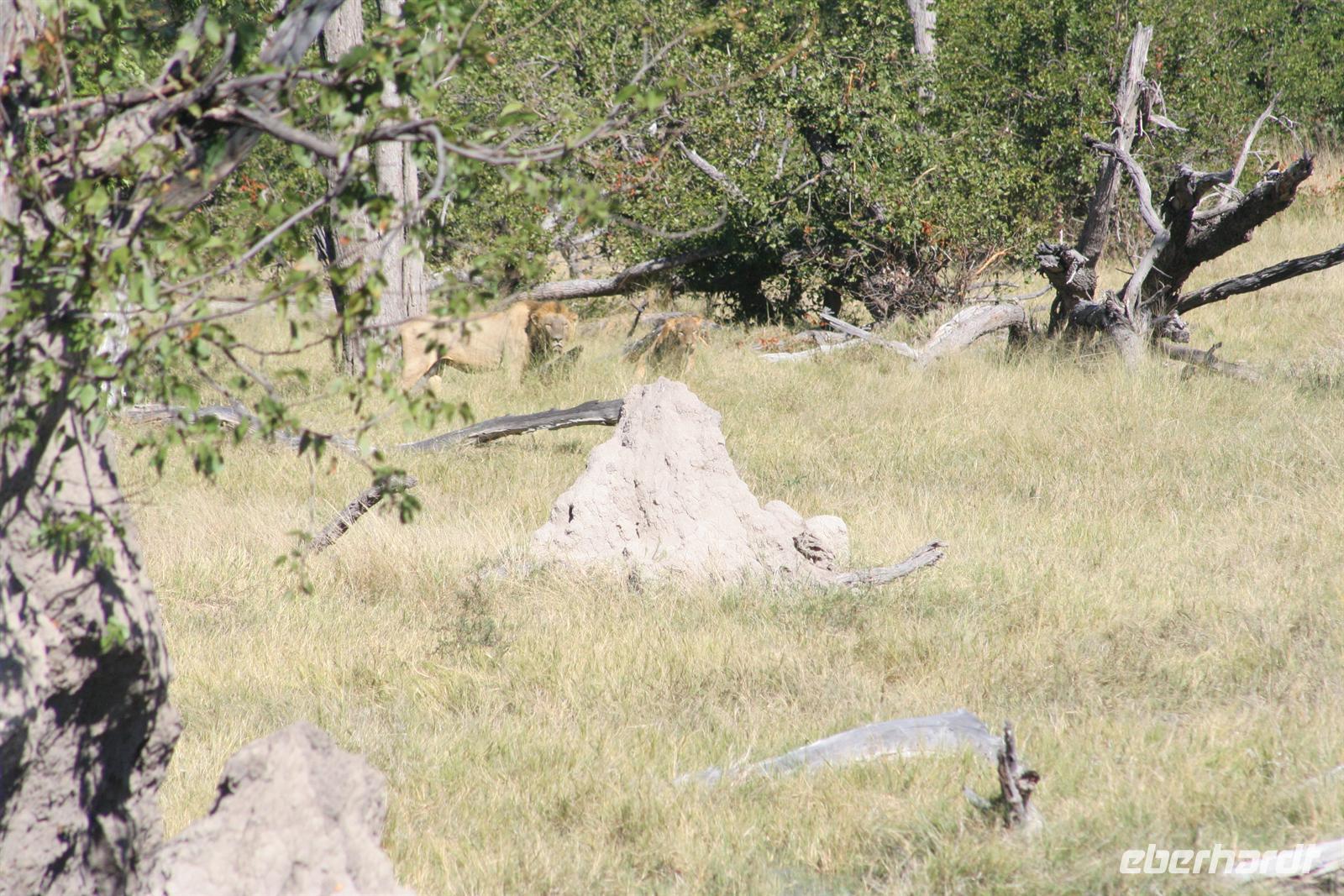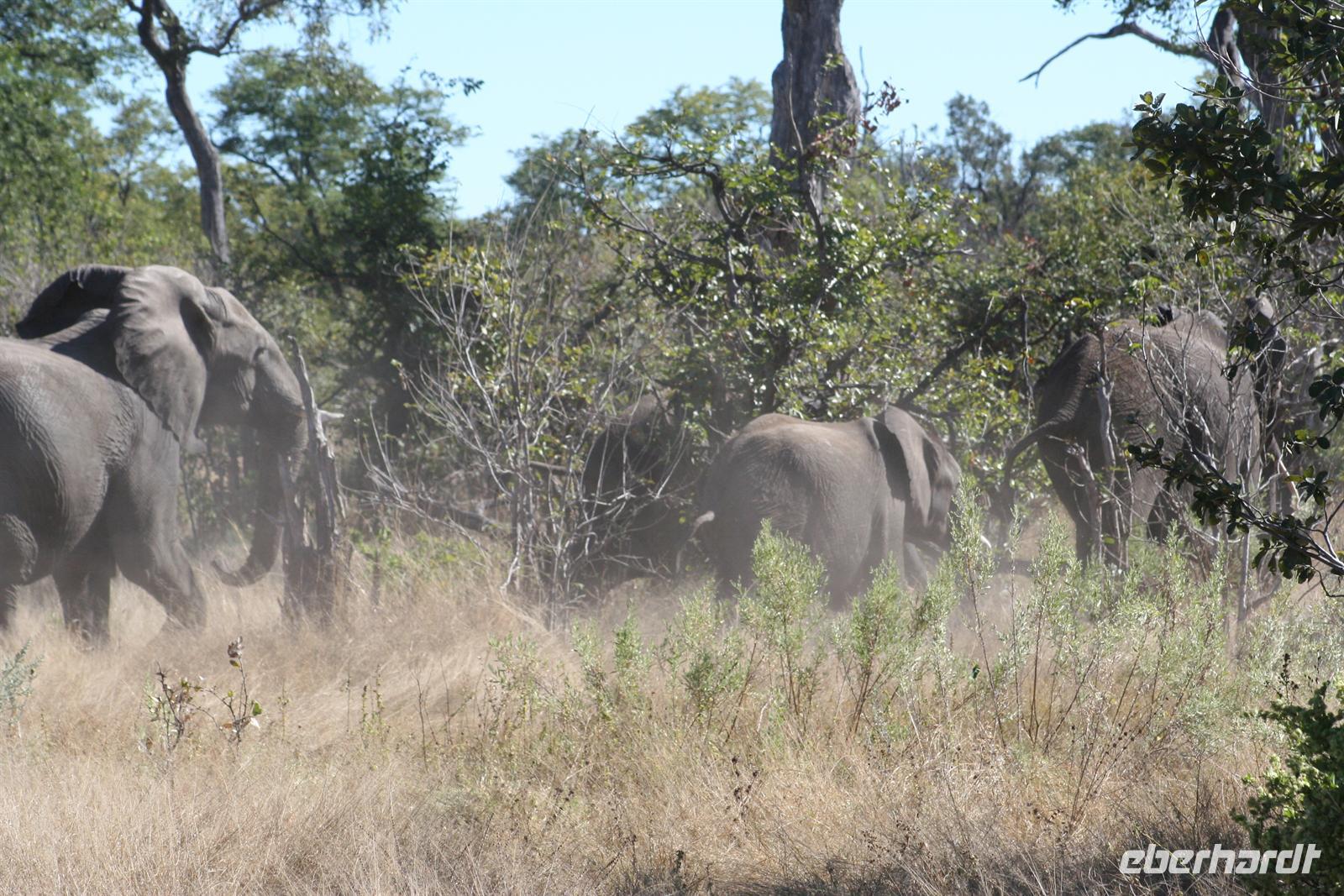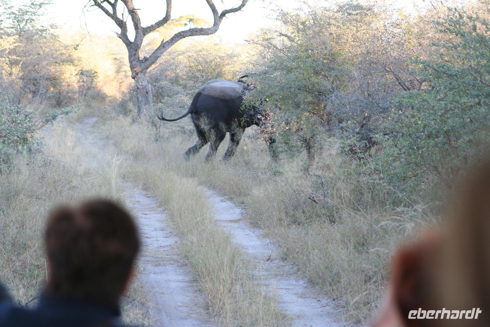 Gleich zu Beginn begrüßte uns eine große Herde Wildhunde, die neugierig unsere Fahrzeuge beschnupperten. Kurz darauf erblickten wir Giraffen und eine Elefantenherde überquerte den Weg zwischen unseren Fahrzeugen in einem Höllentempo. Unsere Guides folgten einer frischen Löwenspur. Doch plötzlich mußten wir einen ungeplanten Stopp mitten in dieser einsamen Wildnis einlegen. Ein Reifen war geplatzt. Wir stiegen aus. Während die Fahrer und Thomas versuchten zu reparieren, folgten die Eberhardt-Abenteurer der Löwenspur! Hier mußte ich das einzigste Mal als Reiseleiter ein Machtwort zu der sonst äußerst disziplinierten und tollen Gruppe sprechen: "Bitte nicht von den Fahrzeugen entfernen, wir sind hier hier in echter afrikanischer Wildnis und die Löwen echt!". Die Reparatur gestaltete sich auf dem sandigen Boden etwas schwieriger als gedacht, aber alles ging gut. Nach einer 1/2 Stunde setzten wir die Pirschfahrt durch die kleinen Lagunen und den Busch fort. Richtige Wegbeschilderungen (wie man das aus dem Etosha-NP in Namibia oder aus den südafrikanischen Parks kennt) gibt es hier kaum. Wir vertrauten unseren Fahrern und überquerten eigenwillige Brückenkonstruktionen, die von unseren Fahrern dokumentiert wurden.