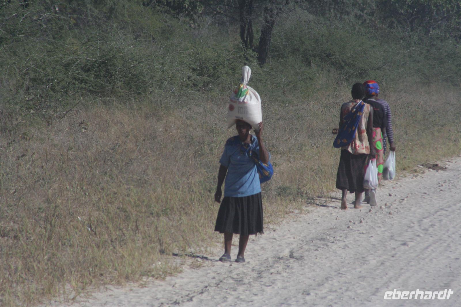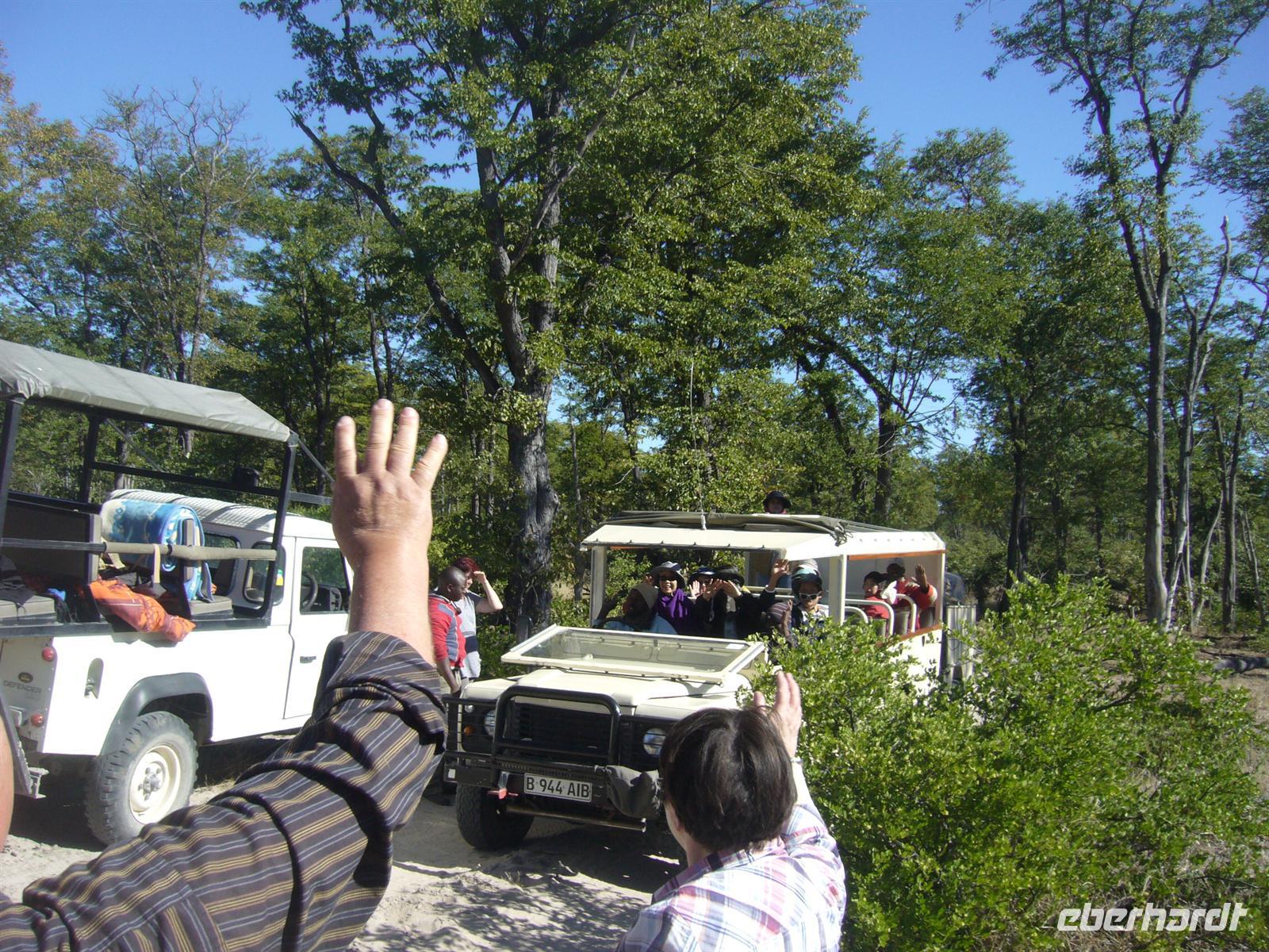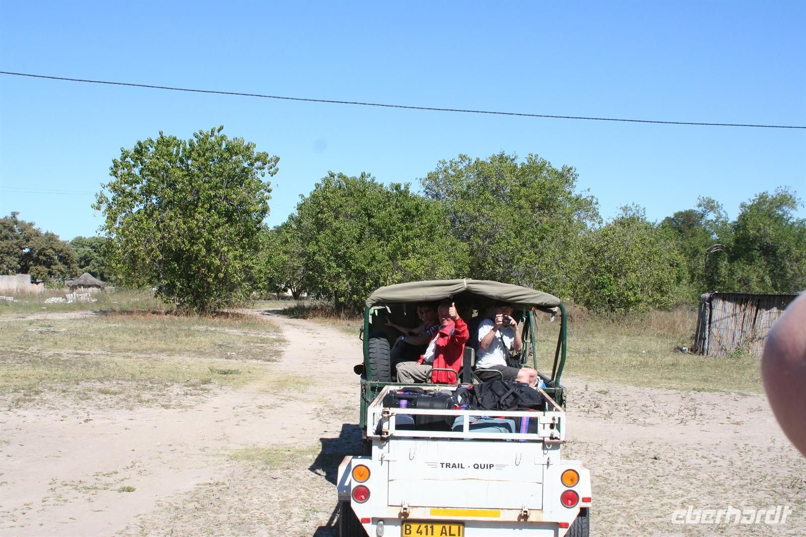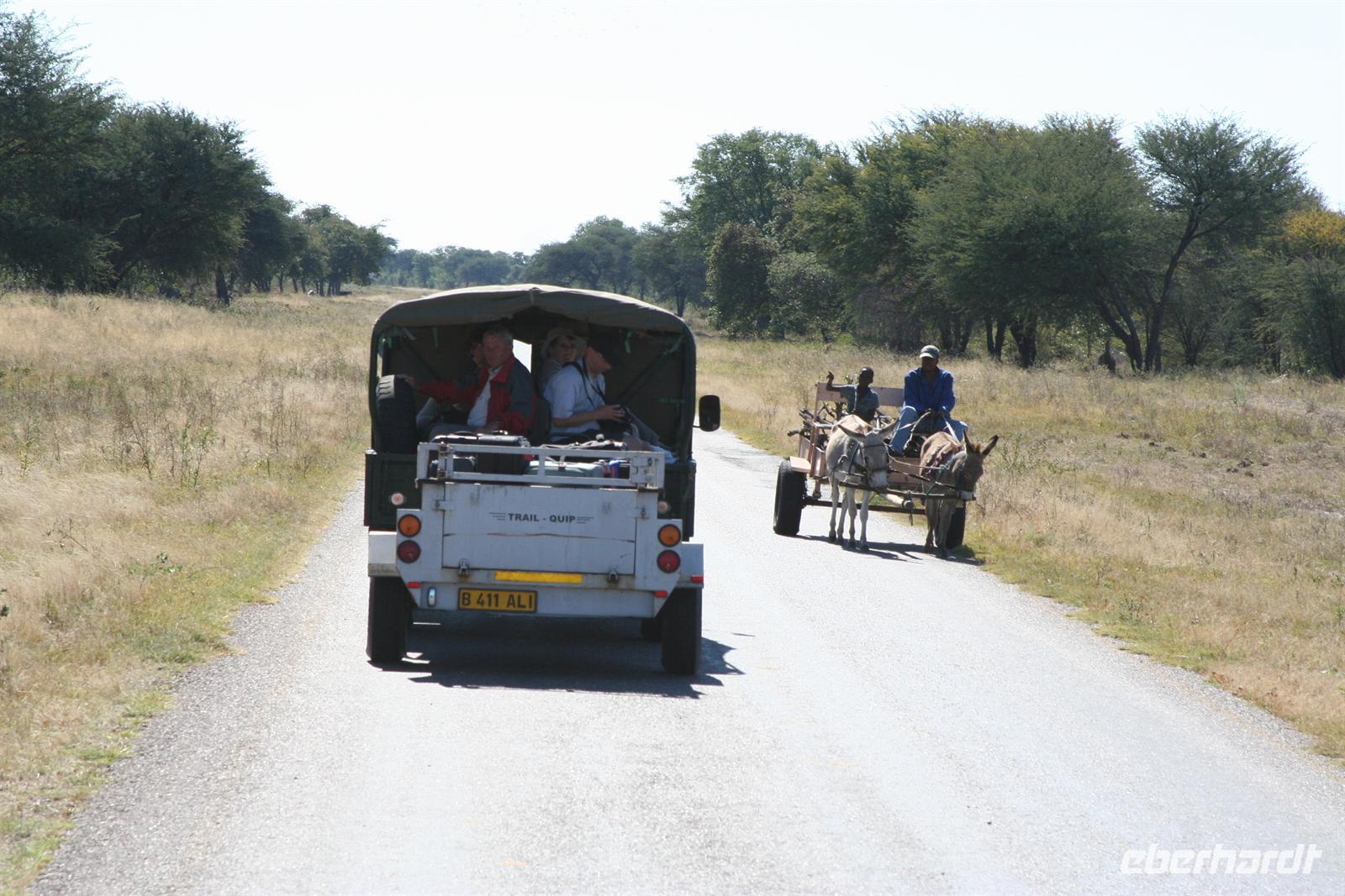 Mit Mokoros und kleinen Fahrzeugen gelangten wir zum Parkplatz unseres Busses in Etsha. Auf der weiteren Fahrt passierten wir wieder eine Veterinärschleuse und