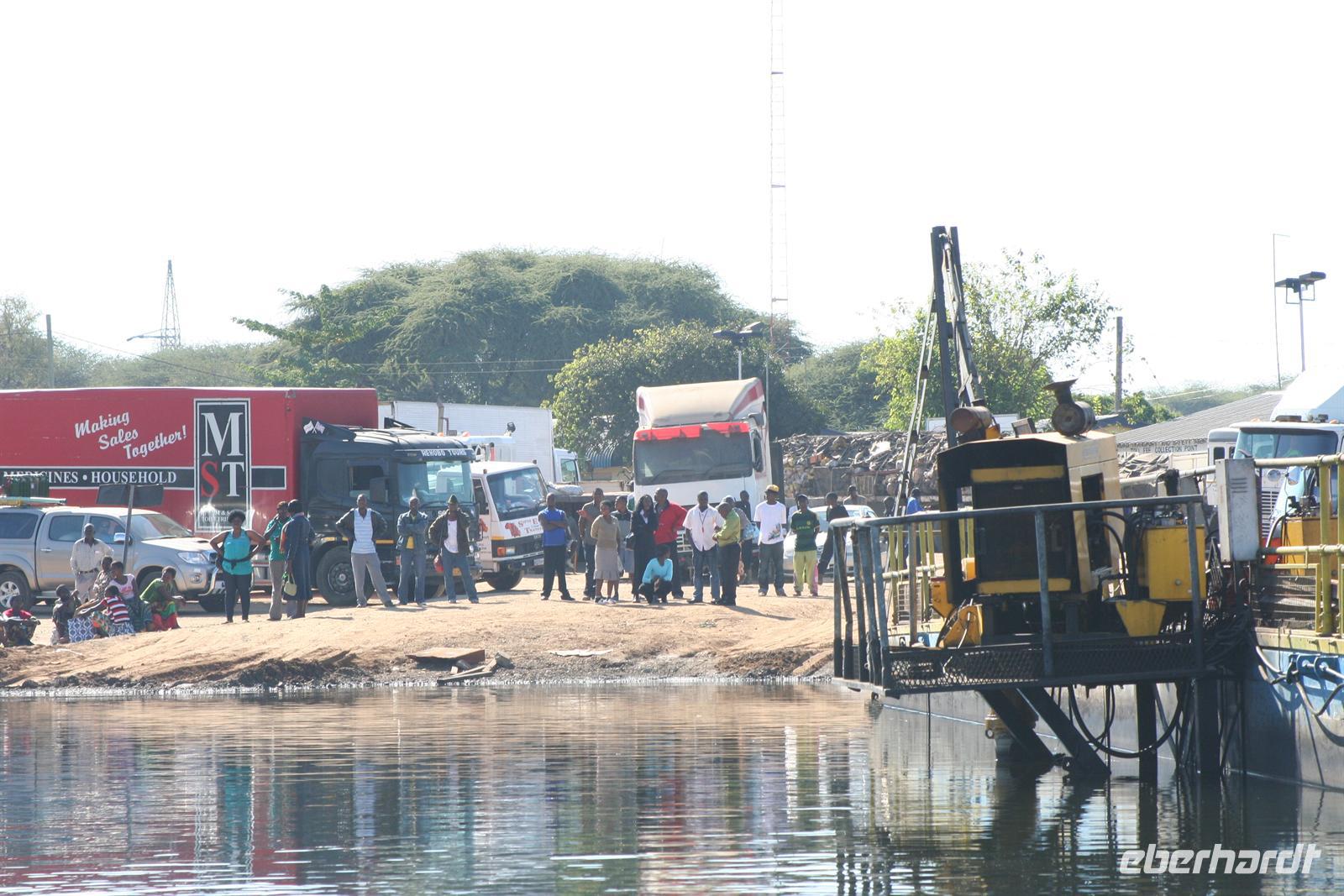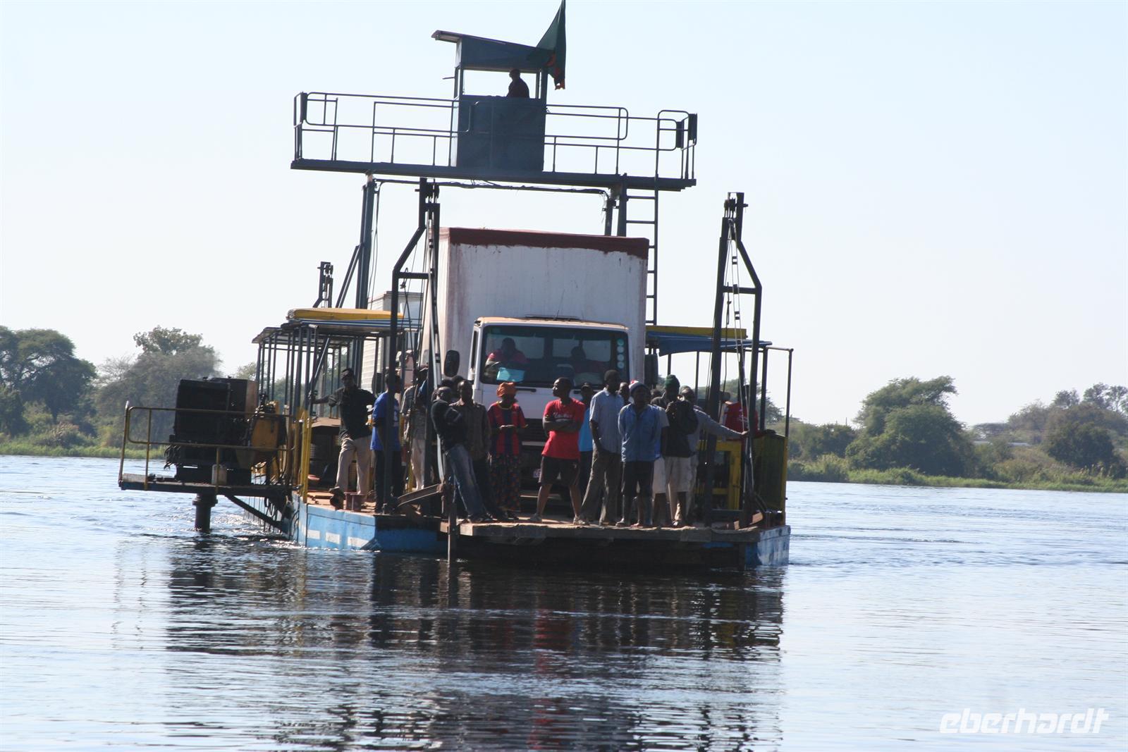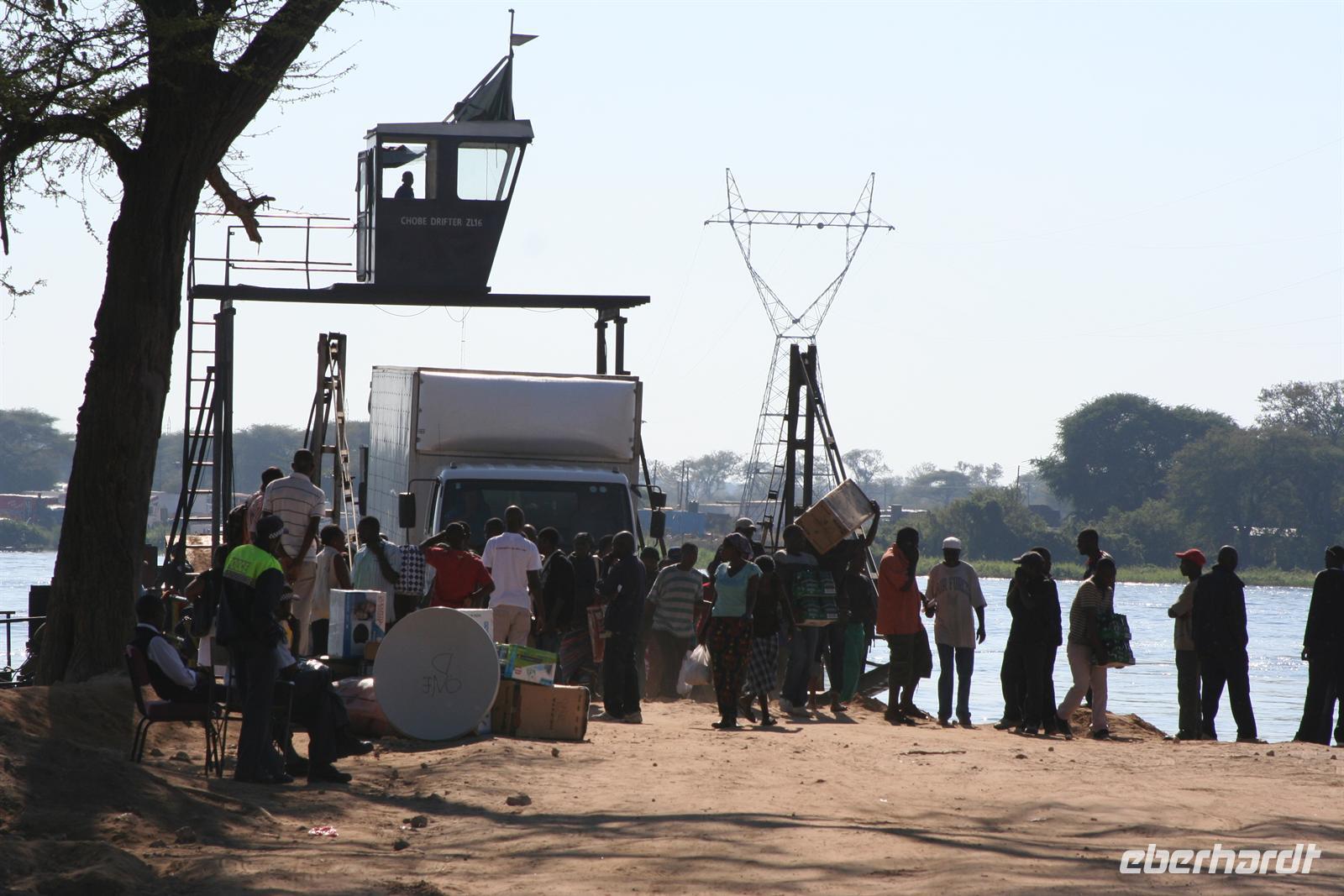 Ernst liess sich auch nicht Lumpen und sang uns eine Hymne auf sein Namibia - die kurze Fahrt war also äußerst musikalisch. Am Fluss angekommen stiegen wir aus unserem lieb gewonnenen Expeditionsfahrtzeug samt Gepäck aus, sagten Ernst Auf Wiedersehen und warteten, wie alle Touristen auf unser bestelltes Wassertaxi, welches uns über den Fluss nach Kazungula in Sambia brachte. In der Zwischenzeit beobachteten wir das bunte Treiben an der öffentlichen Fähre, die auch noch mit einfachsten Mitteln repariert werden mußte und waren froh, dieses Abenteuer nicht erleben zu müssen. Tom machte sich dann mit einem Teil der Gruppe, dem ganzen Gepäck und sämtlichen Pässen und der notwendigen Einreisegebühr (50 USD/Person hatte er vorher eingesammelt, um gleich für die ganze Gruppe die Formalitäten zu erledigen) mit dem ersten Boot davon.