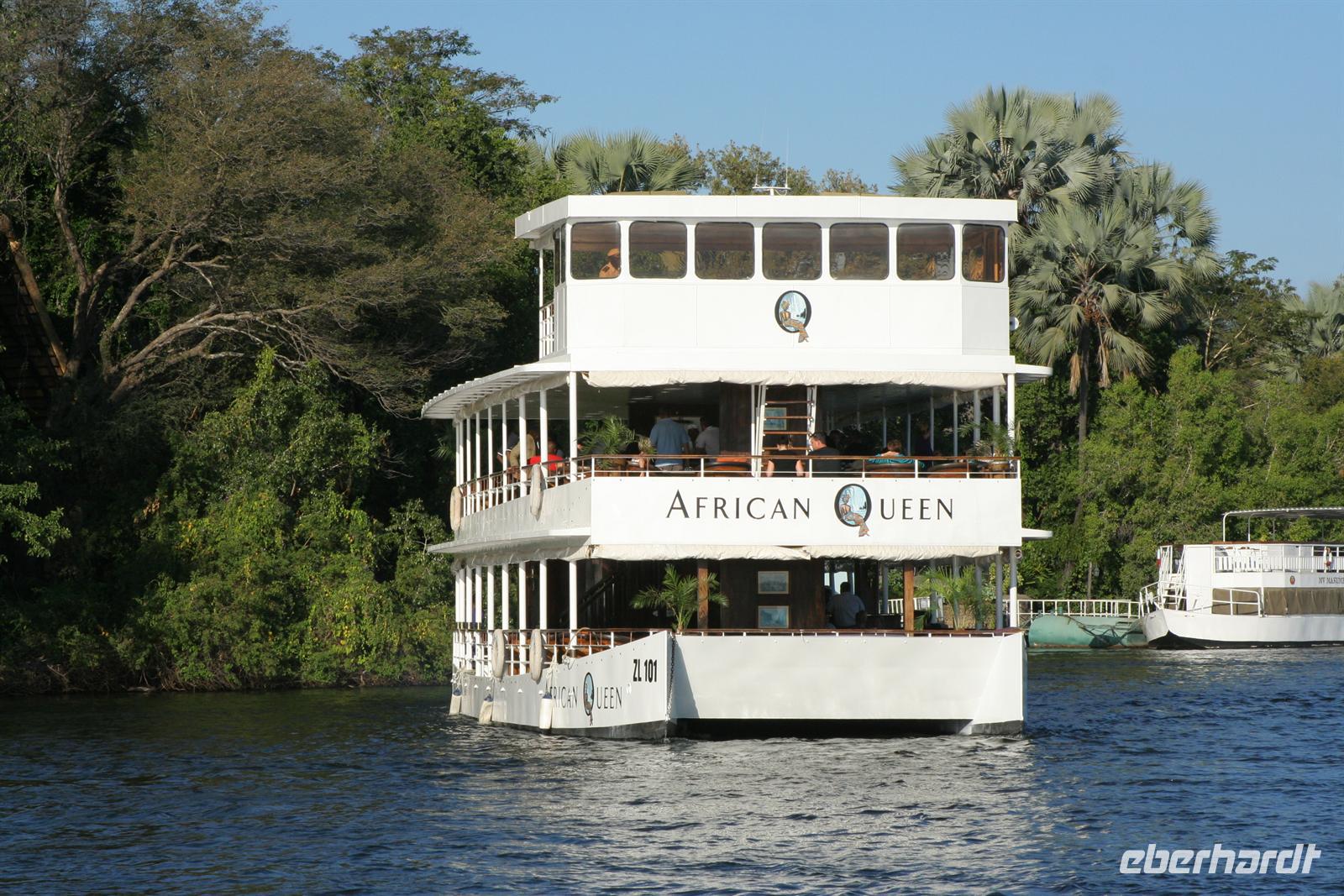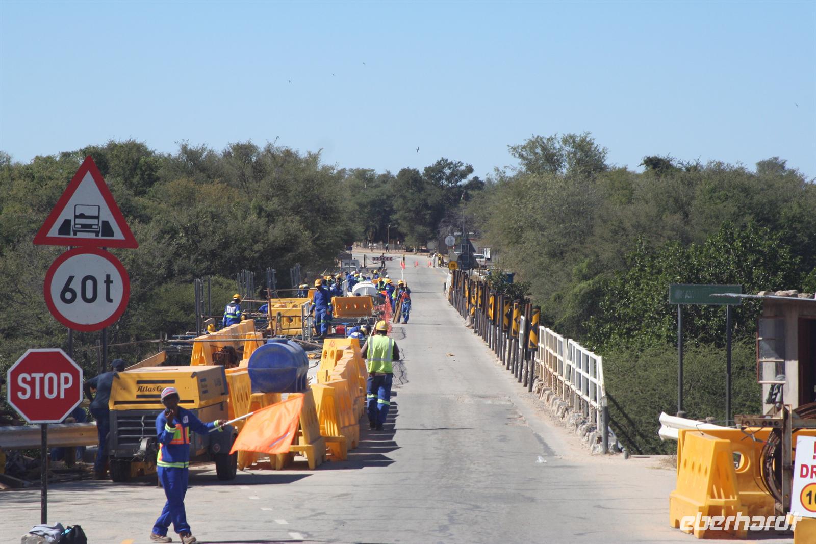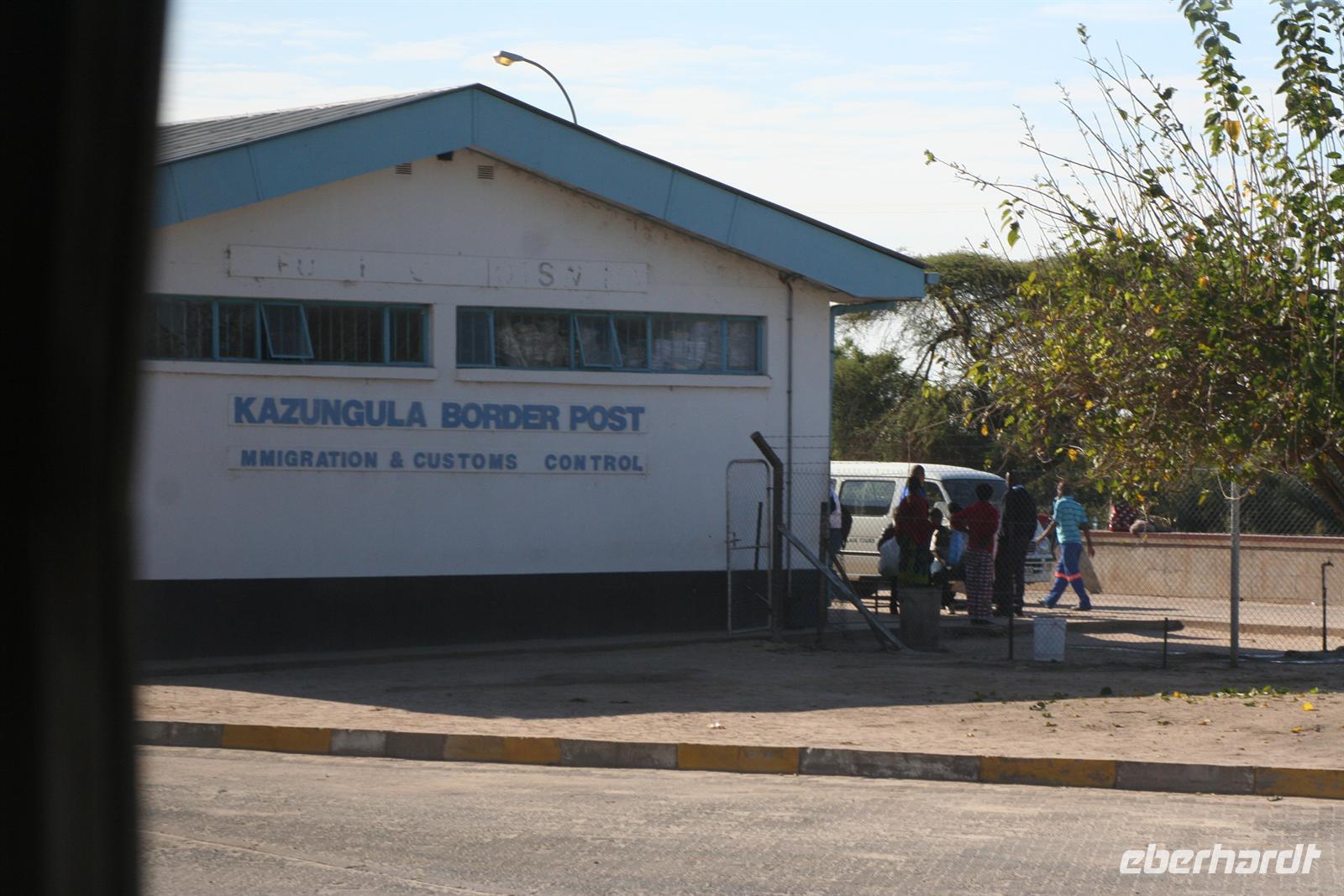 Ernst liess sich auch nicht Lumpen und sang uns eine Hymne auf sein Namibia - die kurze Fahrt war also äußerst musikalisch. Am Fluss angekommen stiegen wir aus unserem lieb gewonnenen Expeditionsfahrtzeug samt Gepäck aus, sagten Ernst Auf Wiedersehen und warteten, wie alle Touristen auf unser bestelltes Wassertaxi, welches uns über den Fluss nach Kazungula in Sambia brachte. In der Zwischenzeit beobachteten wir das bunte Treiben an der öffentlichen Fähre, die auch noch mit einfachsten Mitteln repariert werden mußte und waren froh, dieses Abenteuer nicht erleben zu müssen. Tom machte sich dann mit einem Teil der Gruppe, dem ganzen Gepäck und sämtlichen Pässen und der notwendigen Einreisegebühr (50 USD/Person hatte er vorher eingesammelt, um gleich für die ganze Gruppe die Formalitäten zu erledigen) mit dem ersten Boot davon.