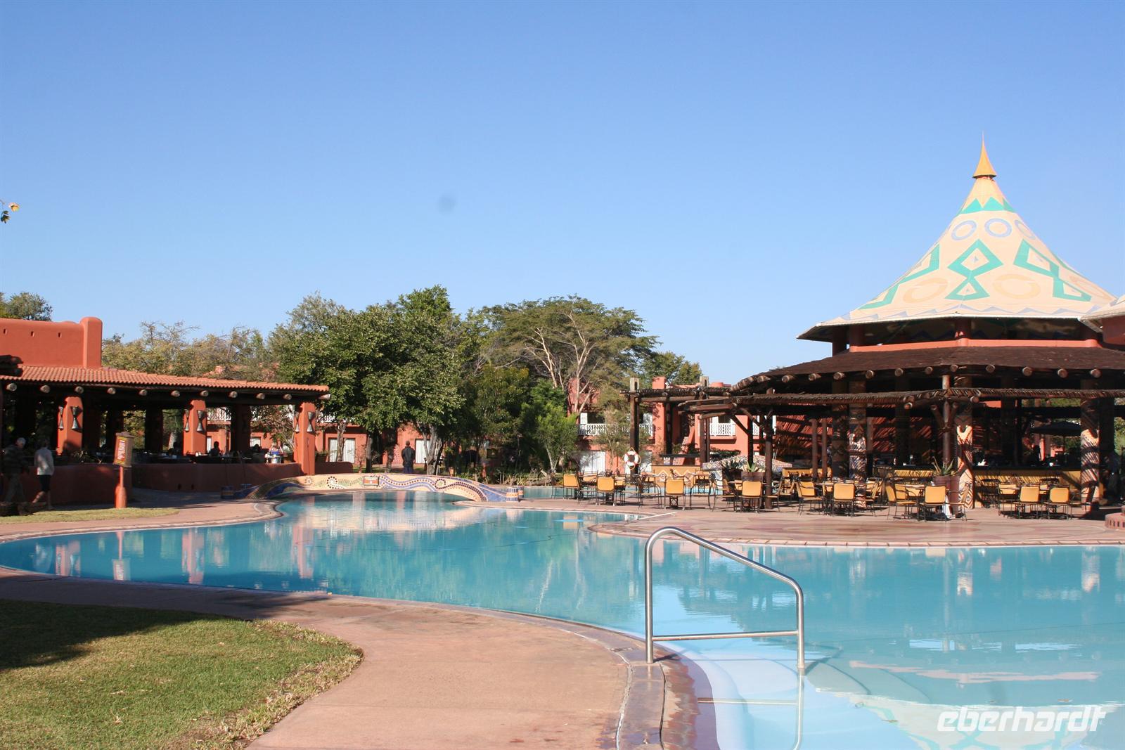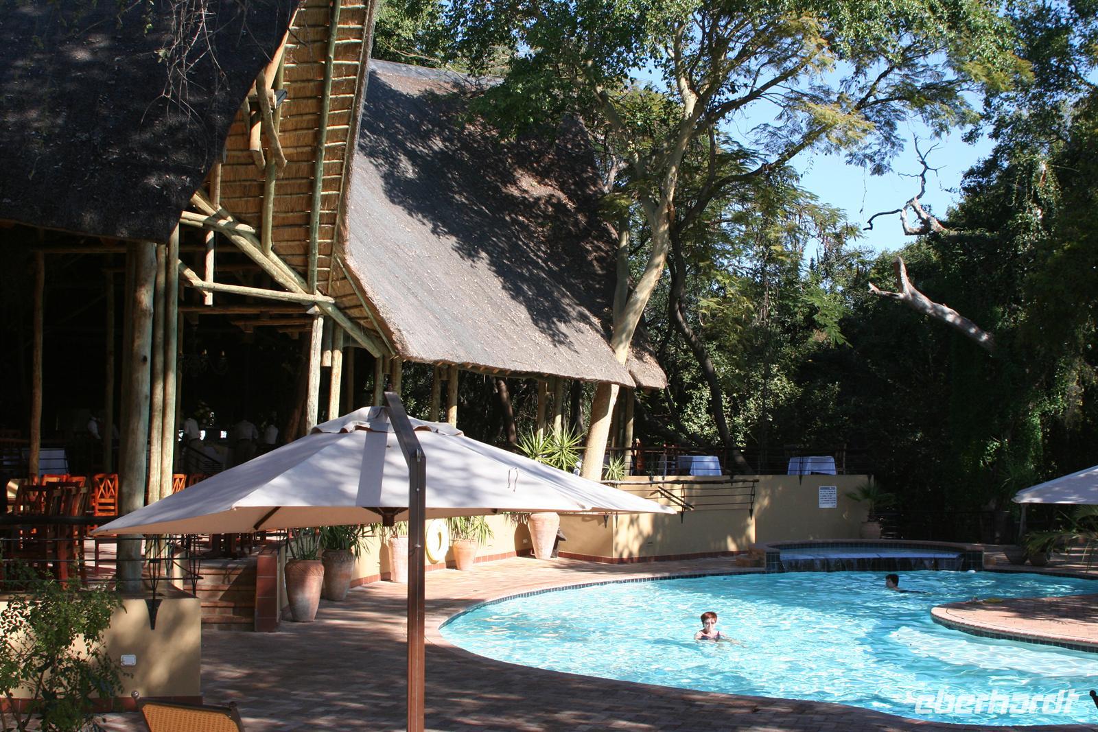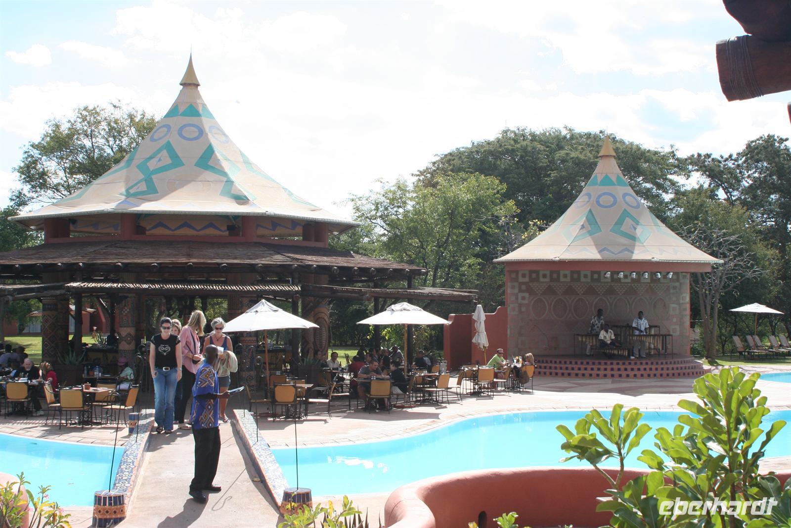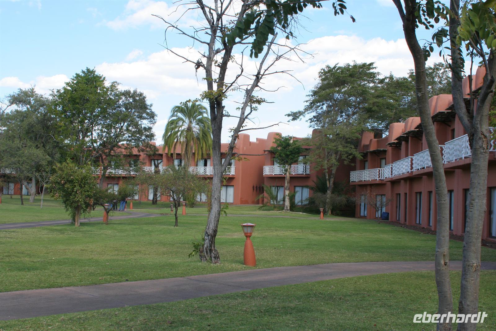 Im Sambesi Sun Resort, welches einen direkten Zugang zu den Wasserfällen (inklusive) hat, wurden wir mit Trommelwirbel, afrikanischen Tänzen und einem Fruchtcocktail begrüßt. Nach dem wir unsere modernen Zimmer mit Balkon oder Terrasse in der weitläufigen, gepflegten Anlage bezogen hatten, erkundeten wir die Umgebung: Poolanlage, Restaurants, Shops, Bar und ein Park, in dem sich Giraffen und Zebras tummelten, außerhalb des bewachten Geländes spazierten auch Elefanten!