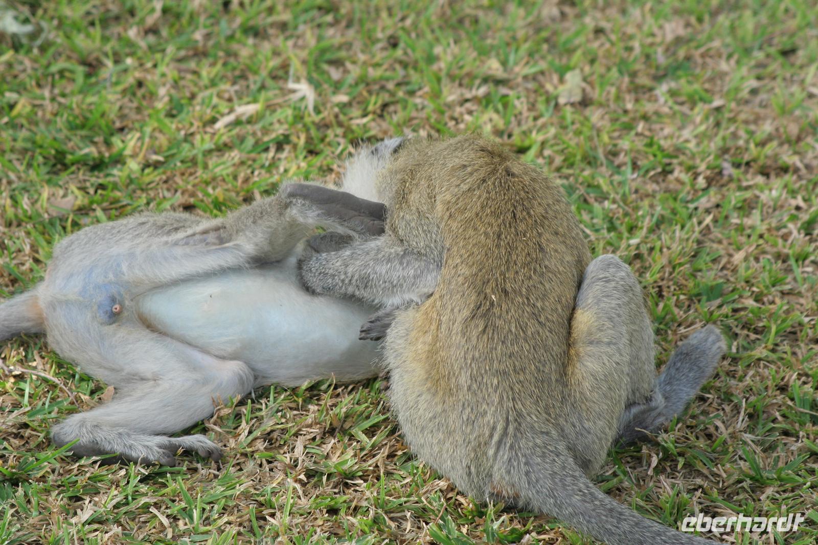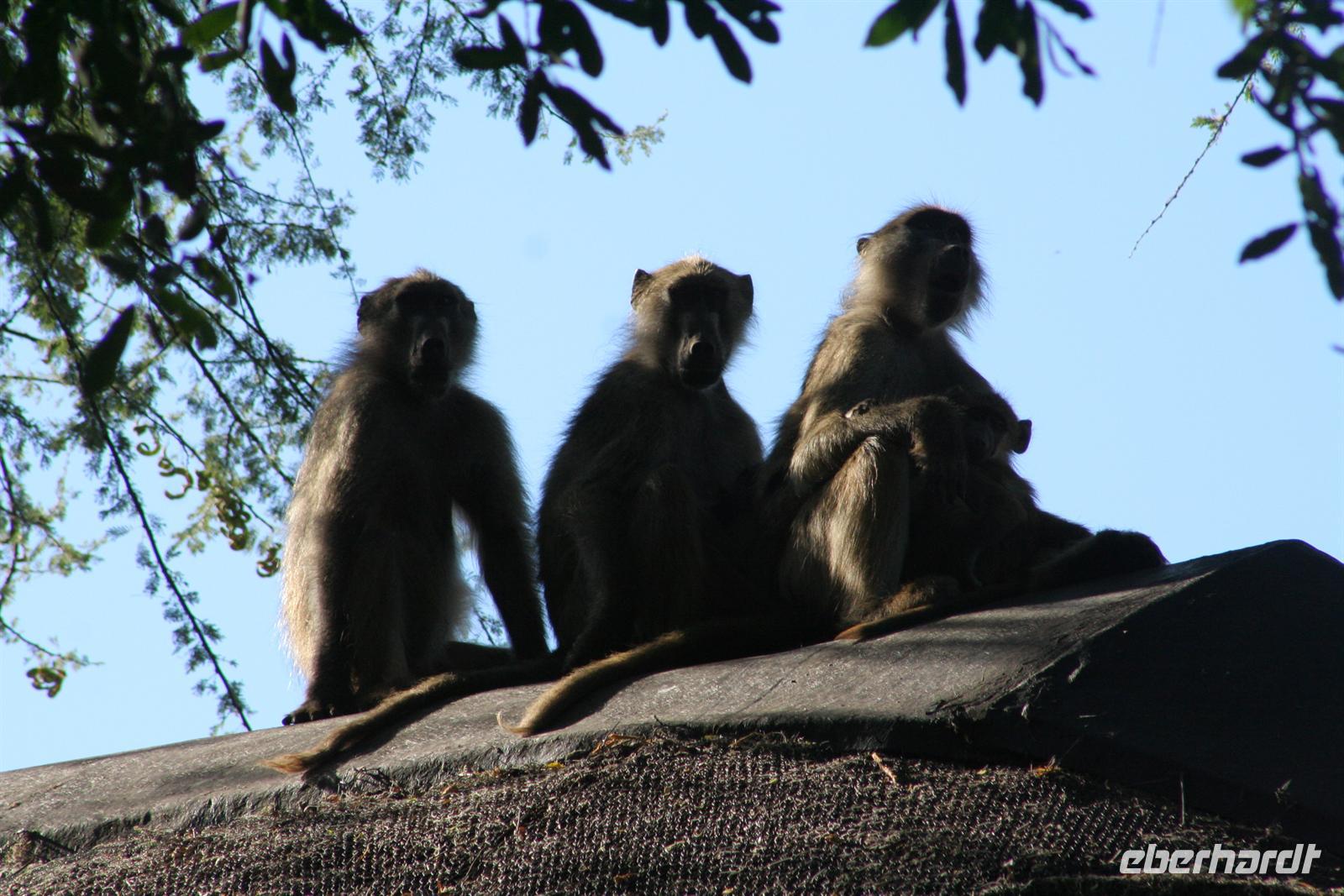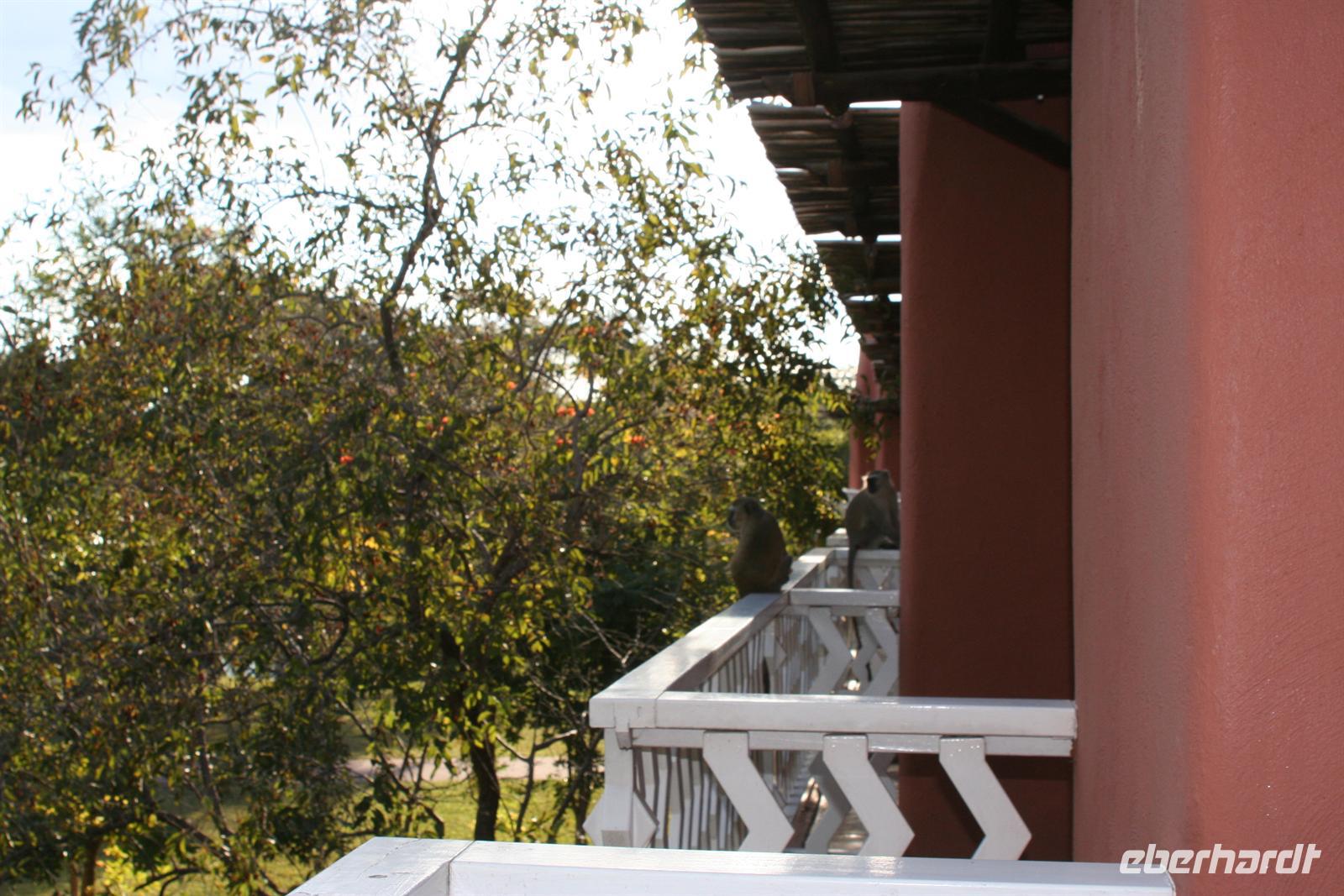 Als ich in meinem Zimmer die Papiere für den Rückflug sortierte, bekam ich ungebetenen, affigen Besuch, der sich, Gott sei Dank, nur ein Stück Zucker stiebitze! (Die offenen Terrassentüren sollten immer im Auge behalten werden bzw. geschlossen sein, wenn man sein Zimmer verlässt!). Einige Gäste unternahmen am Nachmittag noch einen Extra-Ausflug. Von den "Löwenbändigern" wurden sie am Hotel abgeholt und zum einem geschützen, privaten Park gefahren, um dort mit jungen Löwen "Gassi" zu gehen (natürlich unter fachkundiger Führung). Gespannt hörten wir anschließend die abenteurlichen Erlebnisberichte. Für das Abendessen hatten wir bereits vorab Plätze im a la carte Restaurant reserviert. Beim gemütlichen Abendessen liessen wir die Reise noch einmal gedanklich und in Worten an uns vorüber ziehen und ergänzten mit Tom unsere, bereits während der Tour geschmiedeten Reisepläne für ein neues Afrika-Abenteuer. Die letzte Flasche Amarula wurde geleert und der Abend an unserem Lieblingstisch an der Poolbar fortgesetzt.