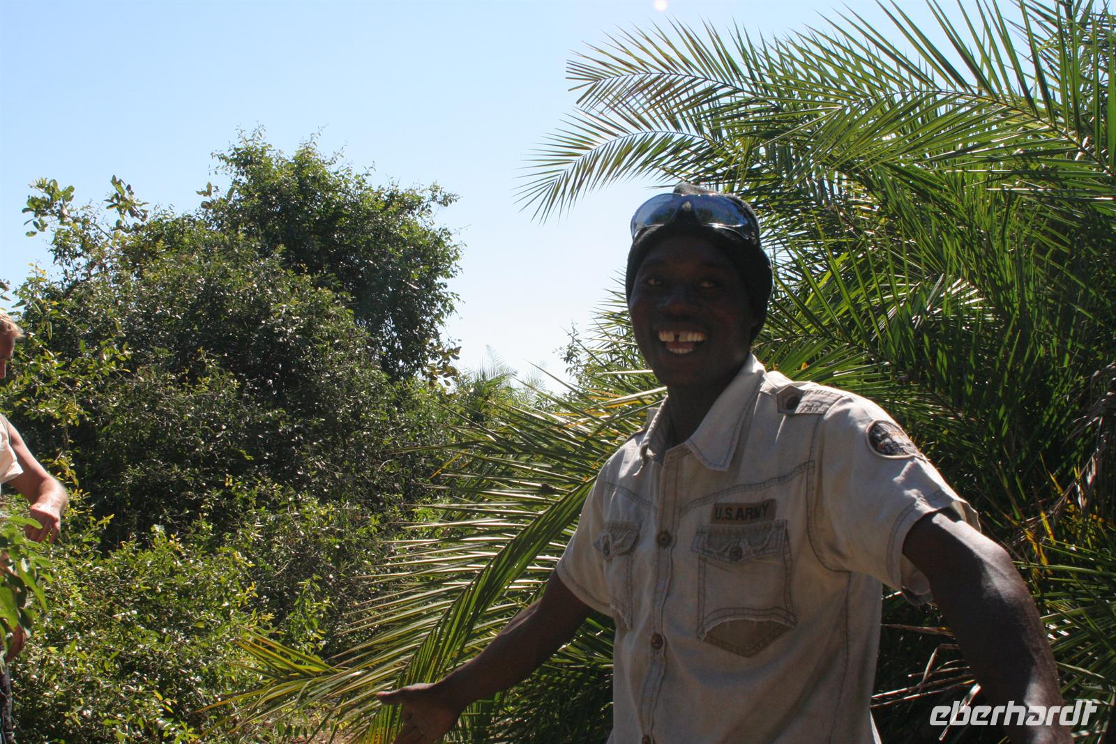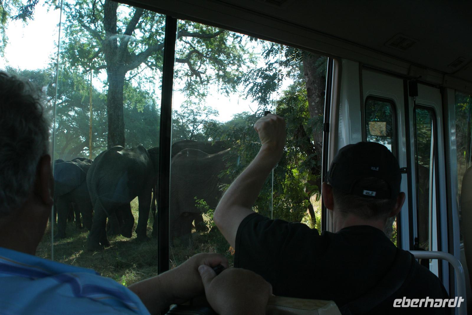 Ernst war heute unser Ehrengast und durfte bei uns hinten im Bus Platz nehmen, während Tom am Steuer saß und uns zum Sambesi, der Botswana von Sambia trennt, fuhr. Mit einem Ständchen bedankten wir uns bei Ernst, unserem Fahrer.