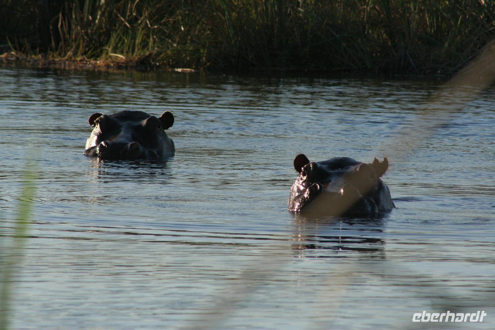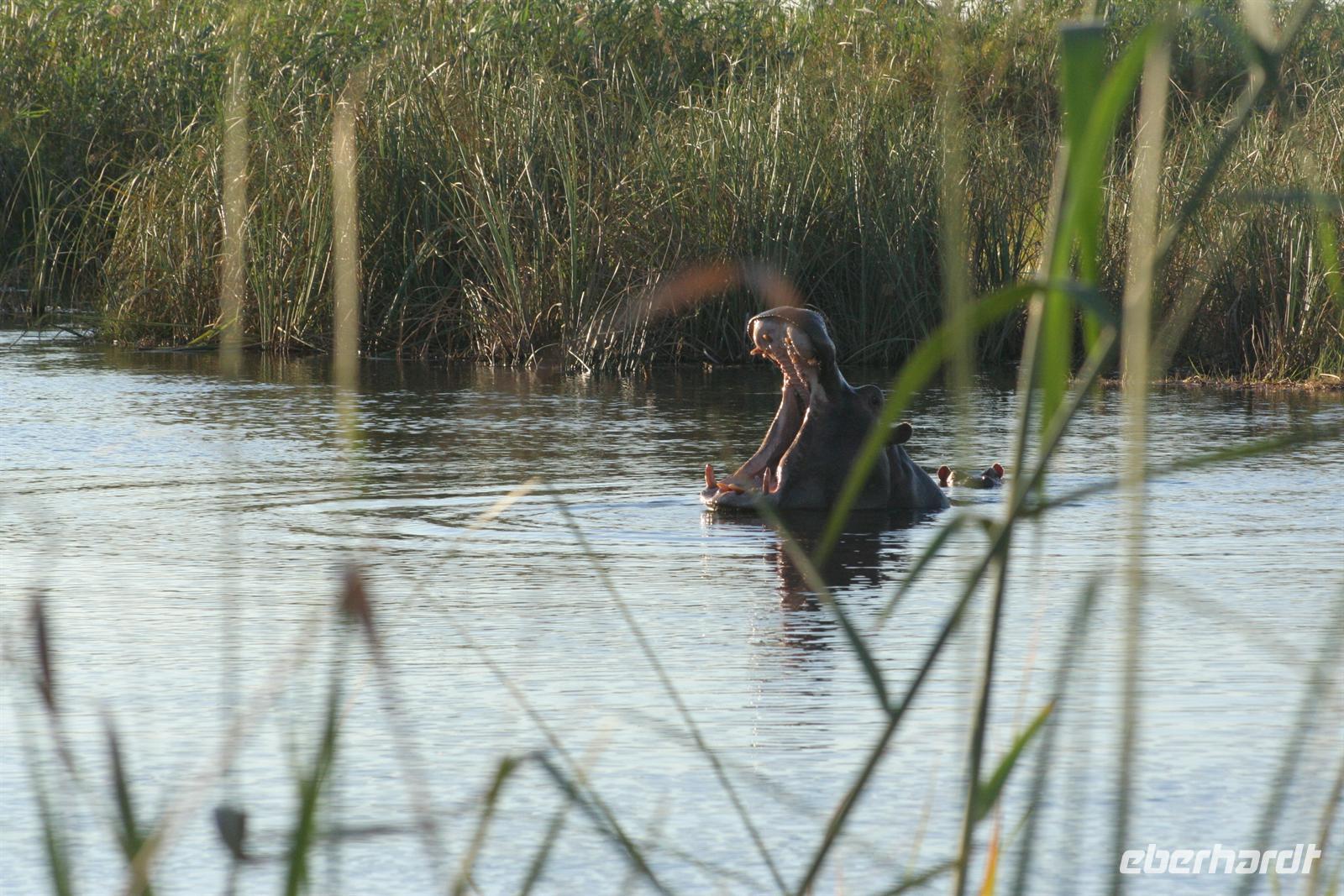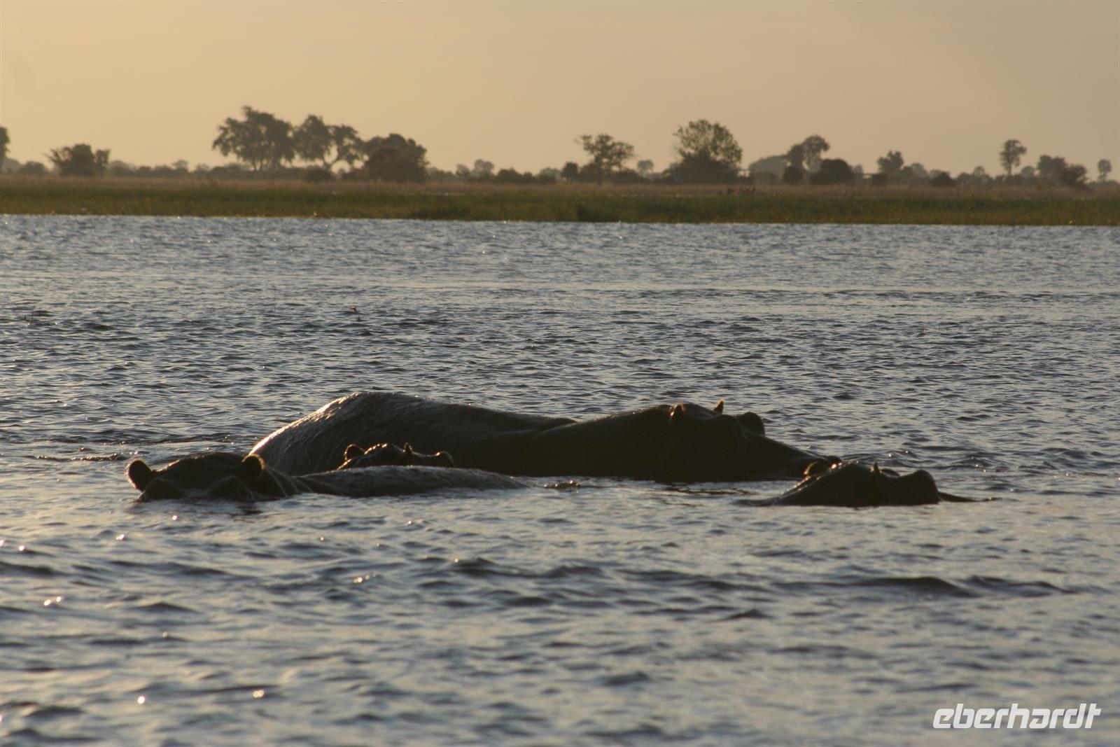 Die Bootsführer entdeckten den Schatten eines "Hippos" im Wasser. Nach dem das erste Boot diese Stelle schnell überfahren hatte, auch wir im 2. Boot wollten hinterher. Doch rums und plumps sprang ein Flusspferd, direkt vor uns und keine 3 m, aus dem Schilf ins Wasser und landete fast auf dem Schoss von Gisela. Genauso so schnell wie das Hippo gekommen, tauchte es auch wieder ab. Es dauerte eine kleine Weile, bevor wir uns von dem Schreck erholten. Nach diesem Erlebnis beobachten wir noch aufmerksamer die Umgebung. Unsere Bootsführer führten uns zu einem "Hippo-Pool", in dem am späten Nachmittag eine Flusspferdfamilie täglich ihrer Körperhygenie nachging. Als wir ankamen, war das "Bad" schon in vollem Gange. Wer nun wem beobachtete, das wissen wir nicht genau. Es war jedenfalls ein herrliches Schauspiel für uns alle. Danach gingen wir an Land, einige spielten Fussball mit "Elefantenknödeln" und andere bastelten Ketten aus Wasserlilien. Bei dieser Tour gehörte natürlich der "Sundowner" dazu.