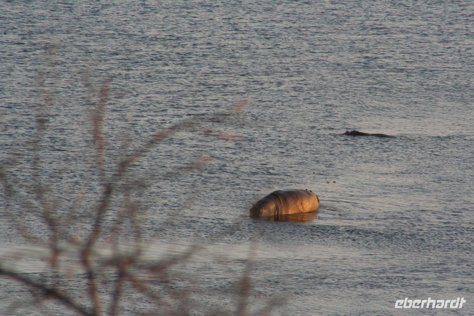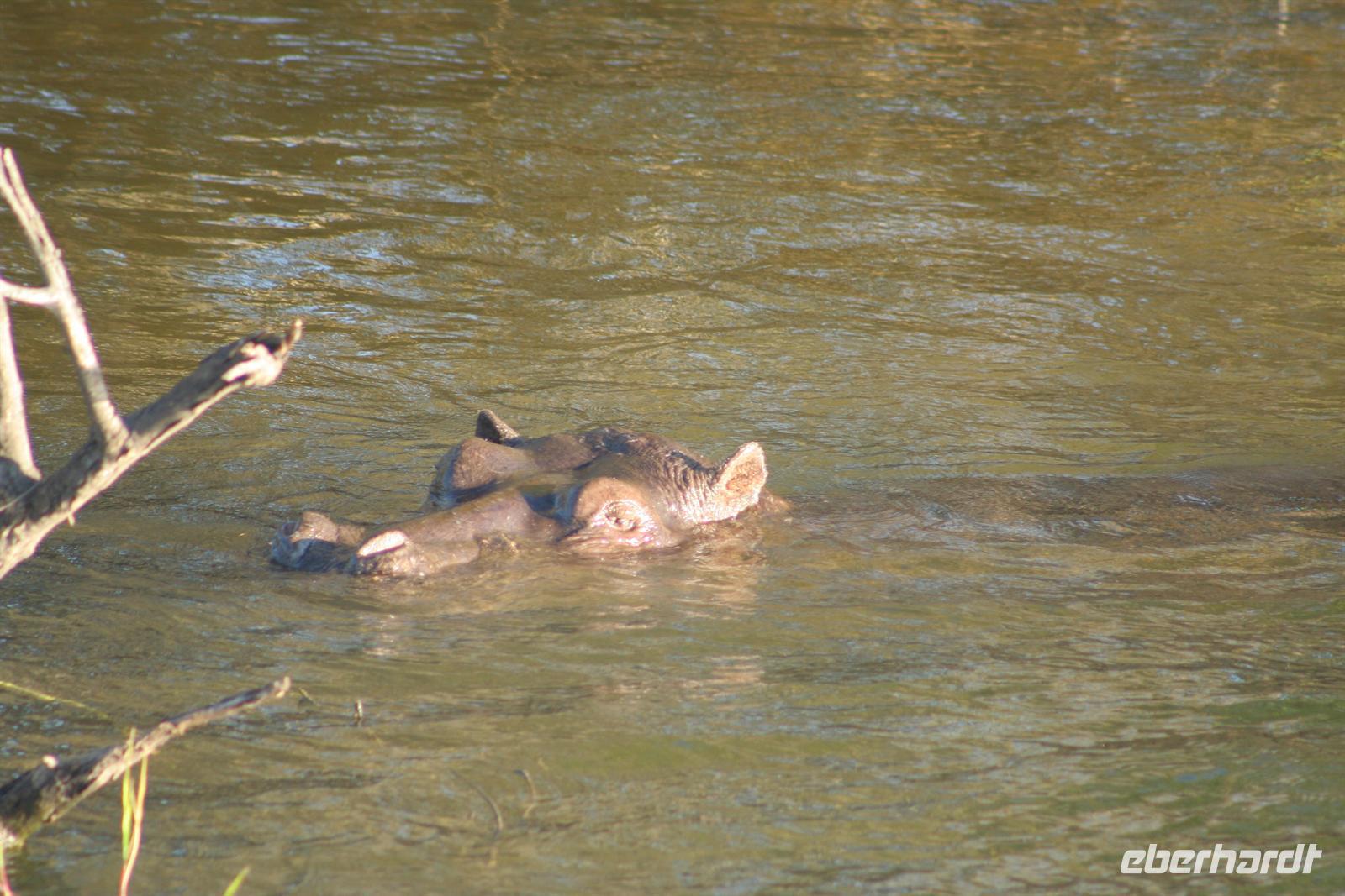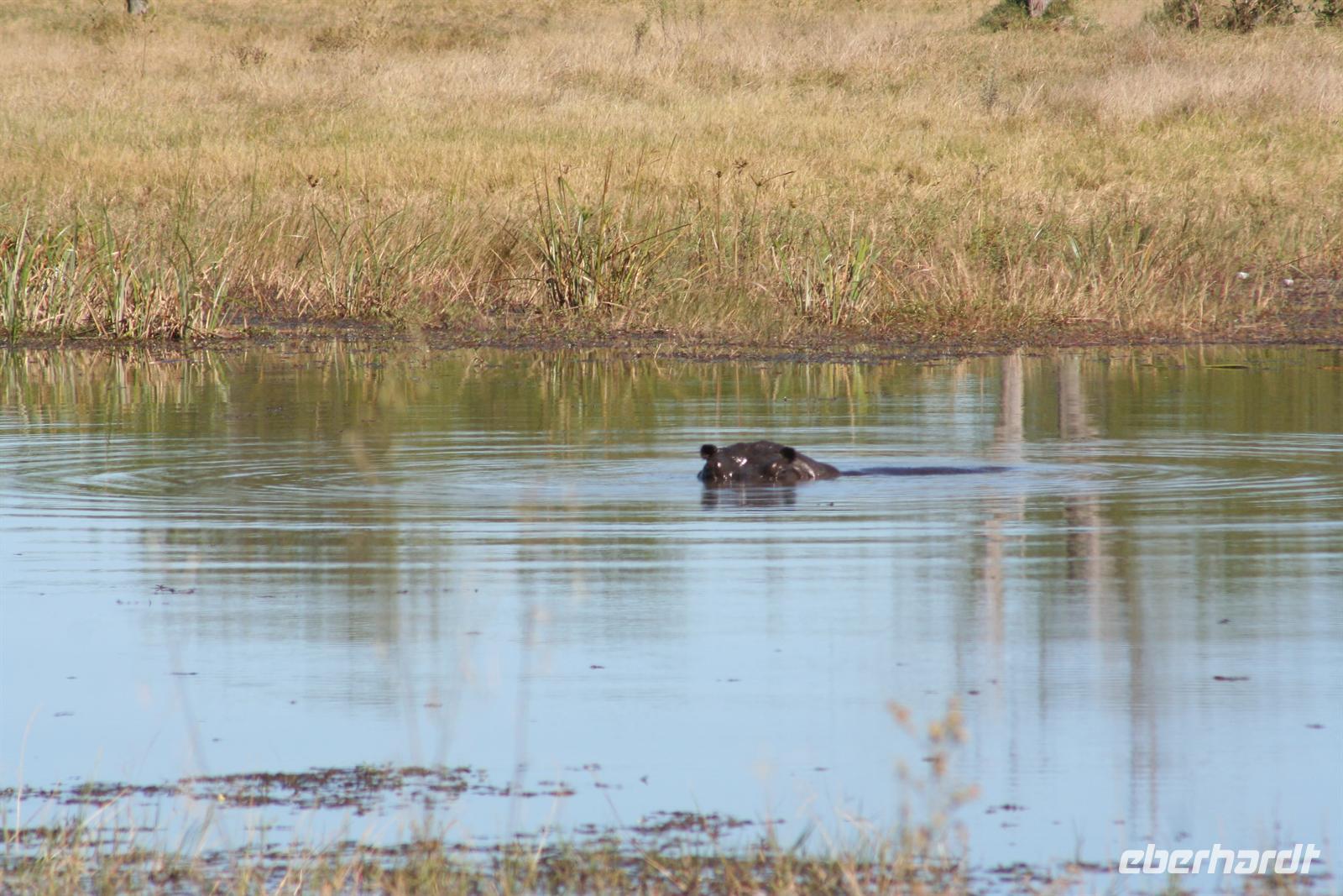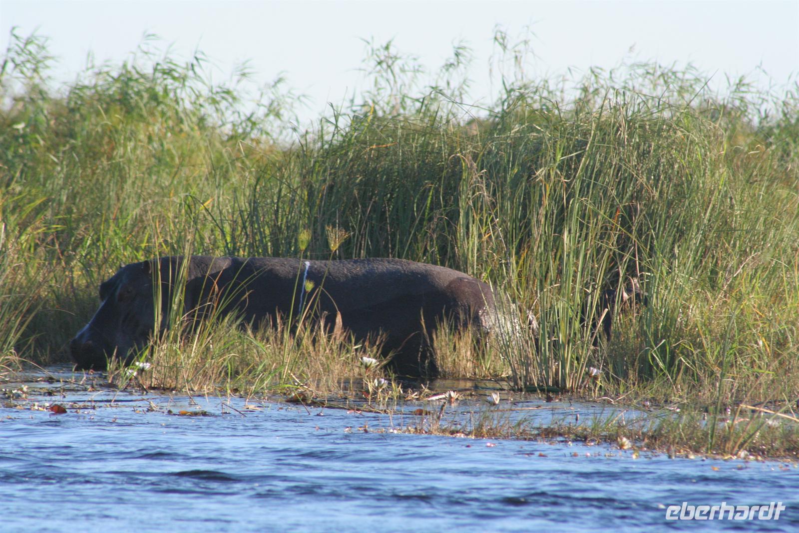 Die Bootsführer entdeckten den Schatten eines "Hippos" im Wasser. Nach dem das erste Boot diese Stelle schnell überfahren hatte, auch wir im 2. Boot wollten hinterher. Doch rums und plumps sprang ein Flusspferd, direkt vor uns und keine 3 m, aus dem Schilf ins Wasser und landete fast auf dem Schoss von Gisela. Genauso so schnell wie das Hippo gekommen, tauchte es auch wieder ab. Es dauerte eine kleine Weile, bevor wir uns von dem Schreck erholten. Nach diesem Erlebnis beobachten wir noch aufmerksamer die Umgebung. Unsere Bootsführer führten uns zu einem "Hippo-Pool", in dem am späten Nachmittag eine Flusspferdfamilie täglich ihrer Körperhygenie nachging. Als wir ankamen, war das "Bad" schon in vollem Gange. Wer nun wem beobachtete, das wissen wir nicht genau. Es war jedenfalls ein herrliches Schauspiel für uns alle. Danach gingen wir an Land, einige spielten Fussball mit "Elefantenknödeln" und andere bastelten Ketten aus Wasserlilien. Bei dieser Tour gehörte natürlich der "Sundowner" dazu.