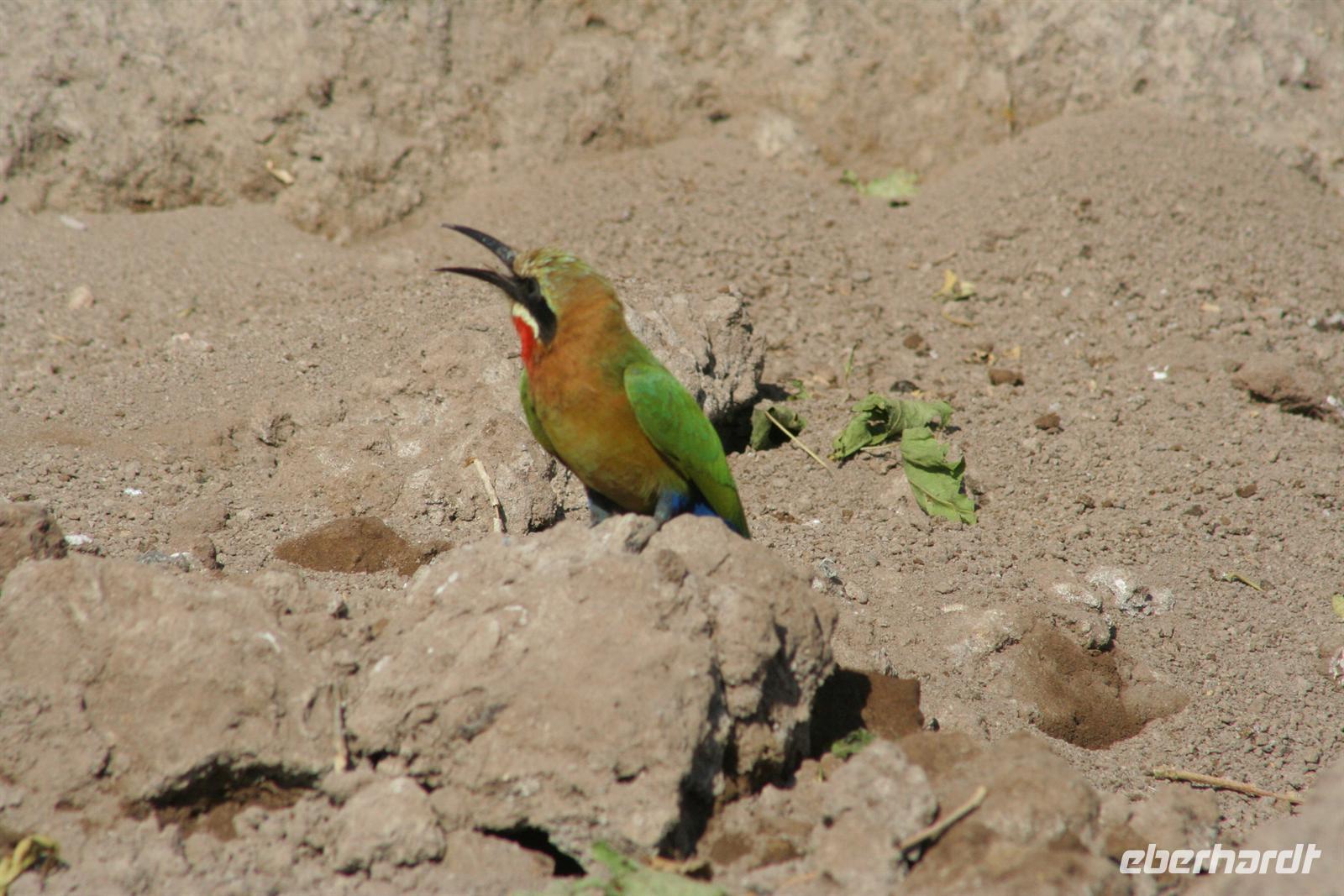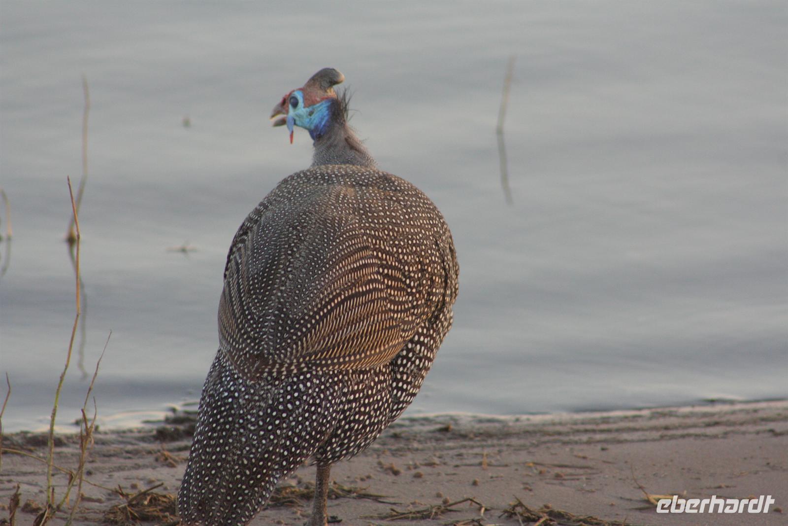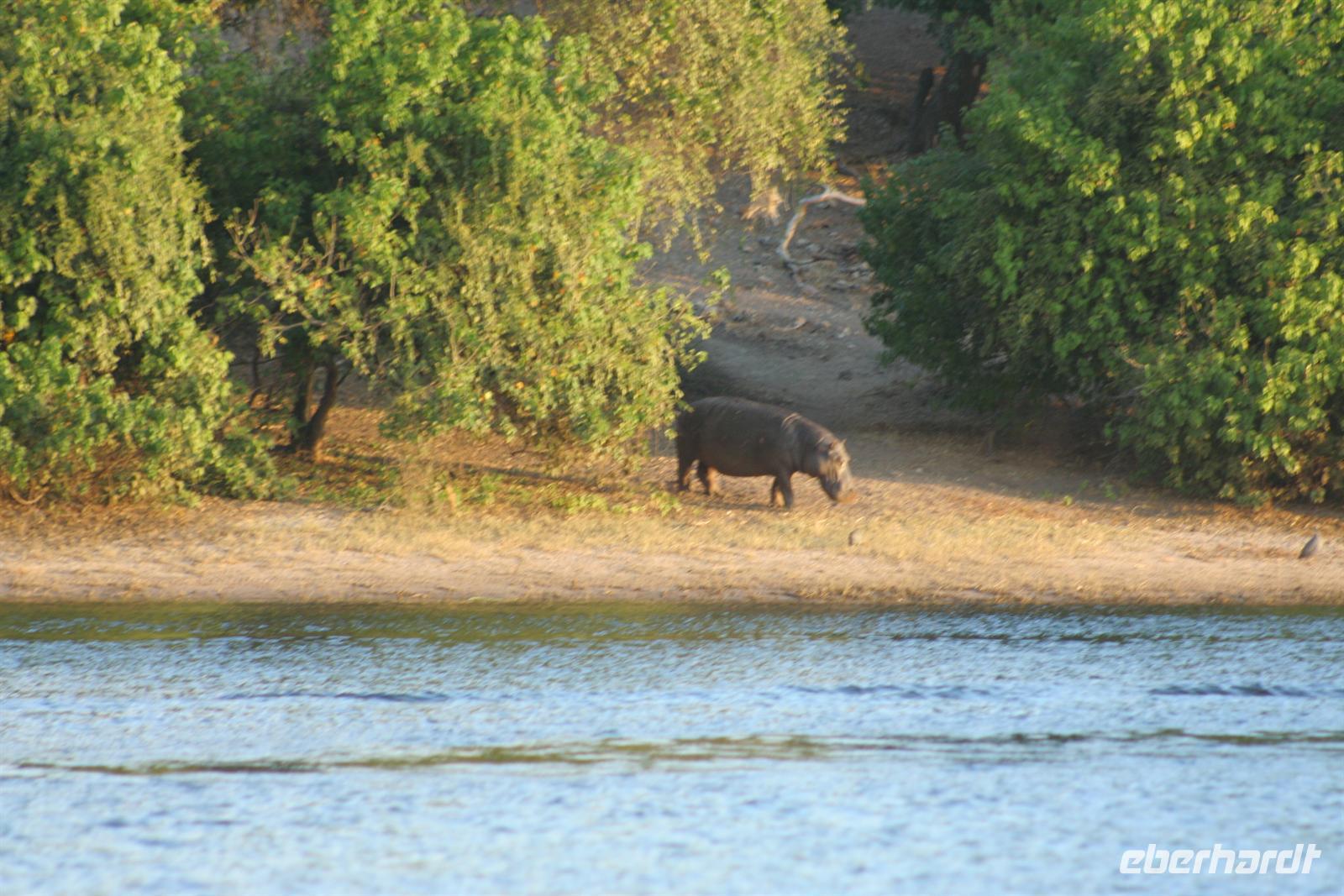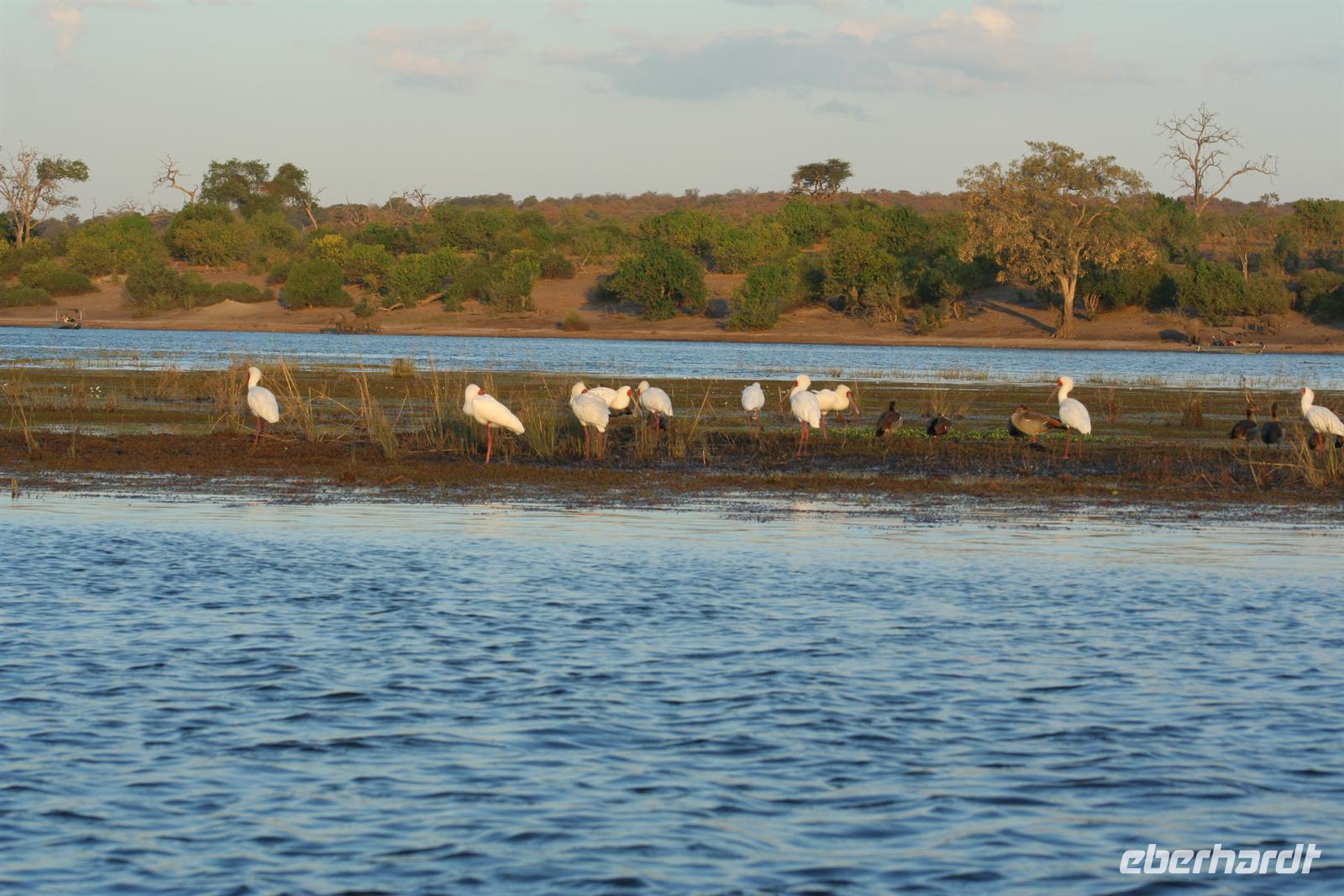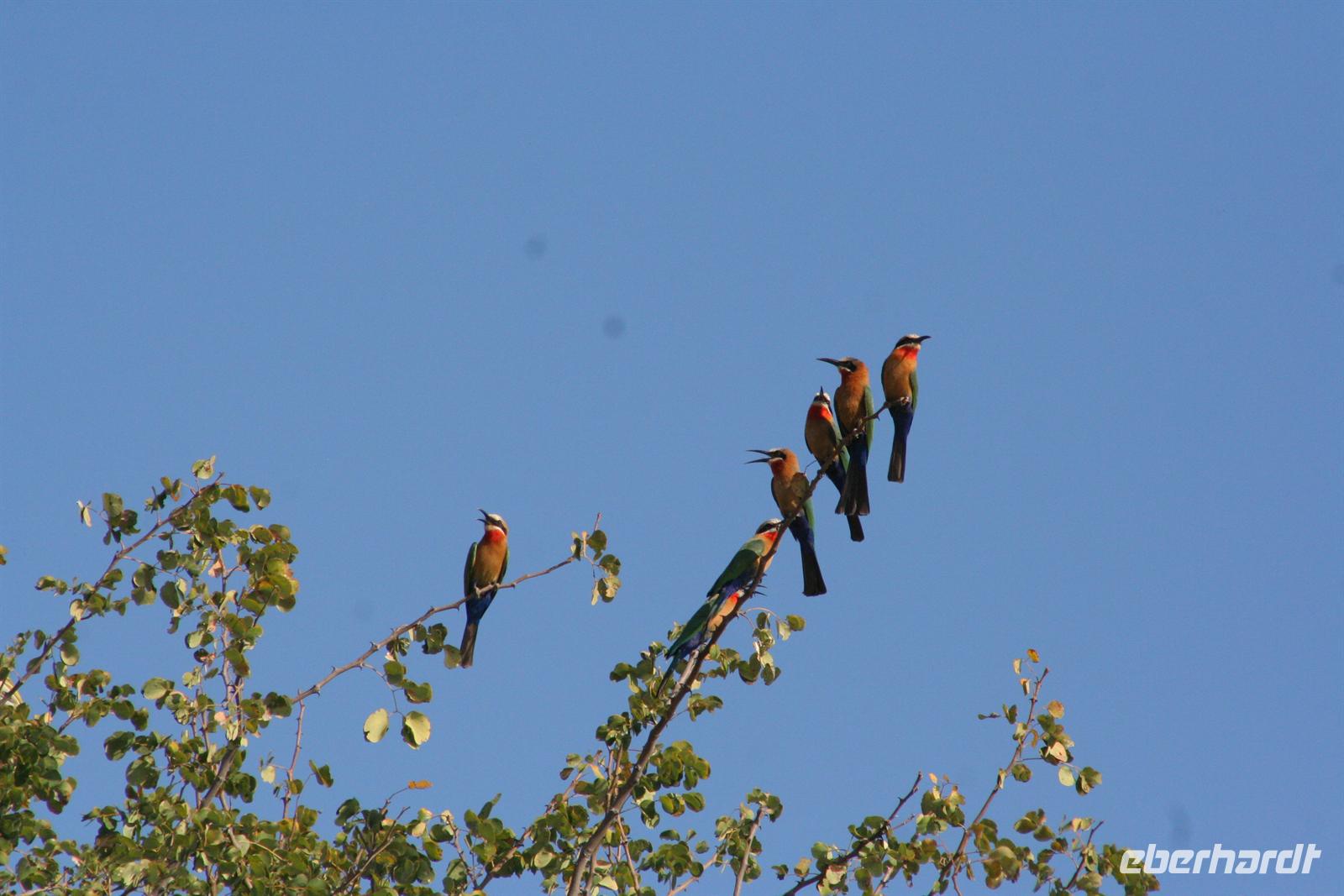 Bald darauf gesellten sich, etwas abseits, Flusspferde und Krokodile dazu. Perlhühner kreiselten durch die Gegend und machten einen Höllenlärm. Zurück im dichten Park pirschten wir weiter und sahen Giraffen, einen seltenen Honigdachs, eine riesige Büffelherde, Schakale, Elands, Wasserböcke, Impalas, Paviane, Zebras und eine Horde Geier, die sich an dem, was Familie Löwe in der Nacht übrig gelassen hatten, fast die kahlen Köpfe einschlugen. Die Zeit verging wie im Flug, fast 4 h waren wir nun schon auf Safari! Das Frühstück musste auf uns warten, aber kein Problem in der Lodge (die wissen, dass die Frühpirschler immer später kommen). Alles war noch ausreichend da und so machten wir aus dem eigentlichen Frühstück einen ausgiebigen Brunch. Über die heiße Mittagszeit war relaxen angesagt. Einige bummelten mit mir durch Kasane (eigentlich nur die Hauptstraße hoch und wieder runter/mehr gibt es nicht), stöberten in kleinen Geschäften und im Supermarkt und besuchten spontan das Krankenhaus von Kasane. Am Nachmittag gings dann mit dem Boot auf Pirschfahrt. Das hatte uns Tom schon besonders schmackhaft gemacht, aber wir glaubten, dass die bisherigen Erlebnisse nicht mehr gesteigert werden können. Da waren wir alle samt im Irrglauben. Mit unserem Boot (nur für unsere Gruppe) und kühlen Getränken an Bord schipperten wir gemütlich auf dem Chobe am Ufer entlang. Die beste Kulisse bot sich wirklich vom Wasser aus. Ganz nah beobacheten wir Bienenfresser