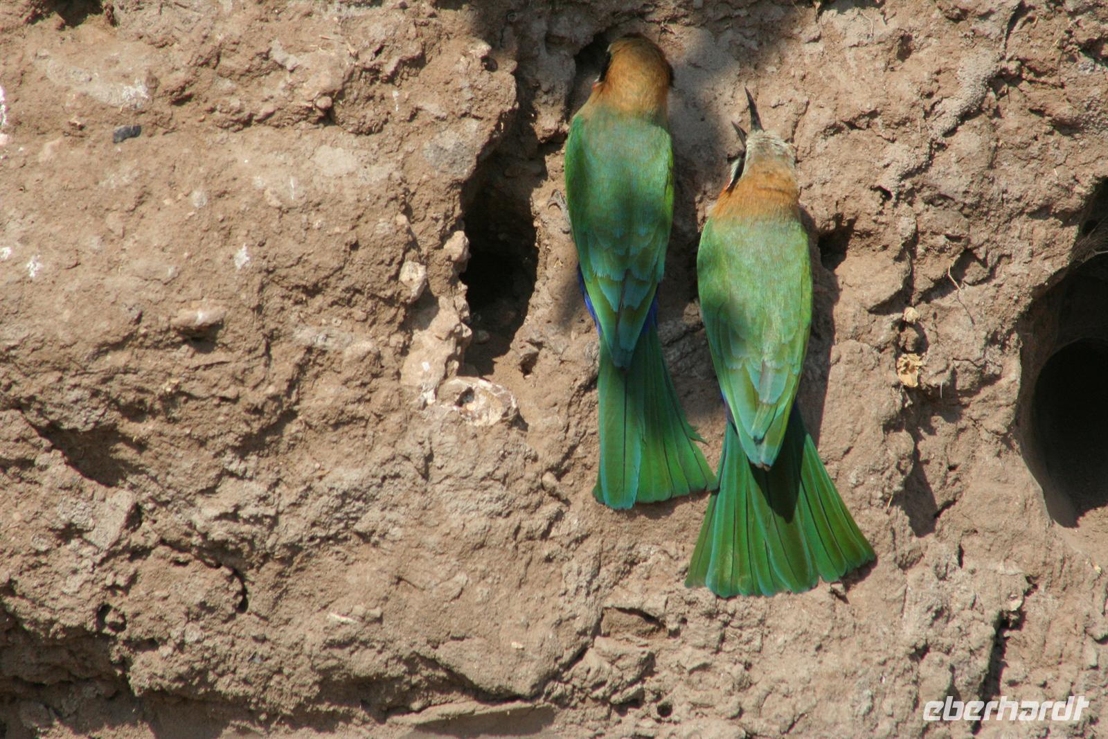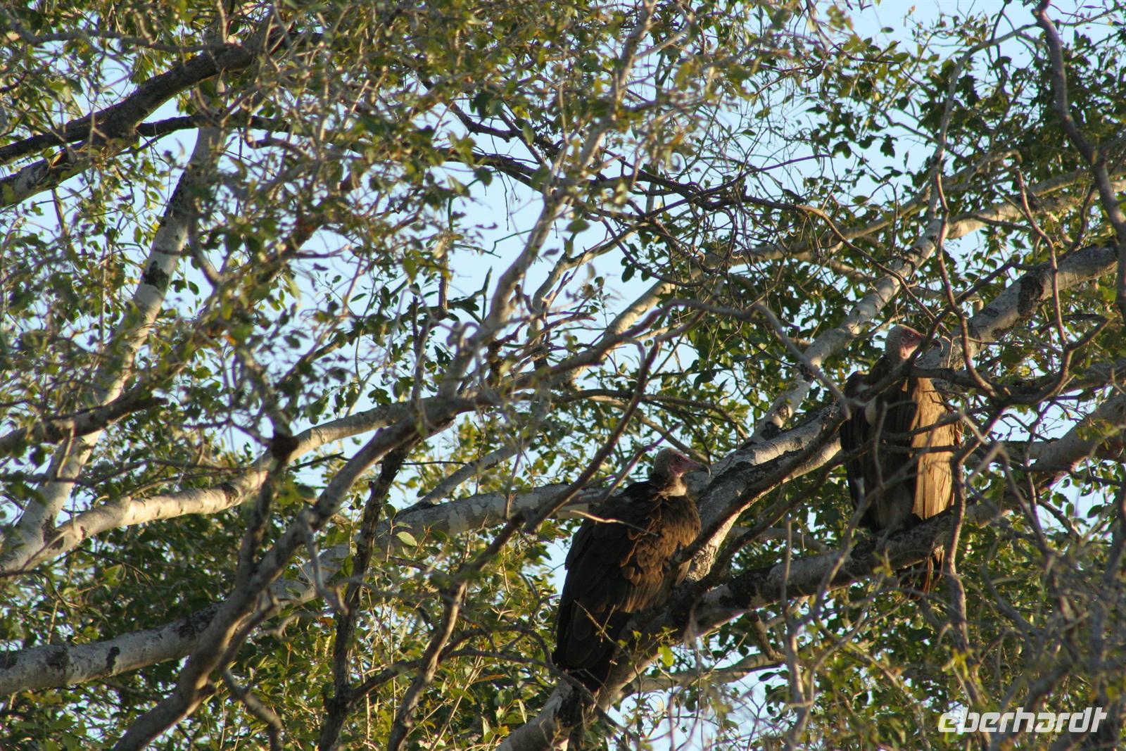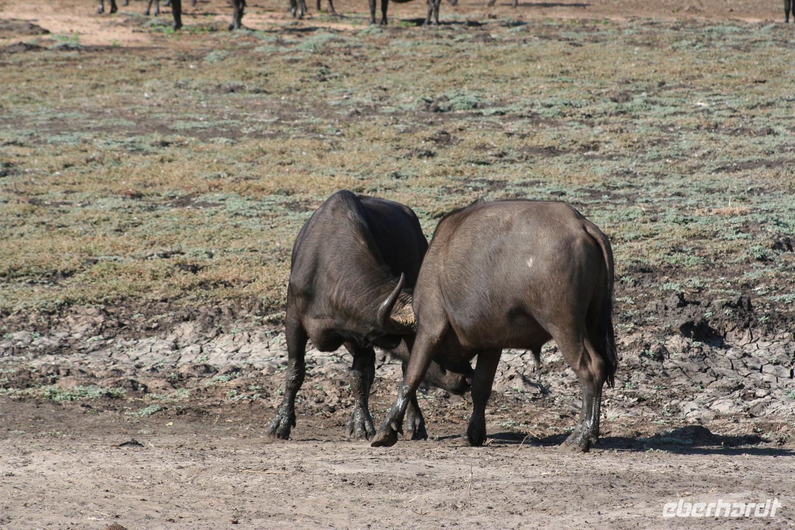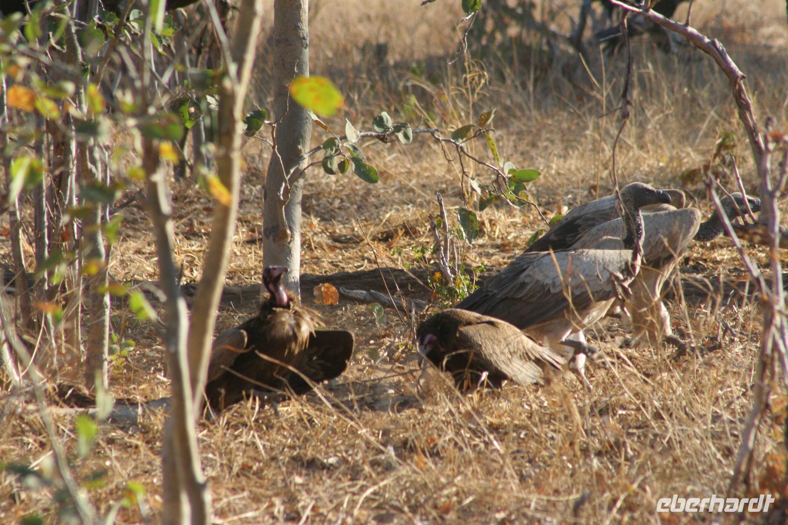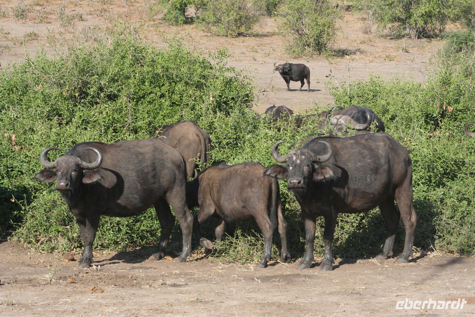 Bald darauf gesellten sich, etwas abseits, Flusspferde und Krokodile dazu. Perlhühner kreiselten durch die Gegend und machten einen Höllenlärm. Zurück im dichten Park pirschten wir weiter und sahen Giraffen, einen seltenen Honigdachs, eine riesige Büffelherde, Schakale, Elands, Wasserböcke, Impalas, Paviane, Zebras und eine Horde Geier, die sich an dem, was Familie Löwe in der Nacht übrig gelassen hatten, fast die kahlen Köpfe einschlugen. Die Zeit verging wie im Flug, fast 4 h waren wir nun schon auf Safari! Das Frühstück musste auf uns warten, aber kein Problem in der Lodge (die wissen, dass die Frühpirschler immer später kommen). Alles war noch ausreichend da und so machten wir aus dem eigentlichen Frühstück einen ausgiebigen Brunch. Über die heiße Mittagszeit war relaxen angesagt. Einige bummelten mit mir durch Kasane (eigentlich nur die Hauptstraße hoch und wieder runter/mehr gibt es nicht), stöberten in kleinen Geschäften und im Supermarkt und besuchten spontan das Krankenhaus von Kasane. Am Nachmittag gings dann mit dem Boot auf Pirschfahrt. Das hatte uns Tom schon besonders schmackhaft gemacht, aber wir glaubten, dass die bisherigen Erlebnisse nicht mehr gesteigert werden können. Da waren wir alle samt im Irrglauben. Mit unserem Boot (nur für unsere Gruppe) und kühlen Getränken an Bord schipperten wir gemütlich auf dem Chobe am Ufer entlang. Die beste Kulisse bot sich wirklich vom Wasser aus. Ganz nah beobacheten wir Bienenfresser