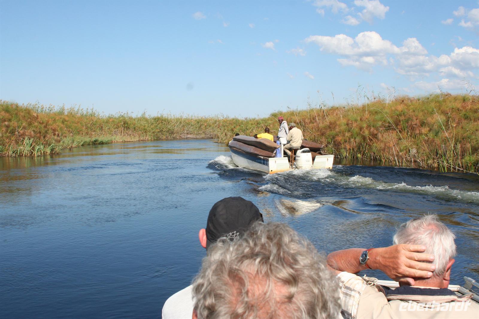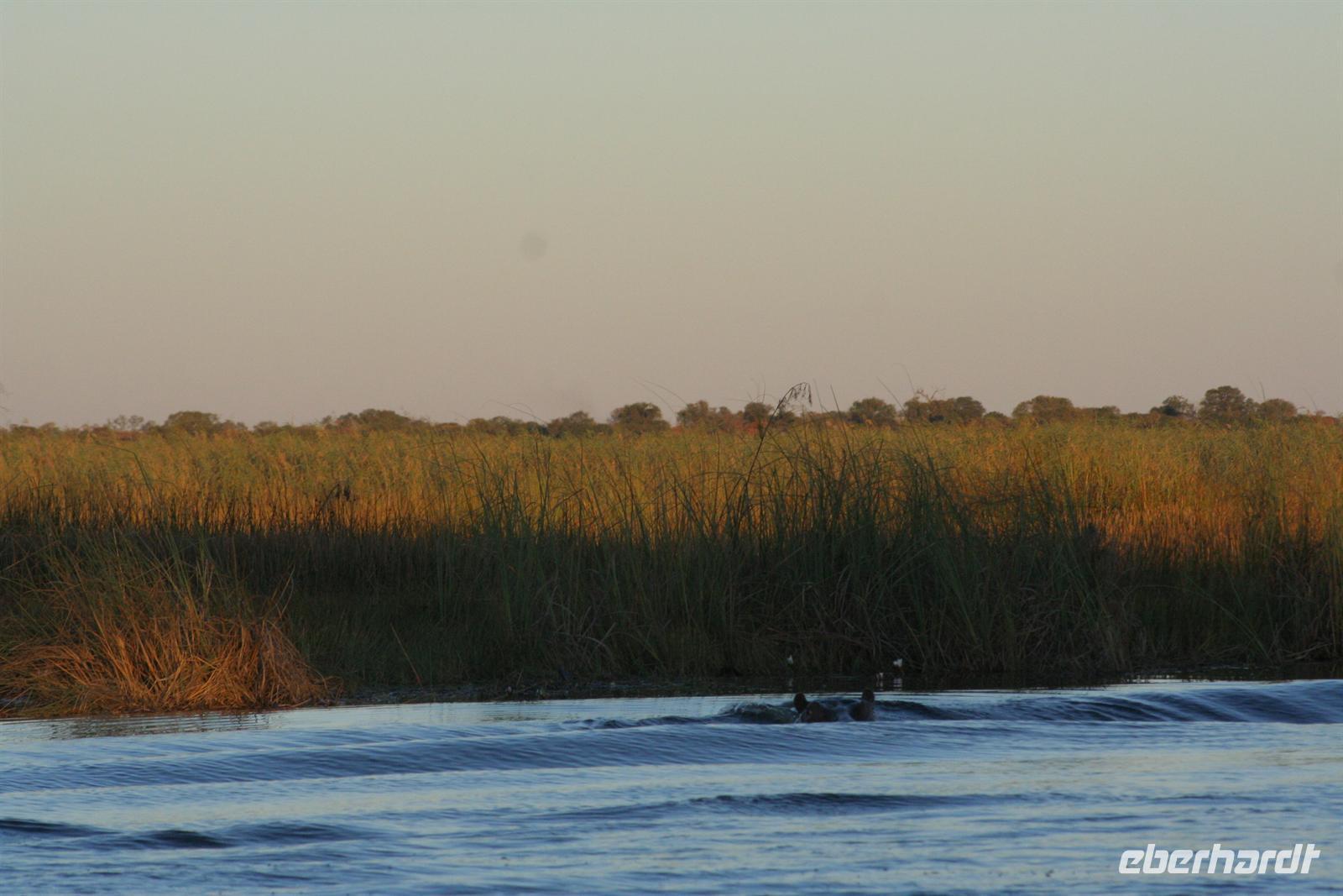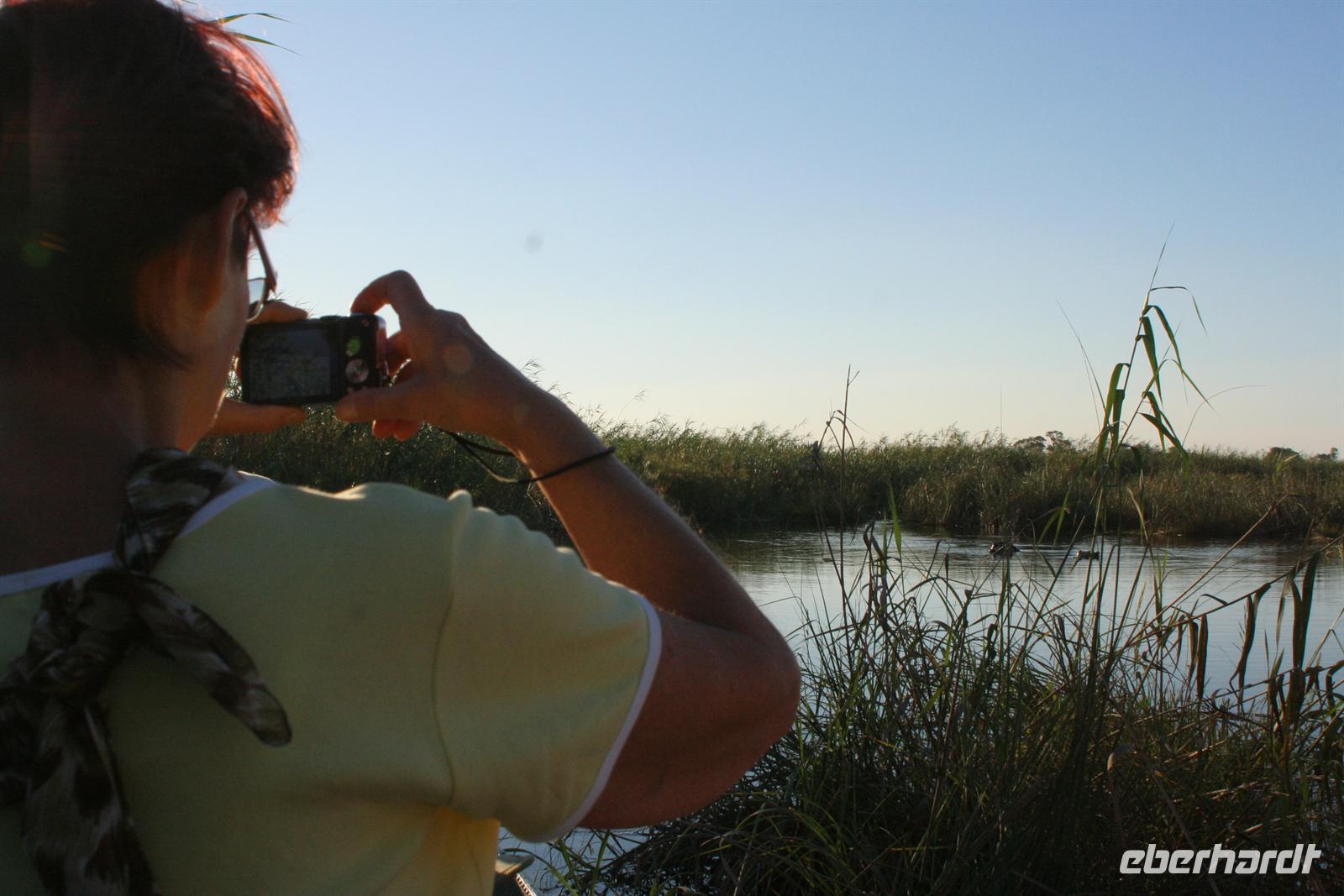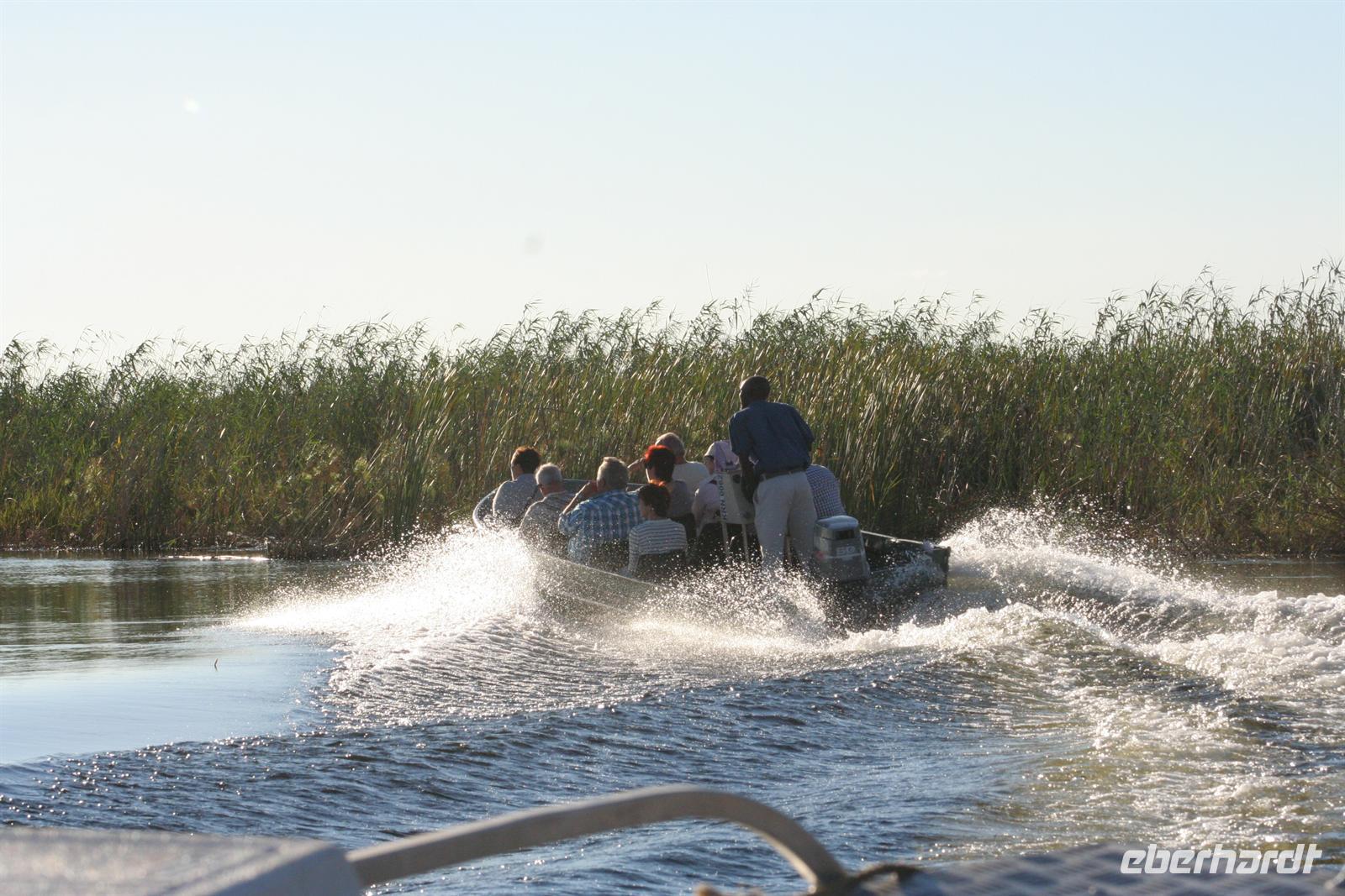 später die Grenze zu Namibia. Kurz darauf durchquerten wir den kleinen Mahango NP, bevor wir in den Caprivistreifen fuhren. Tom erzählte uns wieder Interessantes zur Region, von Sitten und Bräuchen der verschiedenen Stämme und von seinen persönlichen Erlebnissen im südlichen Afrika. Das Mittagspicknick fehlte auf diesem Tag auch nicht. Am Nachmittag erreichten wir die wildromatische "Namushasha Lodge" bei Kongola. Nach Kaffee und Kuchen unternahmen wir eine Bootsfahrt auf den Ausläufern des Kwando-Rivers, der hier, zwischen dem Bwabwata- und dem Muhundu NP ein Delta bildet. Die rasante Fahrt durch das Wasser machte uns richtig Spass. Unsere beiden Bootsführer fuhren dennoch vorausschauend, den überall wimmelte es vor Krokodilen und Flusspferden.