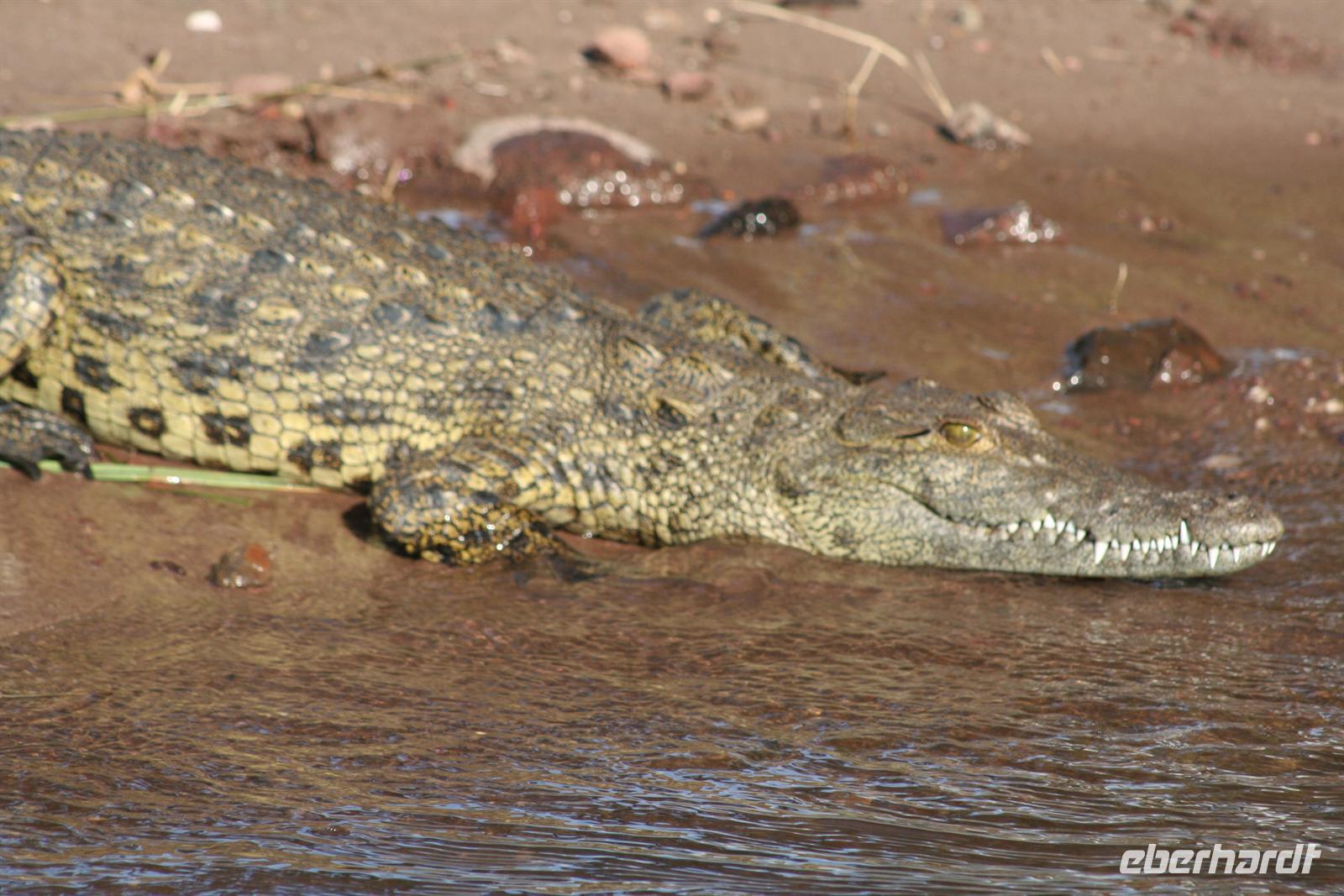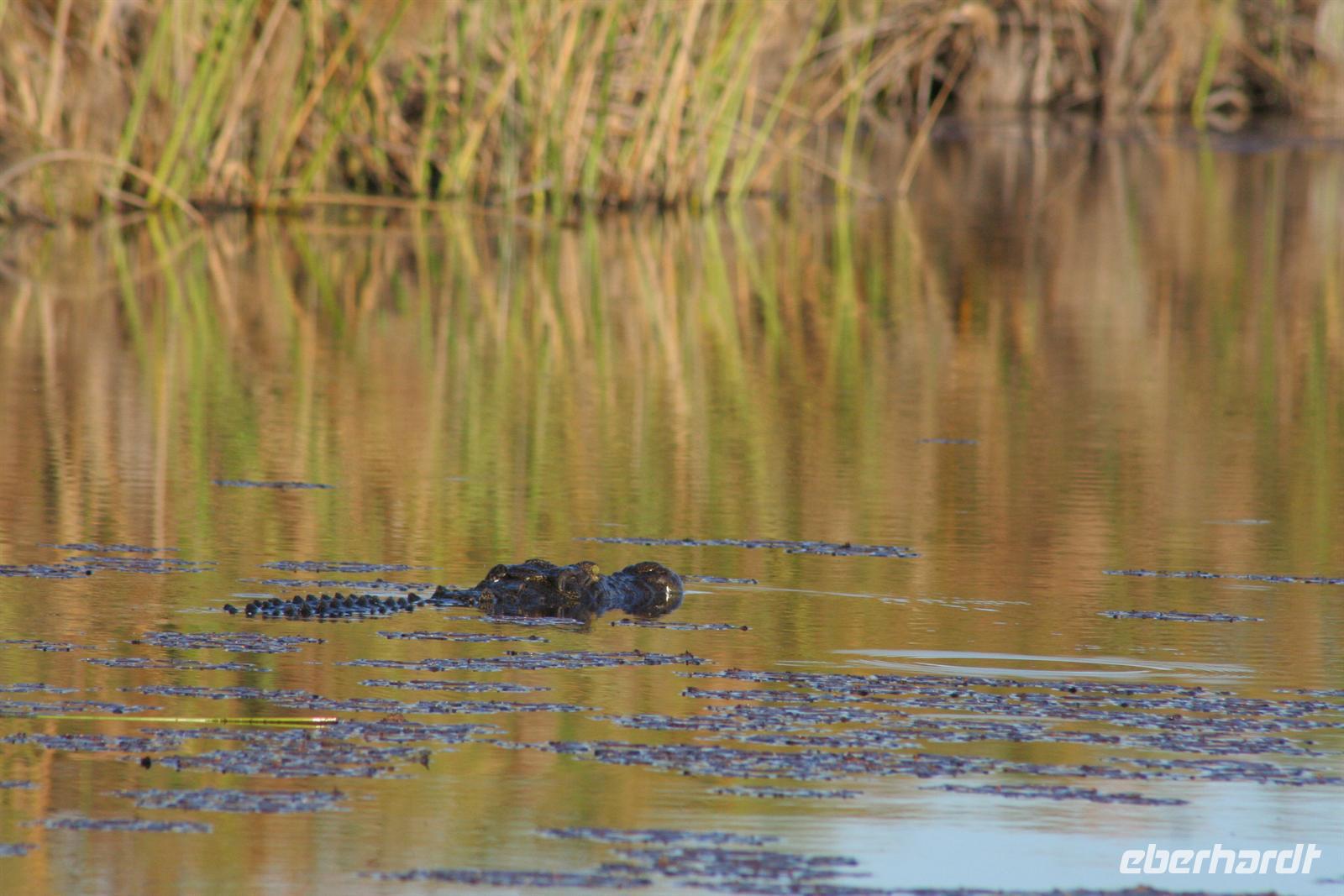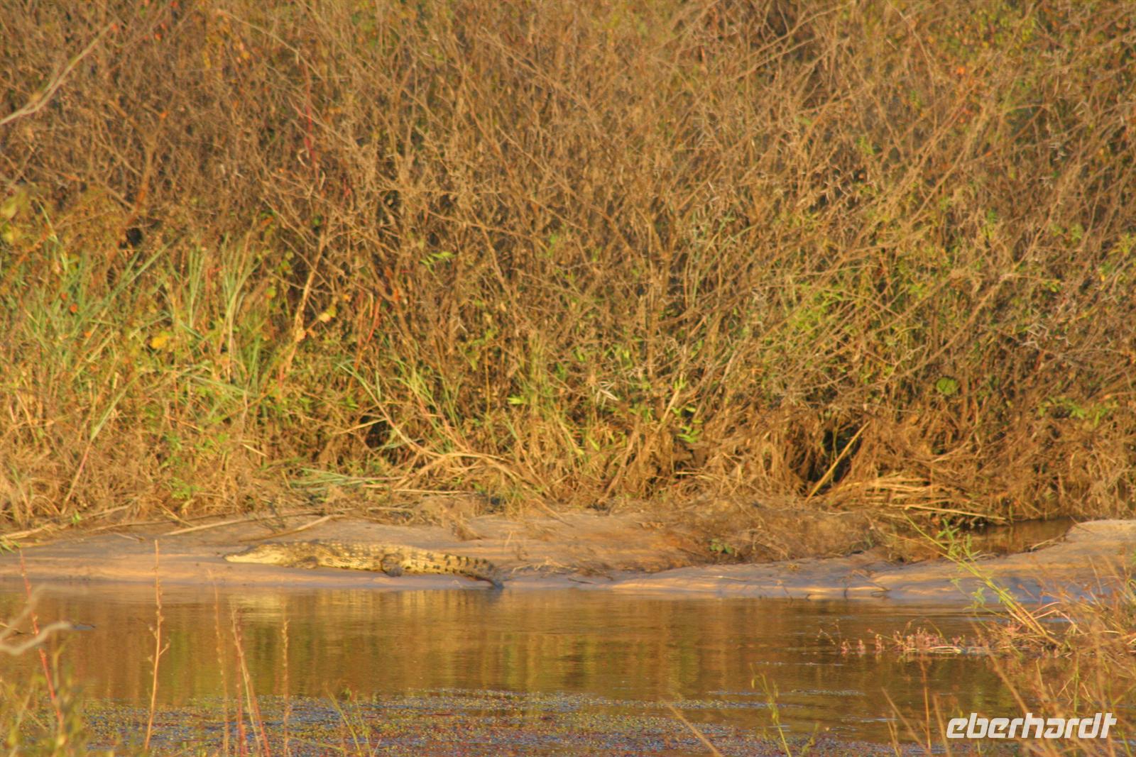 später die Grenze zu Namibia. Kurz darauf durchquerten wir den kleinen Mahango NP, bevor wir in den Caprivistreifen fuhren. Tom erzählte uns wieder Interessantes zur Region, von Sitten und Bräuchen der verschiedenen Stämme und von seinen persönlichen Erlebnissen im südlichen Afrika. Das Mittagspicknick fehlte auf diesem Tag auch nicht. Am Nachmittag erreichten wir die wildromatische "Namushasha Lodge" bei Kongola. Nach Kaffee und Kuchen unternahmen wir eine Bootsfahrt auf den Ausläufern des Kwando-Rivers, der hier, zwischen dem Bwabwata- und dem Muhundu NP ein Delta bildet. Die rasante Fahrt durch das Wasser machte uns richtig Spass. Unsere beiden Bootsführer fuhren dennoch vorausschauend, den überall wimmelte es vor Krokodilen und Flusspferden.