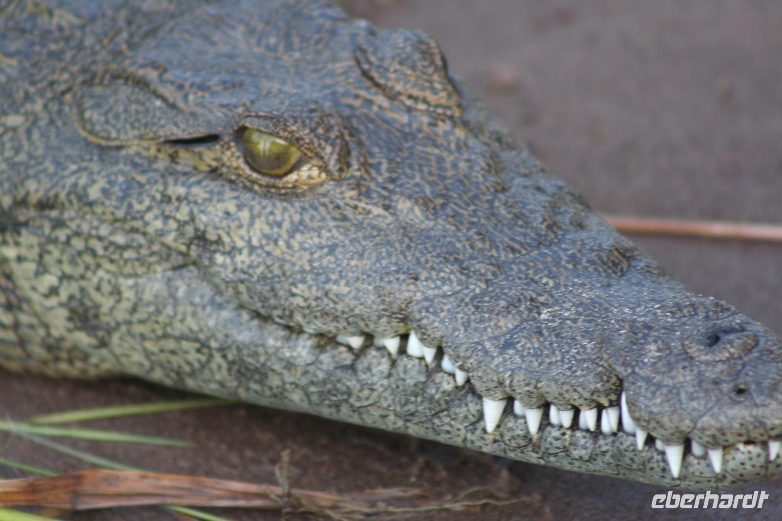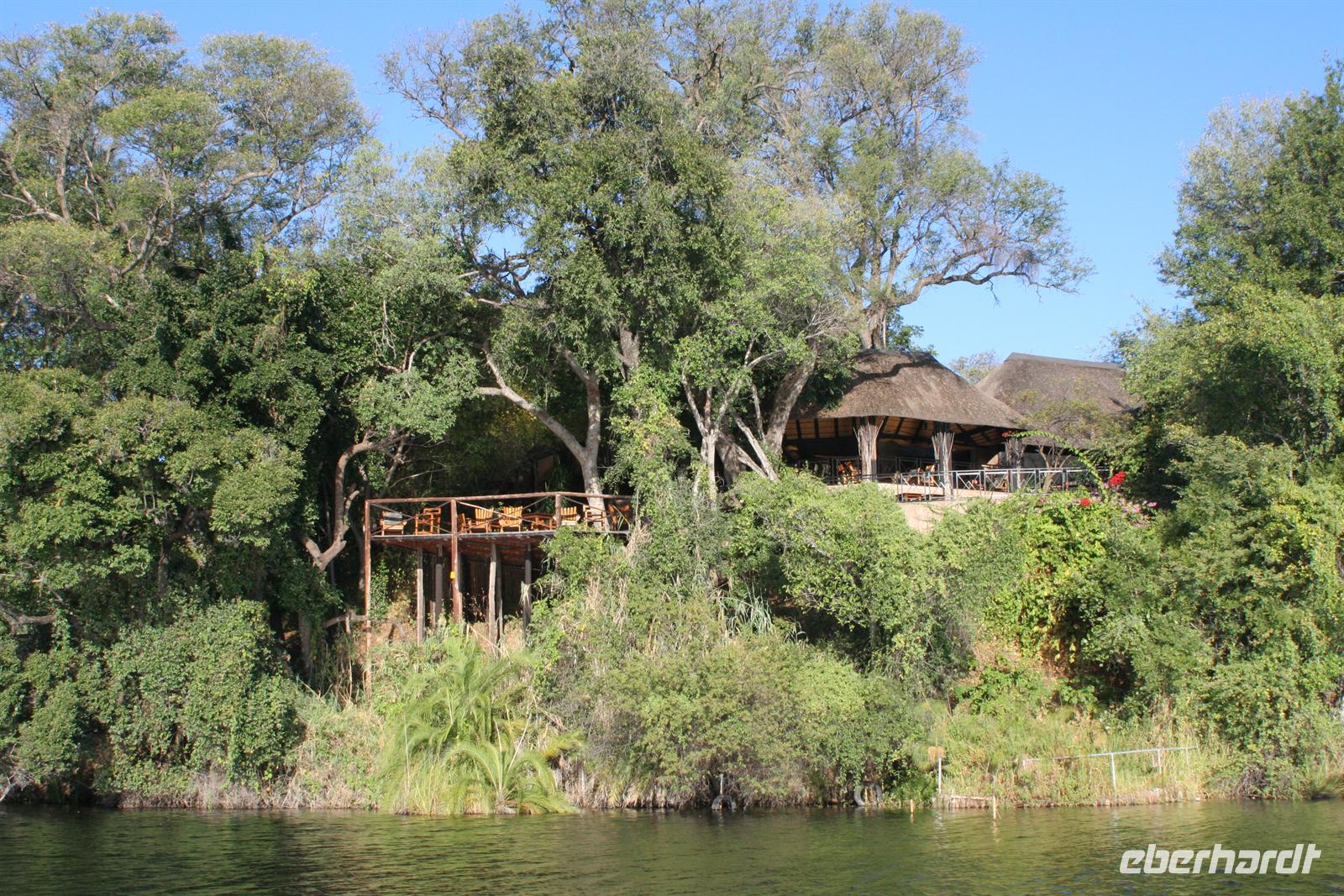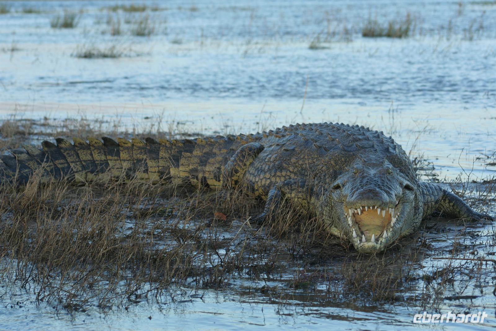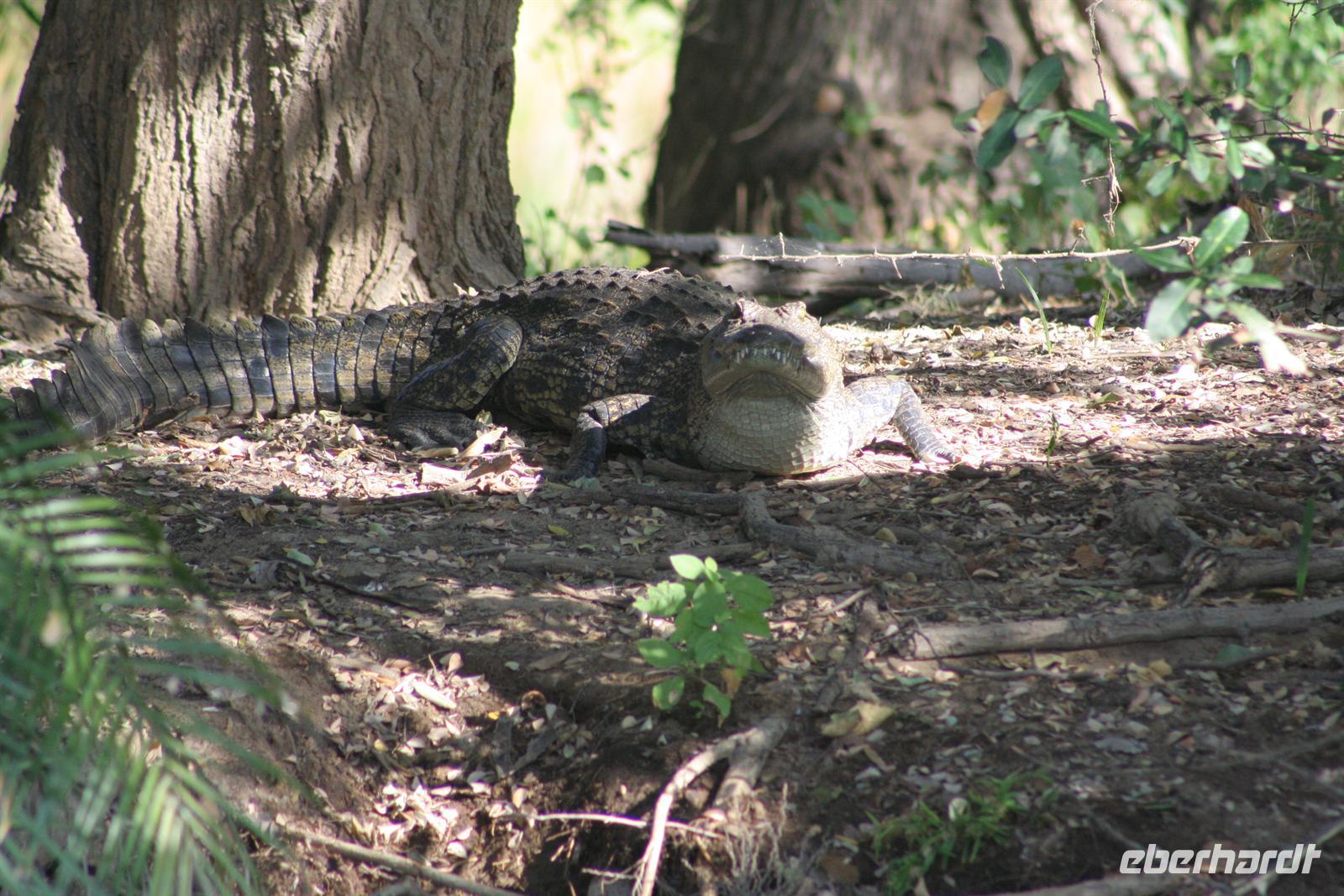 später die Grenze zu Namibia. Kurz darauf durchquerten wir den kleinen Mahango NP, bevor wir in den Caprivistreifen fuhren. Tom erzählte uns wieder Interessantes zur Region, von Sitten und Bräuchen der verschiedenen Stämme und von seinen persönlichen Erlebnissen im südlichen Afrika. Das Mittagspicknick fehlte auf diesem Tag auch nicht. Am Nachmittag erreichten wir die wildromatische "Namushasha Lodge" bei Kongola. Nach Kaffee und Kuchen unternahmen wir eine Bootsfahrt auf den Ausläufern des Kwando-Rivers, der hier, zwischen dem Bwabwata- und dem Muhundu NP ein Delta bildet. Die rasante Fahrt durch das Wasser machte uns richtig Spass. Unsere beiden Bootsführer fuhren dennoch vorausschauend, den überall wimmelte es vor Krokodilen und Flusspferden.