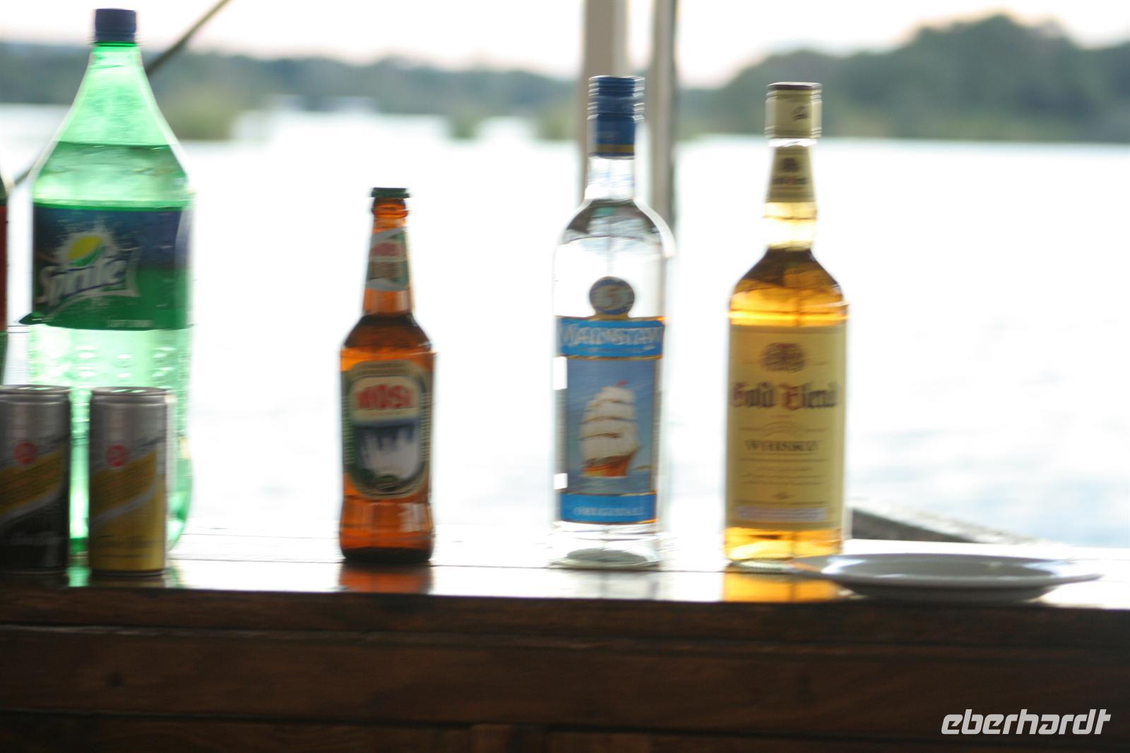 Für den Abend hatte Tom für uns noch eine Riesen-Überraschung parat, eine "Sundowner-Fahrt" auf dem Sambesi als Geschenk. Wir freuten uns riesig. Also brachen wir zur Bootsanlegestelle auf und staunten nicht schlecht, als wir an Bord des kleinen Schiffes gingen: neben der schon fantastischen Bootstour war es ein All-Inclusiv-Tripp ( (alle Getränke, vom Mineralwasser bis zum Gin & Tonic und kleine Snacks, vom leckeren Fingerfood bis zum saftigen Burger waren inklusive). Das Lieblingsgetränk unserer Gruppe zum "Sundowner" war Gin & Tonic. Die erste Runde war schnell geordert und kurz vor Ablegen holte der Skipper noch schnell freundlich lächelnd Nachschub. Dankeschön, wir haben die Fahrt in den Sonnenuntergang auf dem Sambesi genossen! Unterwegs sagten uns Elefanten, Giraffen, Hippos und Krokodile Willkommen an den Victoria Wasserfällen. Es war super! Der weitere, sommerliche Abend an der Poolbar mit musikalischer Begleitung im Resort wurde noch lang.