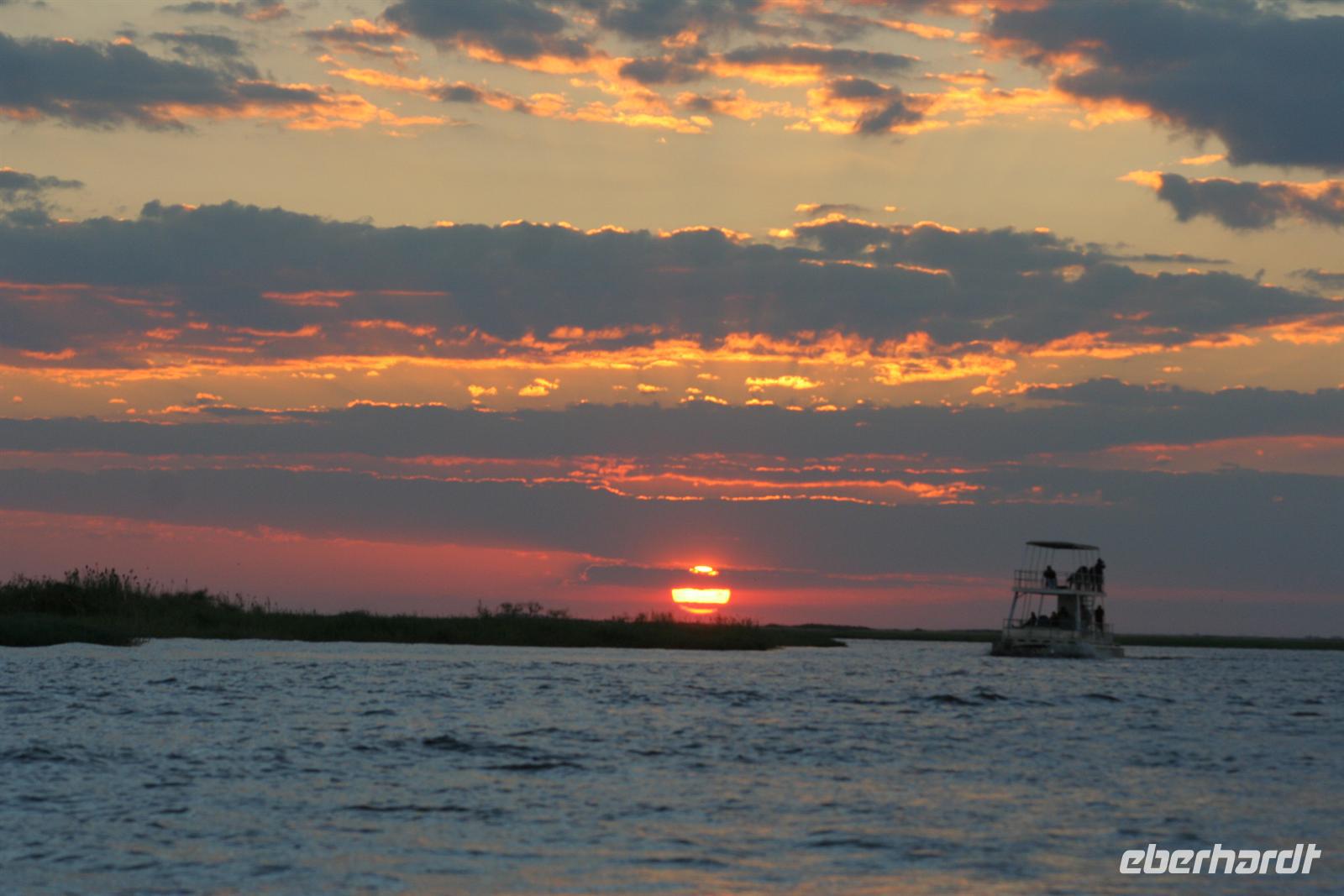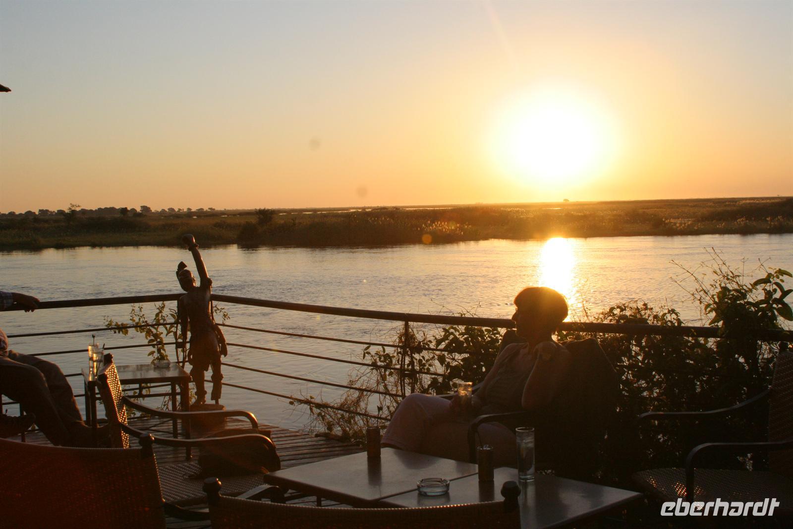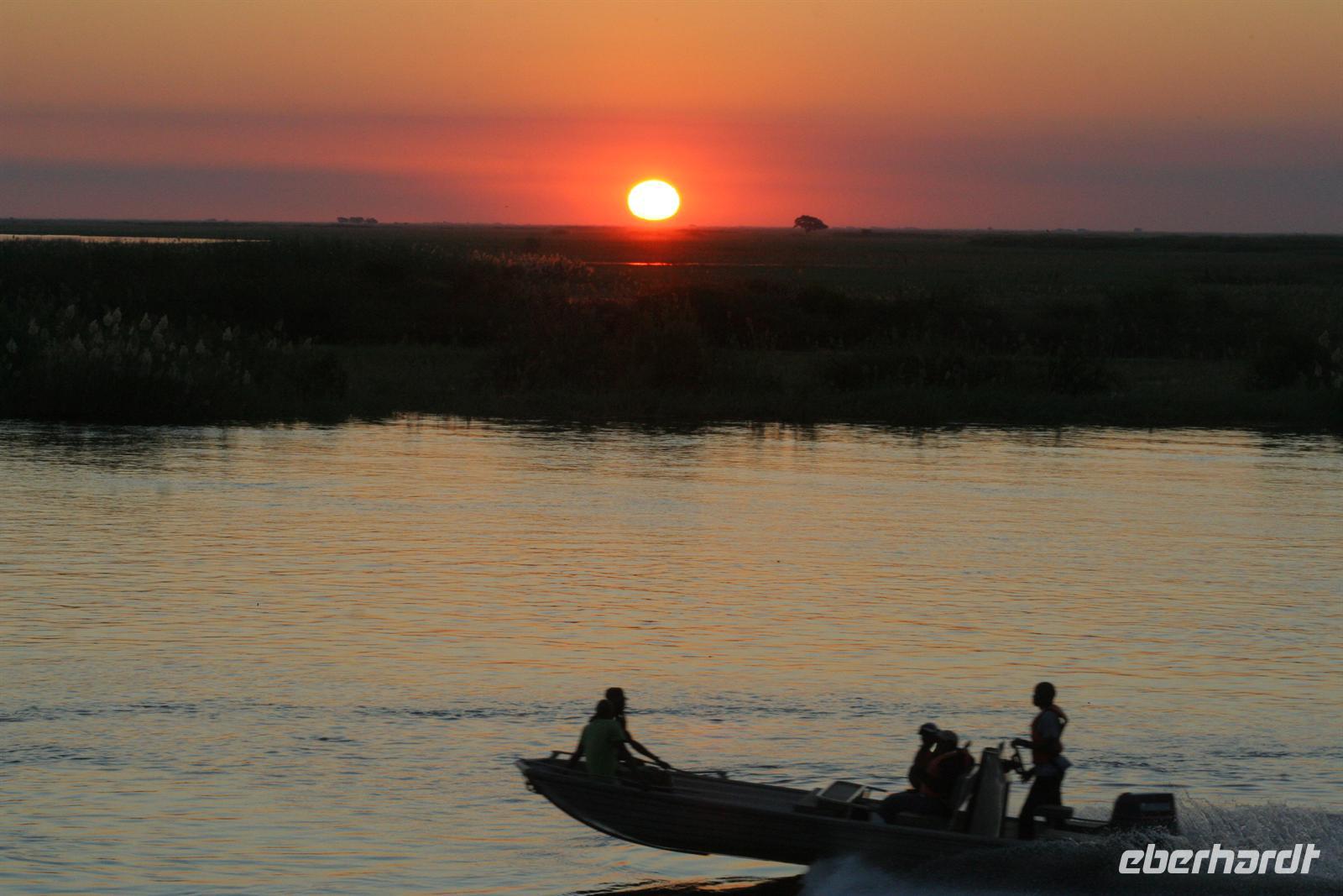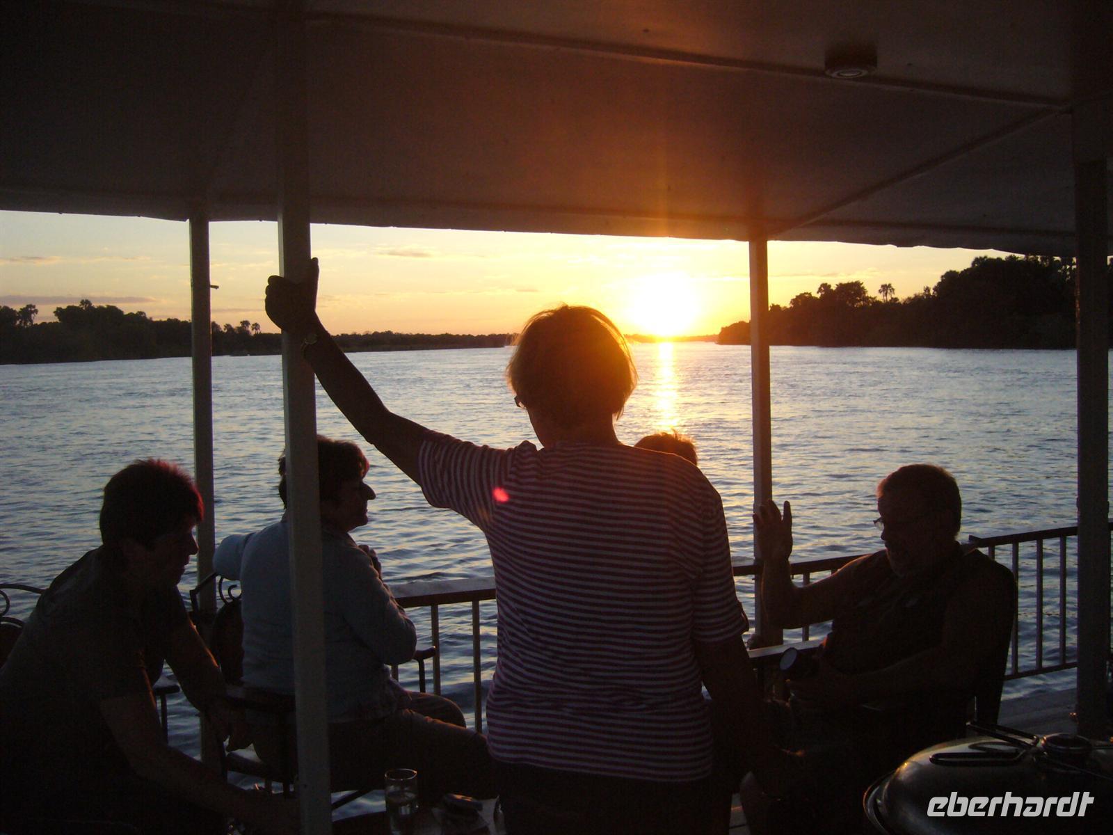 Während die Sonne wieder mal atemberaubend unterging, schipperten wir glücklich zur Lodge zurück. Beim gemeinsamen, wiederum fantastischen Abendessen liessen wir diesen fantastischen Tag noch einmal Revue passieren und verabschiedeten uns gleichzeitig offiziell von Ernst, unserem namibischen Busfahrer, der uns am nächsten Tag nur noch bis zur Grenze nach Sambia begleitete.