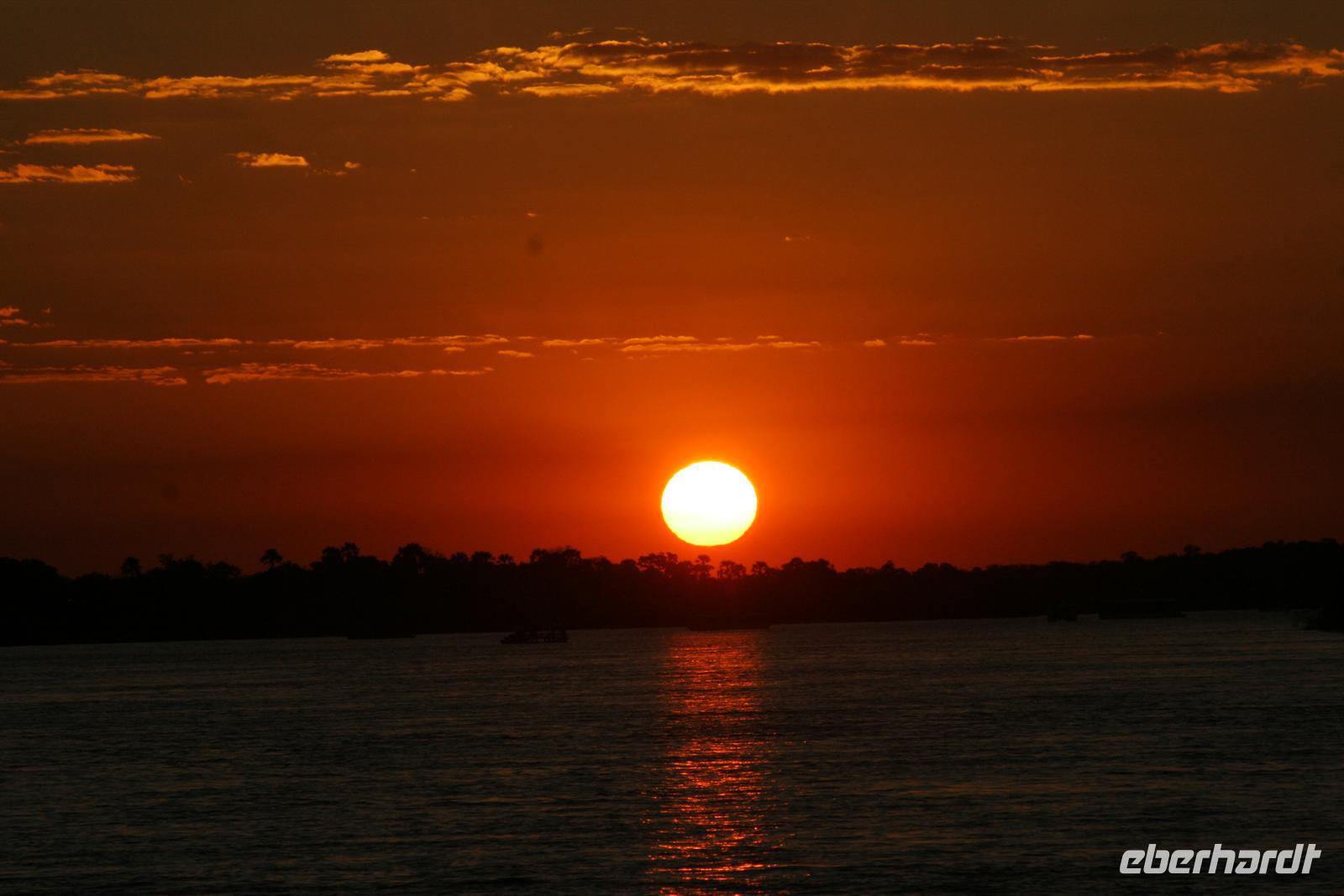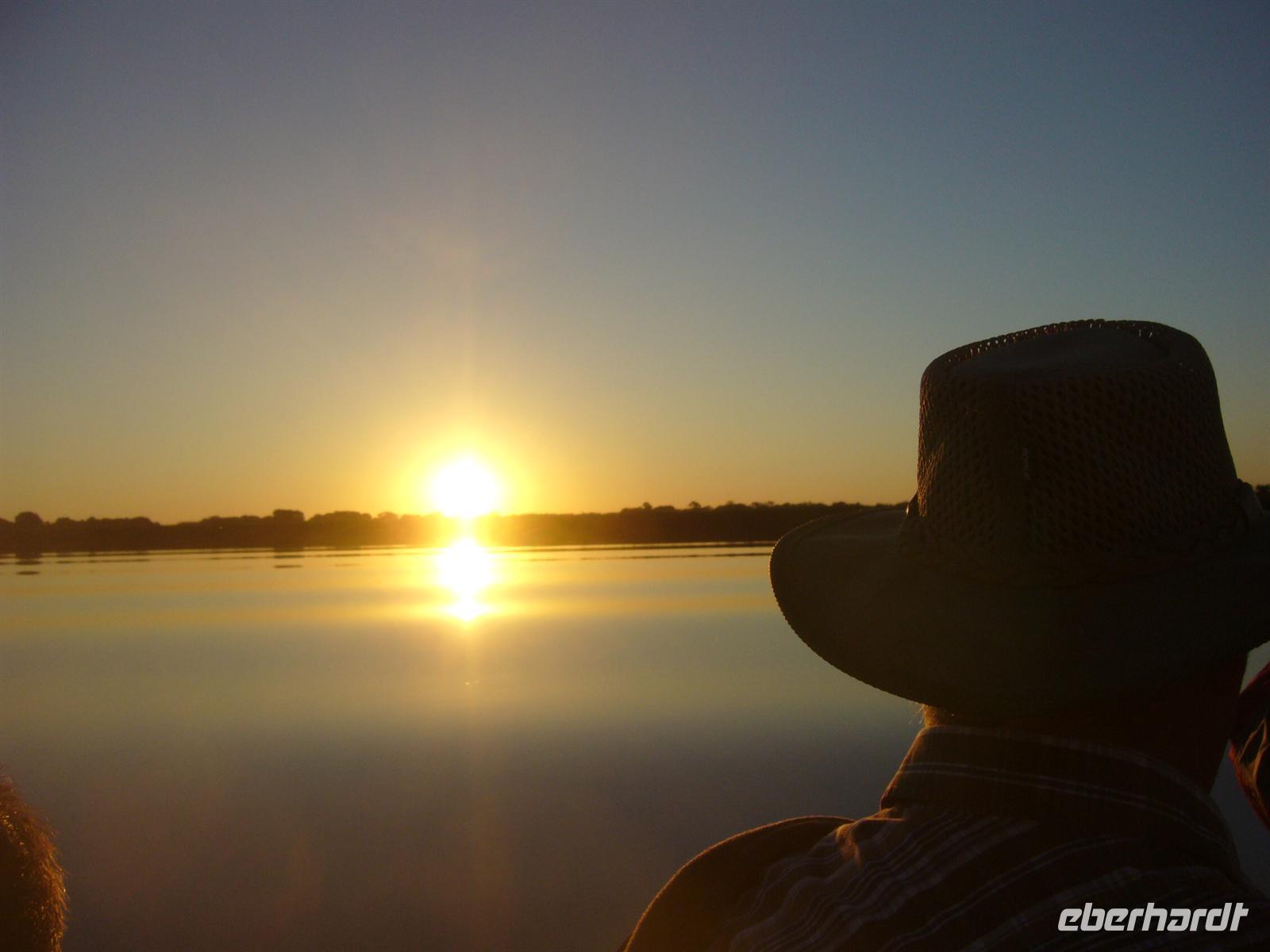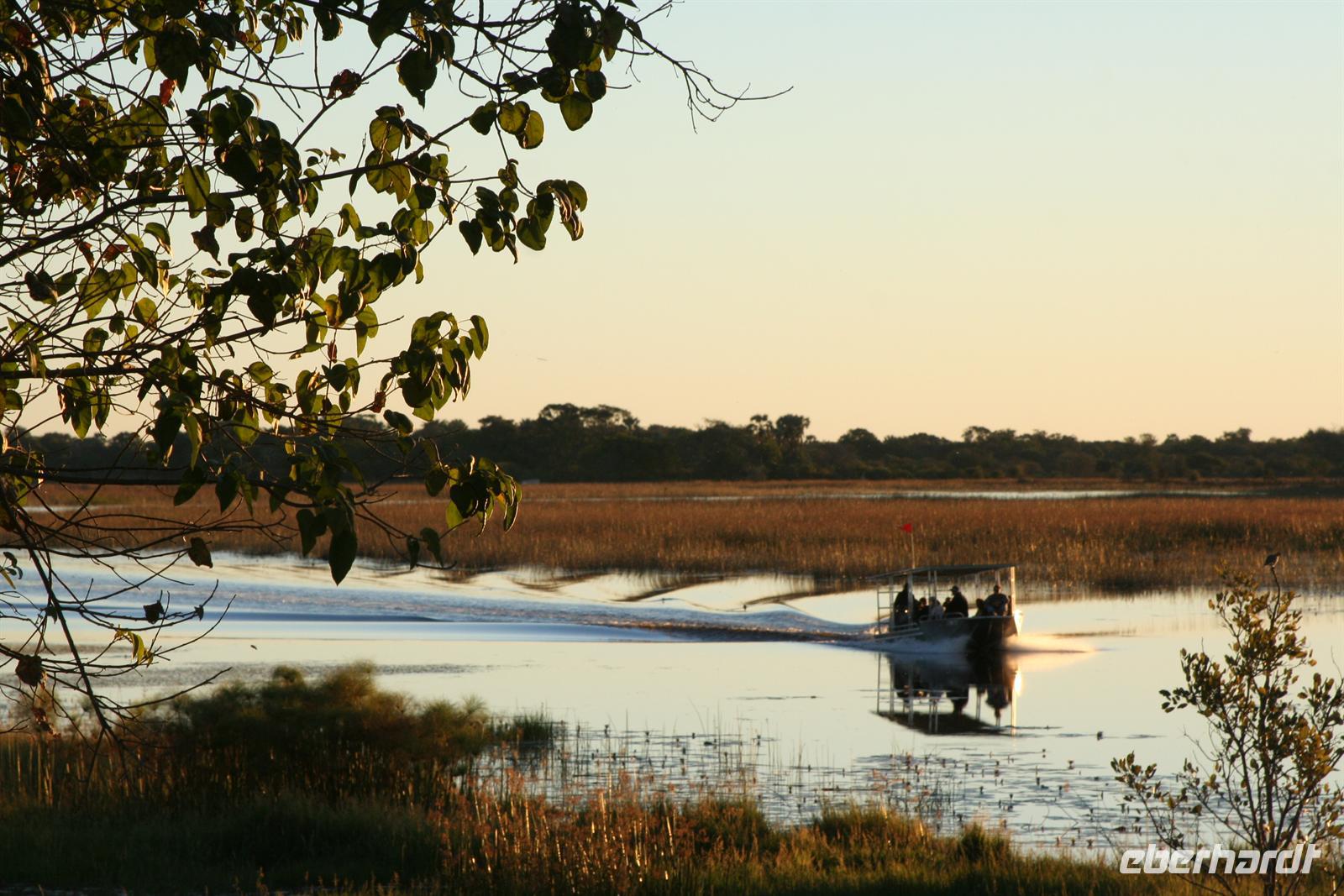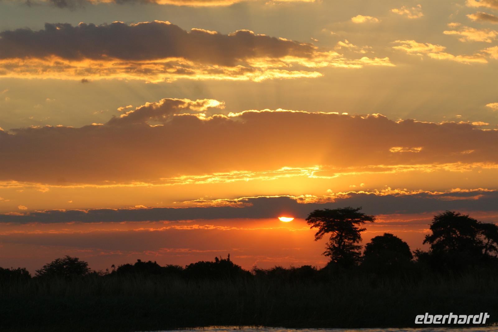 Während die Sonne wieder mal atemberaubend unterging, schipperten wir glücklich zur Lodge zurück. Beim gemeinsamen, wiederum fantastischen Abendessen liessen wir diesen fantastischen Tag noch einmal Revue passieren und verabschiedeten uns gleichzeitig offiziell von Ernst, unserem namibischen Busfahrer, der uns am nächsten Tag nur noch bis zur Grenze nach Sambia begleitete.