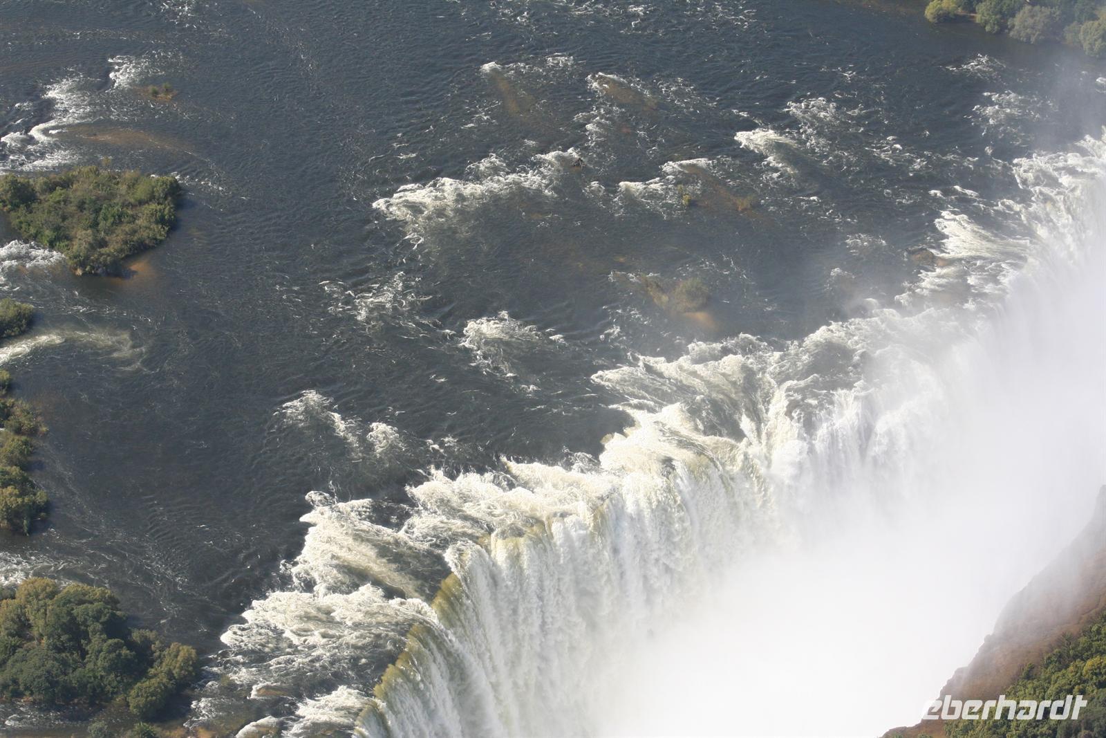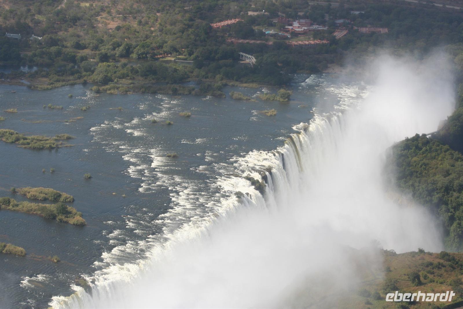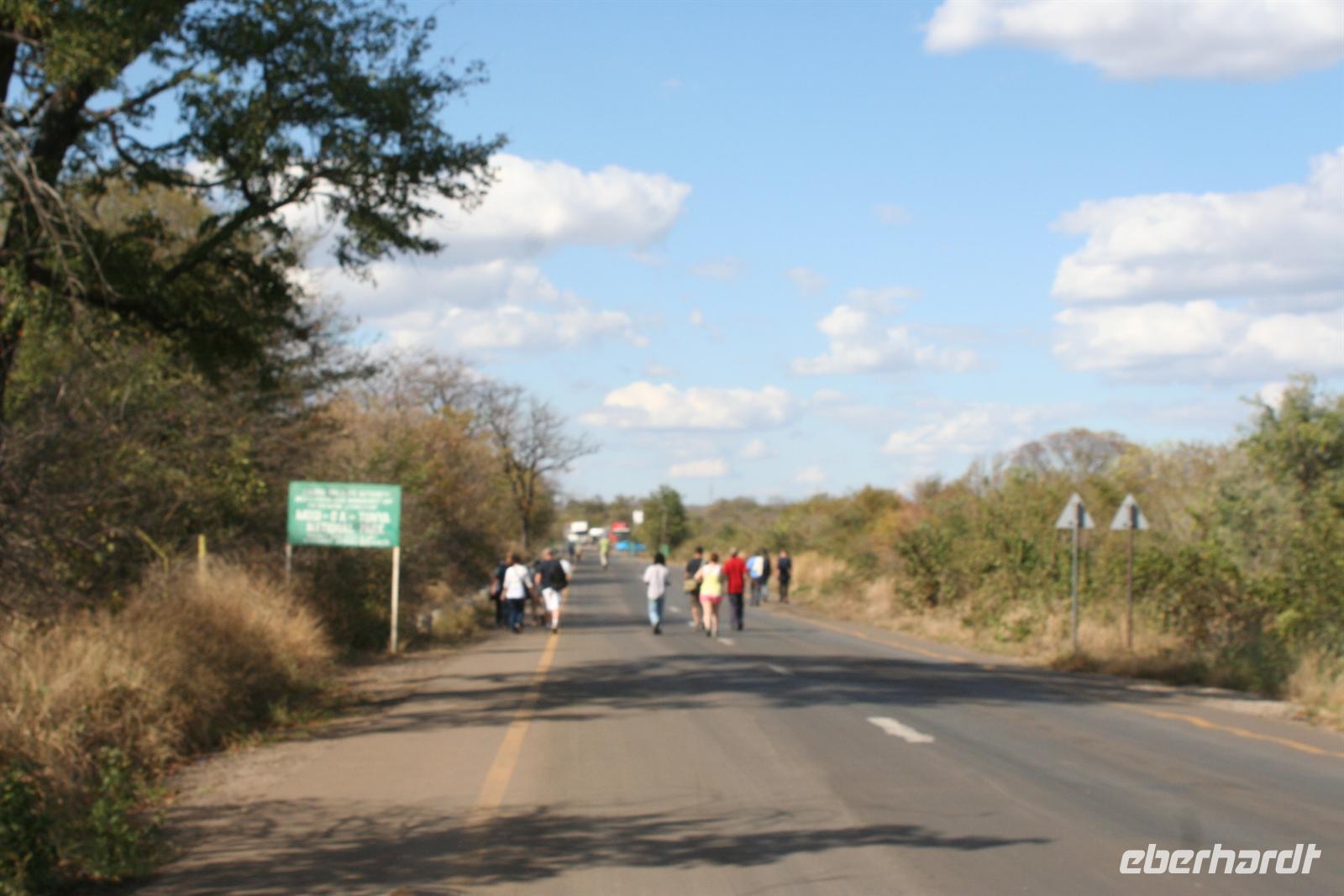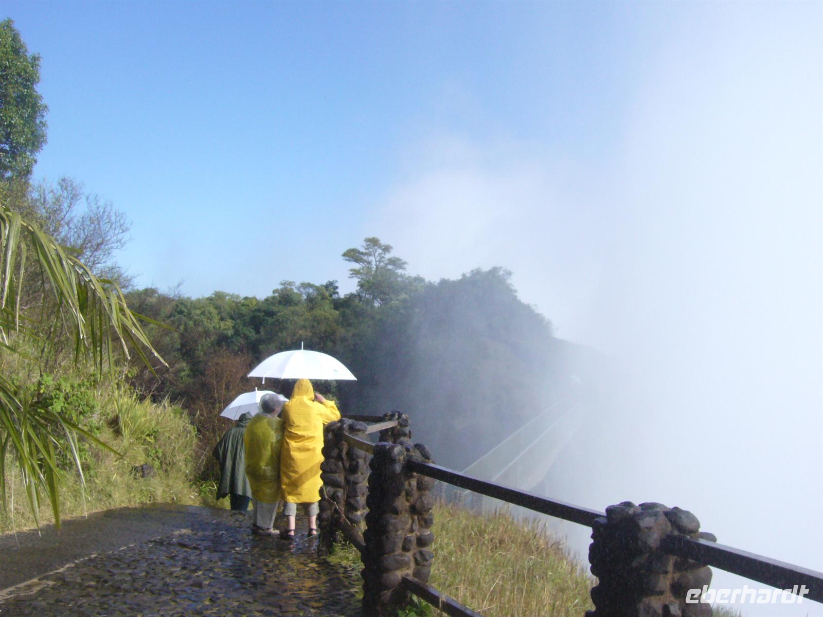 Als Tom aus dem Grenzhäuschen endlich wieder kam, war ich heiser und fix und foxi, aber alle hatten ihren Spass. Ein kurzes Stück war es nur bis Livingstone. In einem Einkauszentrum machten wir noch kurz halt, um dann einen ersten Blick auf die schäumende Gicht der Wasserfälle zu wagen. Anschließend schauten wir noch in einem Aktivitätencenter vorbei, um diverse Ausflüge für den nächsten Tag zu buchen. Alle entschieden sich für den Heliokopterflug über die Wasserfälle, einige noch zusätzlich für einen geführten Spaziergang mit jungen,echten Löwen.