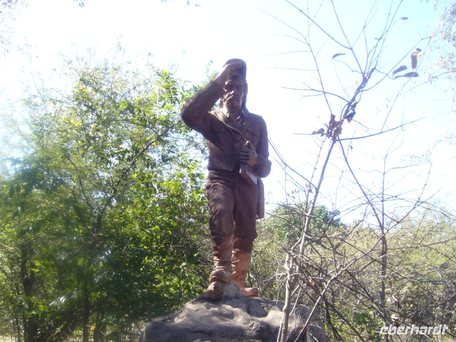 Am Denkmal von David Livingstone vorbei gelangten wir in die "Feuchtgebiete", ab hier kneifte Tom. Aber wir "verkleideten" uns wasserfest und begaben uns auf den Rundweg, das Lied "I am singing in the rain" auf unseren Lippen. Trotz spontaner, wolkenbruchartiger Duschen (meine Schuhe quitschten danach vor Begeisterung, aber Badelatschen waren mir zu riskant) waren wir von den Ein- und Ausblicken, die sich uns auf Brücken und Aussichtpunkten über der Schlucht gewaltig ausbreiteten beeindruckt und fasziniert. Anschließend bummelten wir noch über den Holzmarkt und ersteigerten, nach zähen Verhandlungen, viele Mitbringsel für daheim. Übrigens funktioniert hier noch der Tausch: Ware gegen Ware. Mein noch nicht getrocknetes Regencape in der Sparvariante + ein paar Tshirts fanden reißenden Absatz. Dafür ersteigerte ich eine schmucke Holzschale;-). Beim Spaziergang im schattigen Park des Resorts picknickten wir und beobachteten die lustigen Streitereien der Velvet Monkeys und machten die Bekanntschaft mit einem "dressierten" Krokodil, welches auf Zuruf des Gärtners angekrochen kam. Noch gewaltiger und spektalulärer erlebten wir am Mittag den Flug mit dem Heli über den Wasserfällen hinweg. Zum Heli-Airport wurden wir selbstverständlich von unserem Hotel transferiert. Sicher, 140 USD sind ein stolzer Preis für 10 min zu viert oder zu fünft in einem Heli. Aber der Bedarf regelt die Nachfrage, auch in Sambia. Am Himmel herrschte den ganzen Tag HochFlugbetrieb.