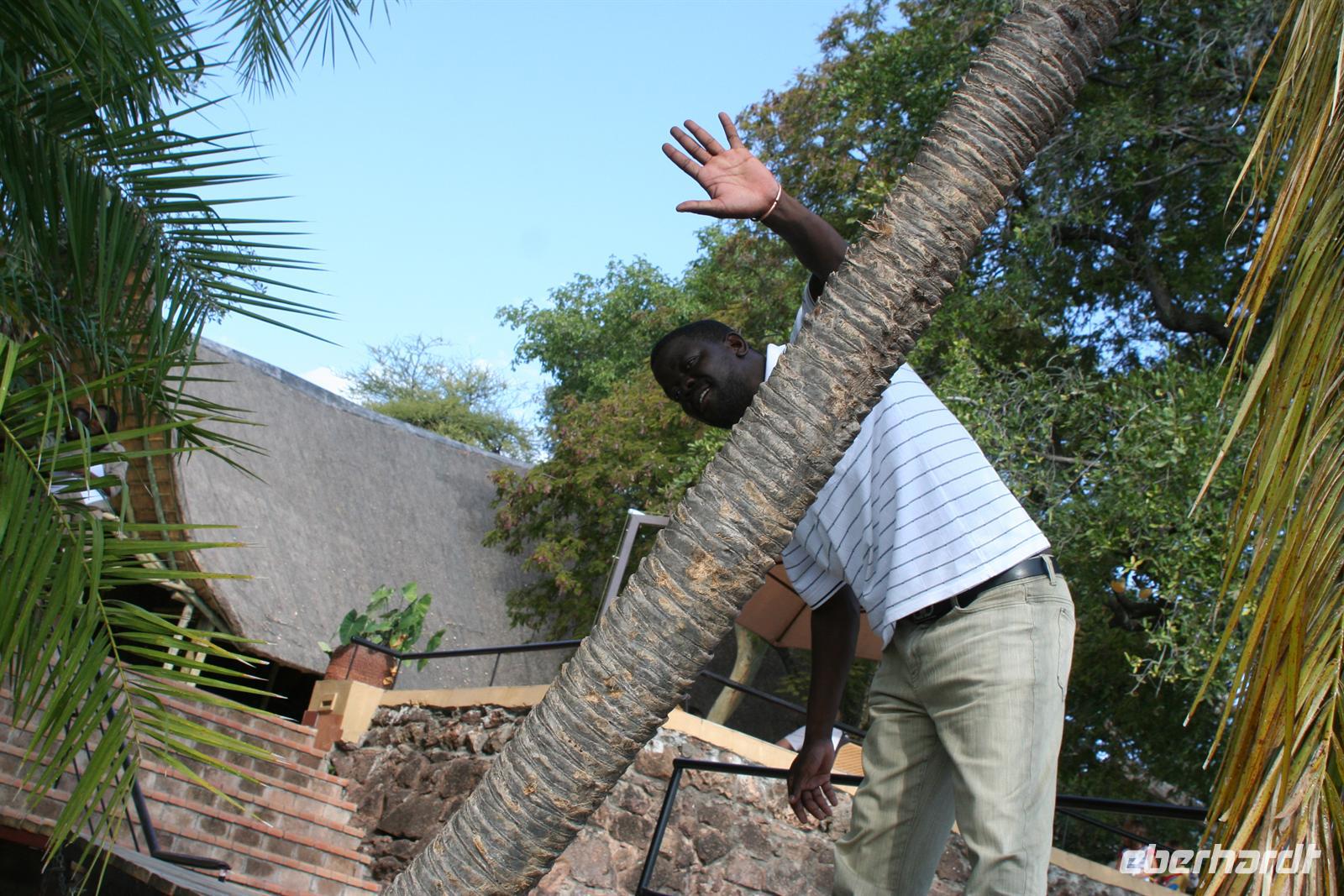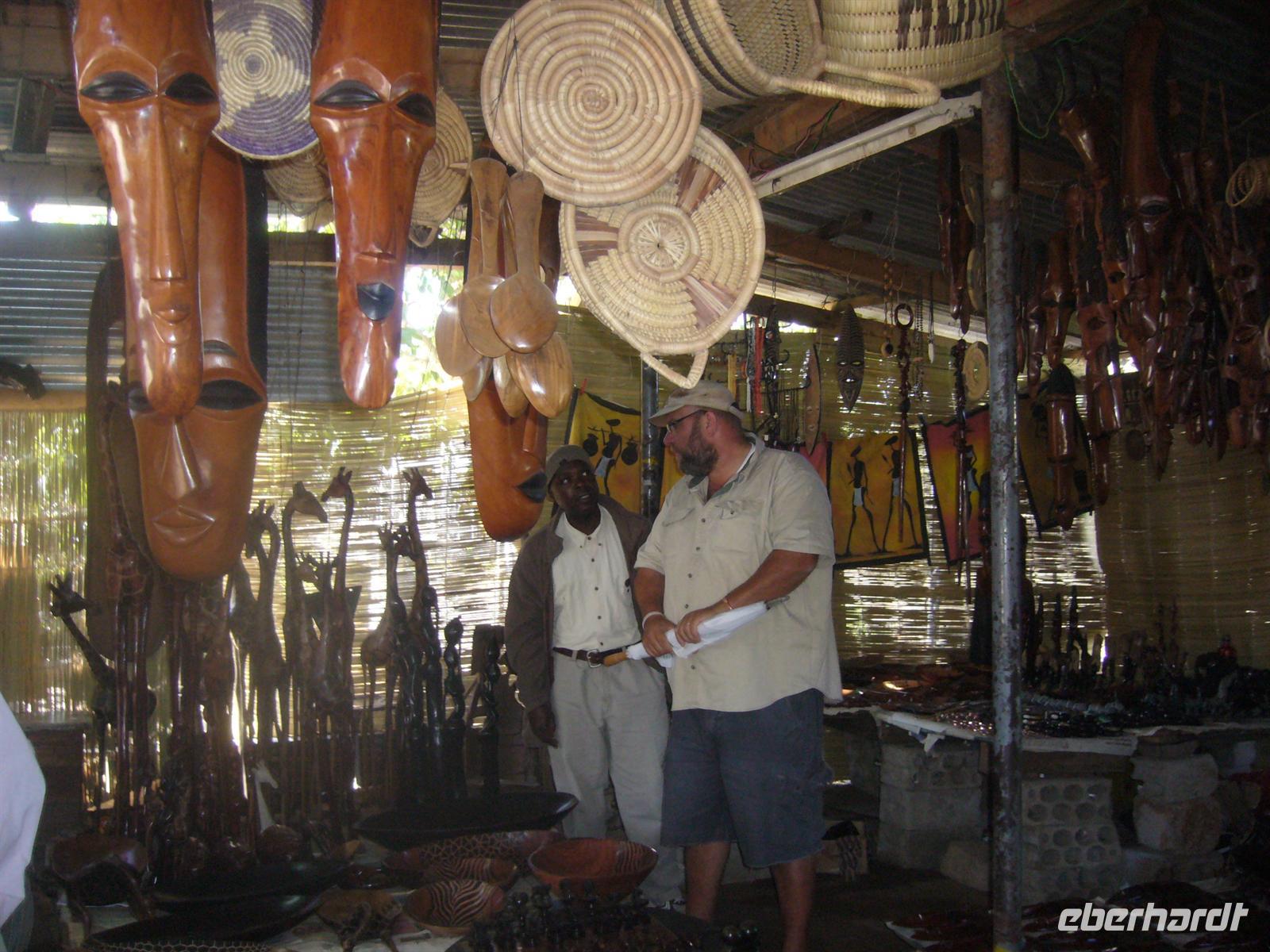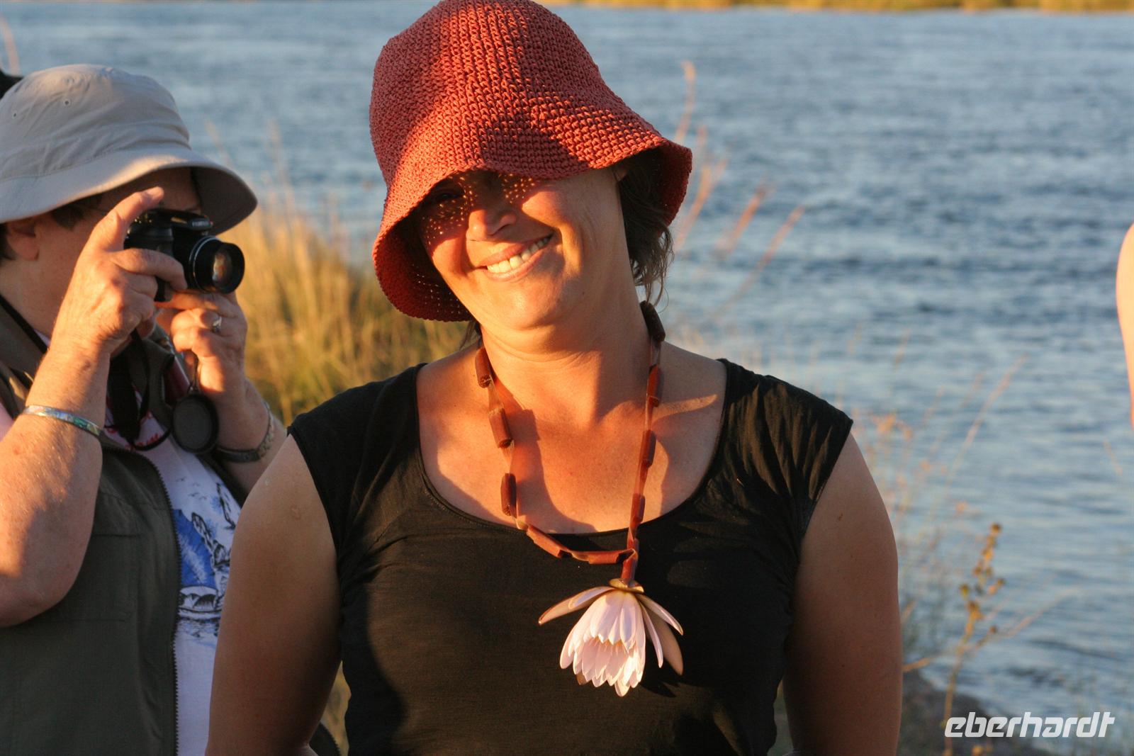 Die Zurückgebliebenen mußten dem Boot mit einem kräftigen Schupps ins Wasser und so stand ich mit dem Rest der Gruppe ohne Pass und Gepäck am Ufer, während uns die anderen grinsend zu winkten. Aber keine Sorge, das Boot kam zurück und holte auch uns. Am anderen Ufer mussten wir nur noch in den neuen kleinen Bus einsteigen, der uns zum Sambesi Sun Resort in Livingstone brachte. Huch, war das eine Herausforderung: Überall fliegende Händler mit lautstarken Superangeboten an Holzschnitzkunst und anderen Souveniren. Als wir endlich im Bus sassen und auf Tom warteten, klopfte es von allen Seiten an die Fenster. Sobald die Schiebefenster des Busses ein kleine Lücke boten, griffelten schwarze Hände hinein. Schöne Waren wurden feil geboten, einige Gäste fanden Gefallen und so entwickelten sich kräftige und intensive "Verkaufsgespräche", wobei das ein oder andere Schnäppchen heraus sprang.
