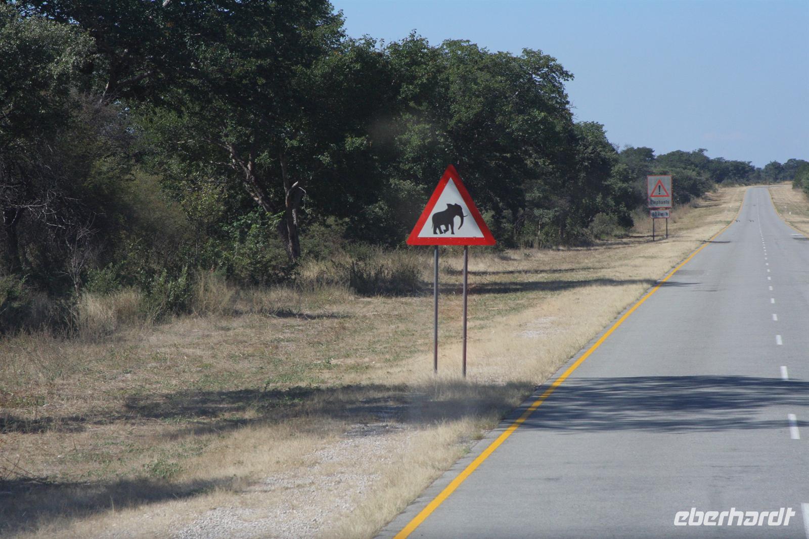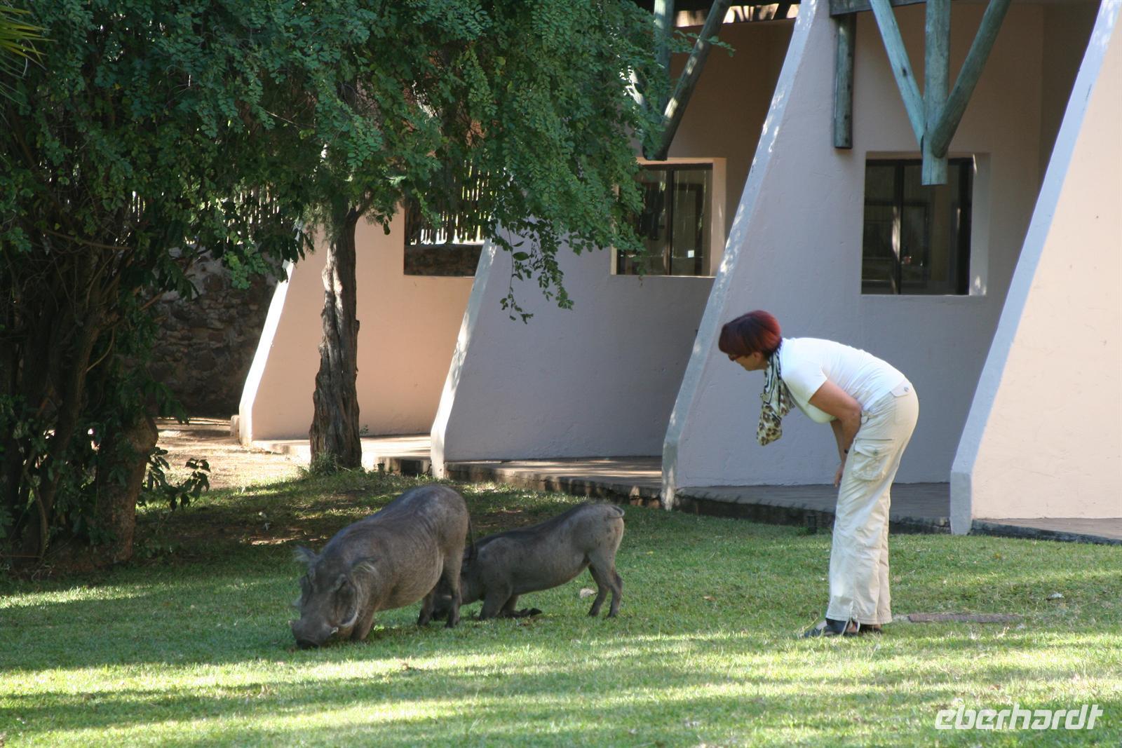 Stolz zeigte sie uns die Räume. In einem Klassenzimmer durften wir Platz nehmen, den Stundenplan studieren und in Schulheften stöbern. Zum Abschied bedankten wir uns mit einem Gruß an die Kids an der Tafel und übergaben der Lehrerin mitgebrachte Utensilien für den Unterricht (Stifte, Blöcke und Malfarben). Anschließend fuhren wir wieder nach Botswana, über die Ngoma Bridge passierten wir die Grenze. Die Straße nach Kasane führt direkt durch den Chobe NP. Zunächst begrüßten uns nur auf Warnschildern Elefanten, doch kurz darauf machten alle im Bus "komische" und schnelle Kopfbewegungen. Rechts und links der Asphaltstraße Elefanten, Elefanten. Das war aber nur ein winzig kleiner Vorgeschmack auf die tierischen Erlebnisse der nächsten Tage. Am frühen Nachmittag erreichten wir die komfortable und wunderschöne "Chobe Safari Lodge" in Kasane, direkt am Ufer des gewaltigen Chobe Flusses gelegen. Hier war alles vorhanden: Poollandschaft, Restaurant, Bar, eigene Schiffsanlegestelle, Shops und und.... In den gepflegten Grünanlagen begrüßten uns Meerkatzen, Erdmännchen und Warzenschweine grasten friedlich vor unseren Terrassen.
