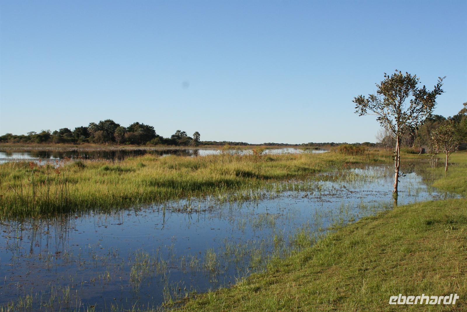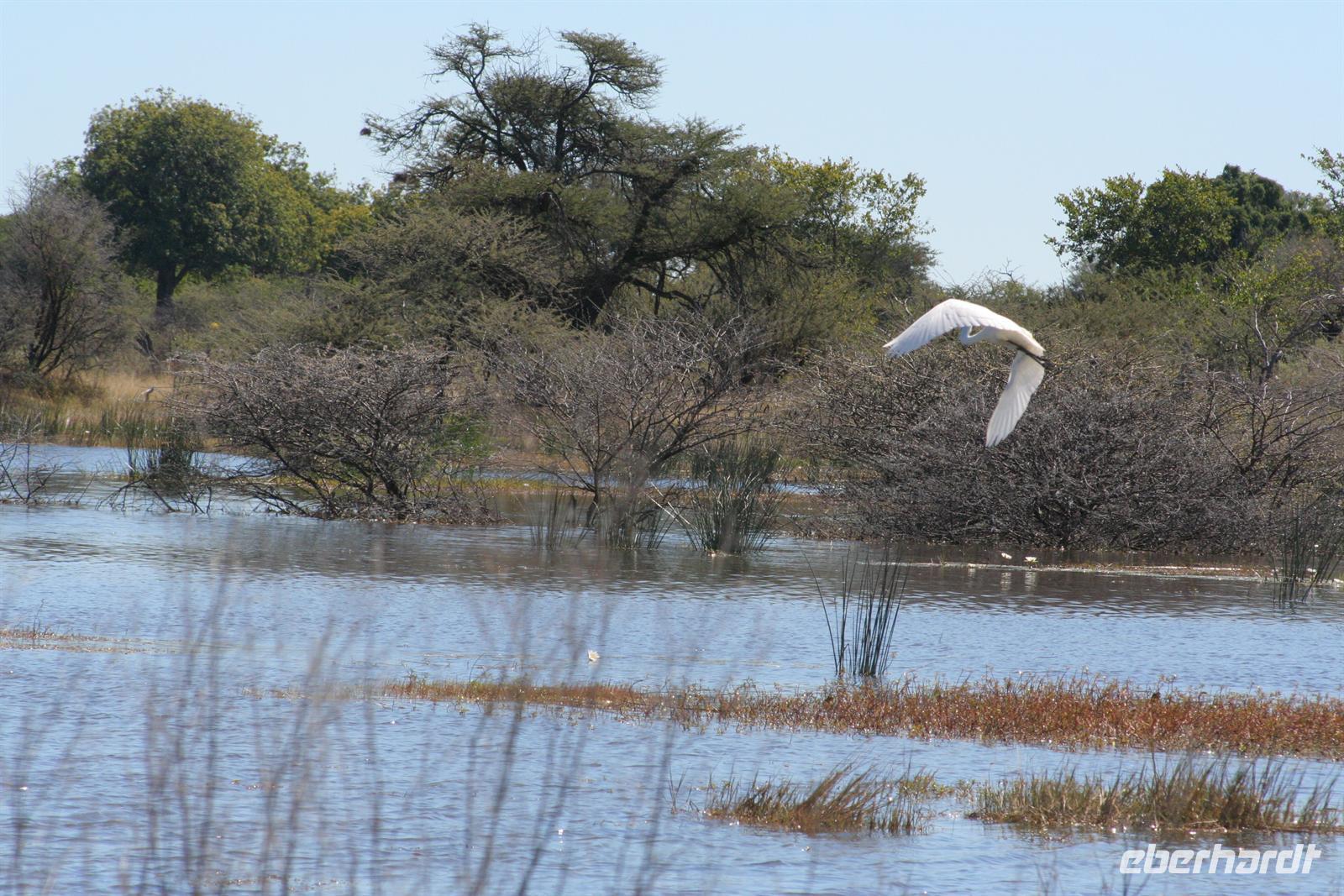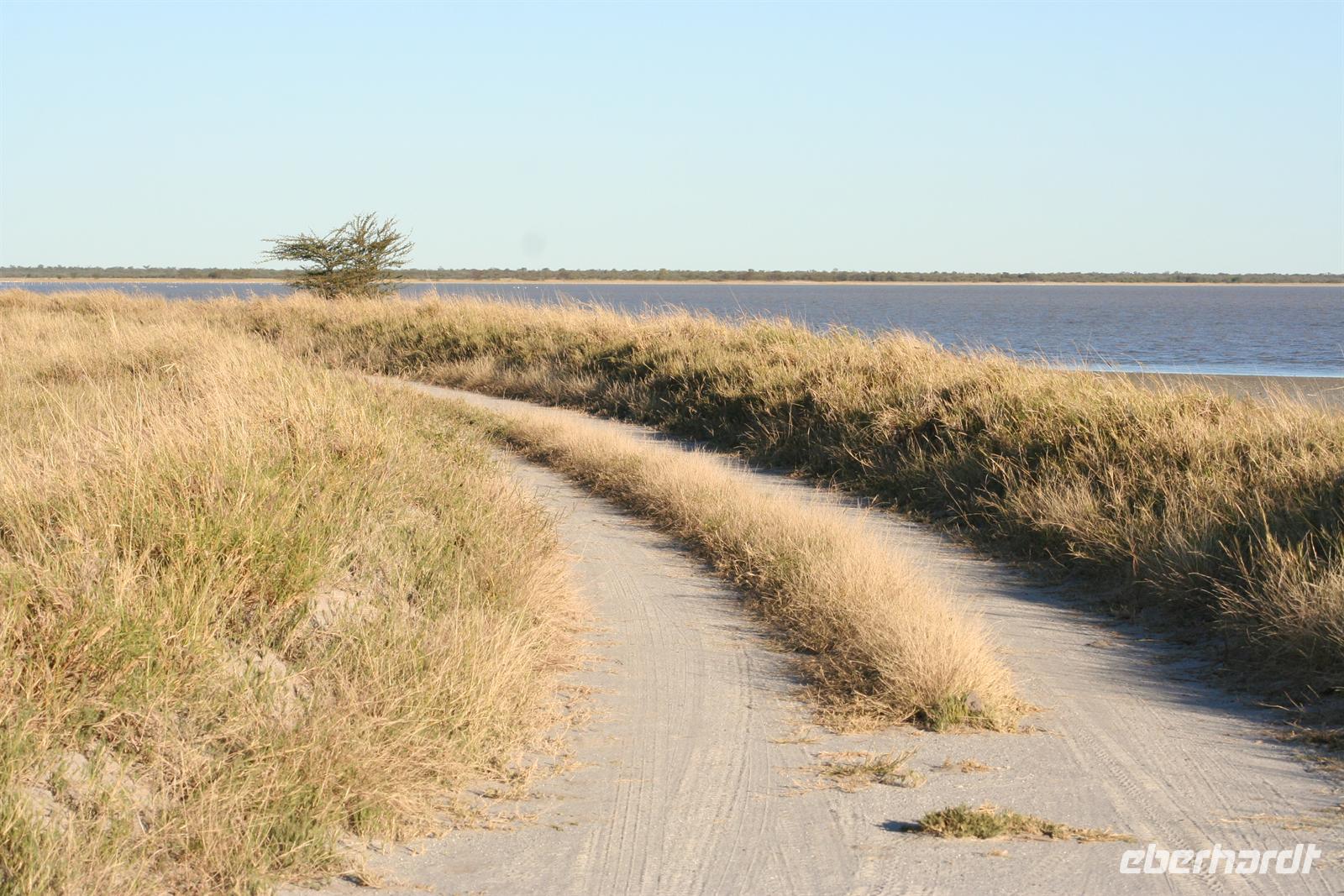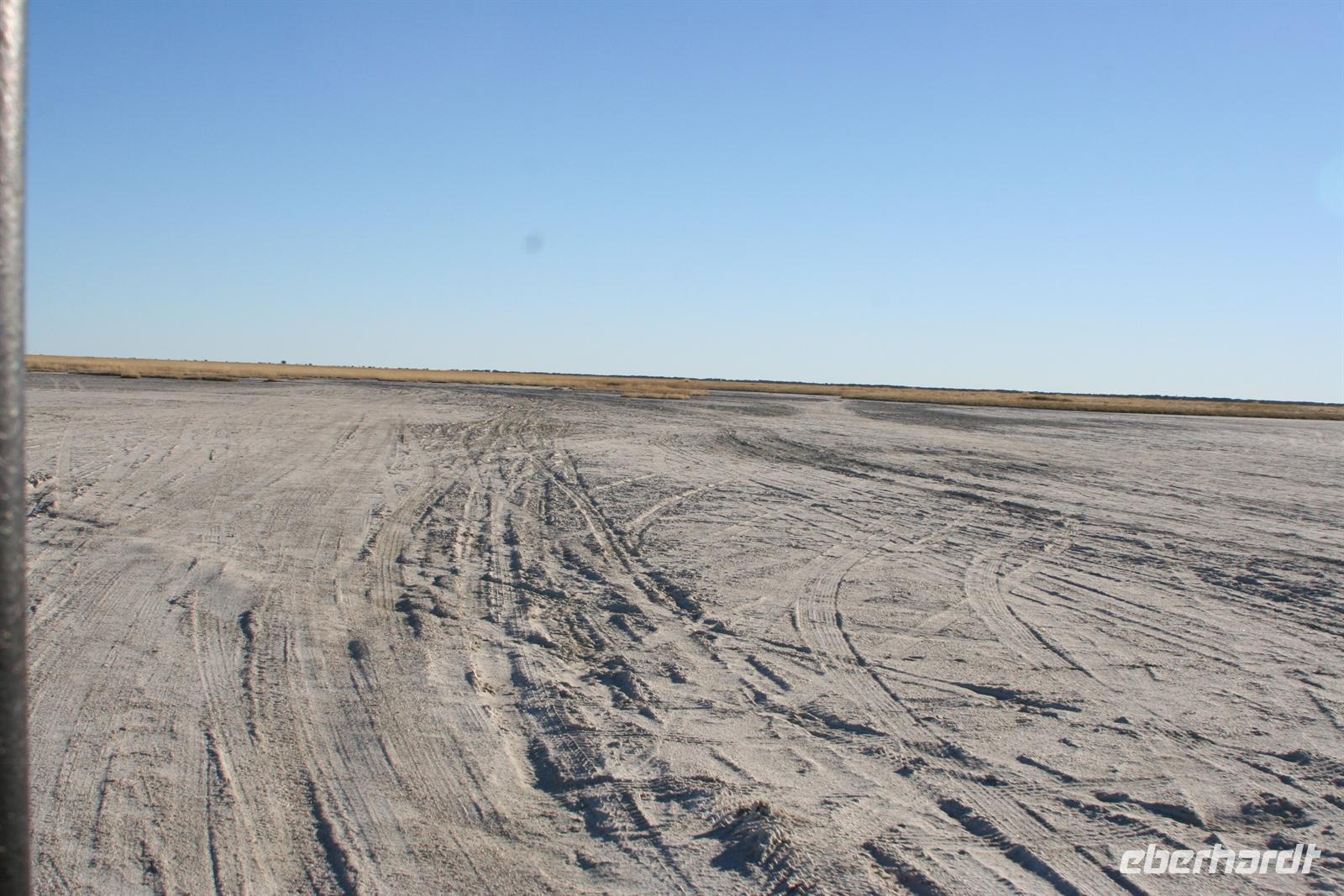 Hier gibt es keine Straßen, man kann die Wege nur erahnen. Deshalb sollten nur geübte Allradfahrer, dieses Gelände allein erkunden. Unterwegs versetzte uns die unendliche, ebene Weite ins Staunen, eine faszinierende Unwirklichkeit. Für uns unvorstellbar, dass hier noch vor 10.000 Jahren ein "Riesensee" (60.000 km2) war, der aber verdunstete. In der trockenen Zeit kann man kaum glauben, dass sich das Gebiet nach der Regenzeit in eine ausgedehnte Seenlandschaft verwandelt, die Massen von Tieren und Vögeln anzieht. Da wir Ende Mai/Anfang Juni reisten, sahen wir noch viele, kleine "Seen" und eine noch gut, gefüllte Sowa-Pfanne, die wie Kristall glänzte. Streifengnus, Schabrackenschakale, Impalas, Gackeltrappen, Strauße und Kronenkraniche durchstreiften das Gelände und am Wasser tummelten sich Flamingos und Pelikane, natürlich auch Mücken.