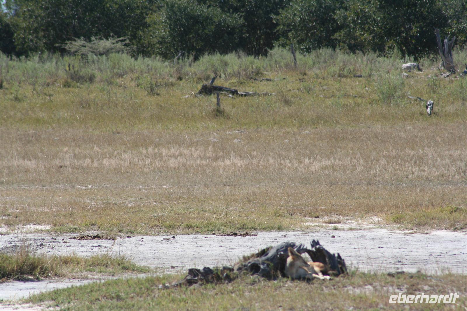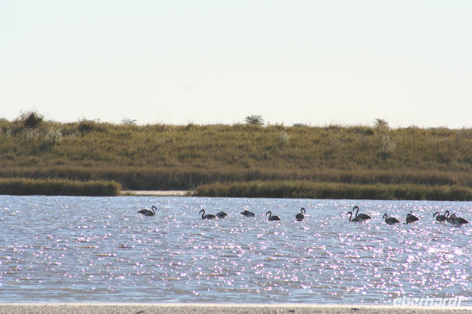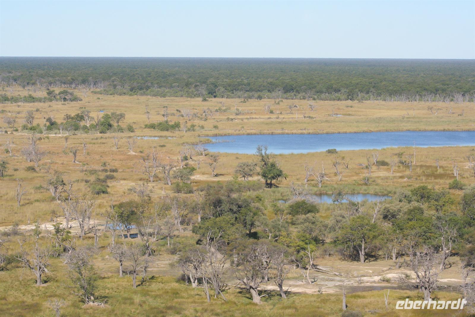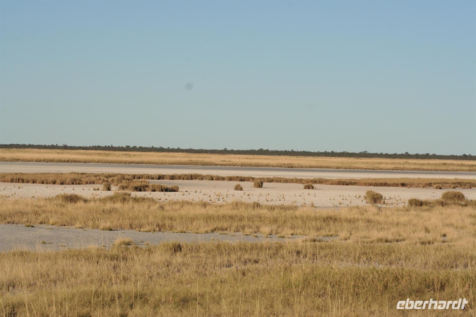 Hier gibt es keine Straßen, man kann die Wege nur erahnen. Deshalb sollten nur geübte Allradfahrer, dieses Gelände allein erkunden. Unterwegs versetzte uns die unendliche, ebene Weite ins Staunen, eine faszinierende Unwirklichkeit. Für uns unvorstellbar, dass hier noch vor 10.000 Jahren ein "Riesensee" (60.000 km2) war, der aber verdunstete. In der trockenen Zeit kann man kaum glauben, dass sich das Gebiet nach der Regenzeit in eine ausgedehnte Seenlandschaft verwandelt, die Massen von Tieren und Vögeln anzieht. Da wir Ende Mai/Anfang Juni reisten, sahen wir noch viele, kleine "Seen" und eine noch gut, gefüllte Sowa-Pfanne, die wie Kristall glänzte. Streifengnus, Schabrackenschakale, Impalas, Gackeltrappen, Strauße und Kronenkraniche durchstreiften das Gelände und am Wasser tummelten sich Flamingos und Pelikane, natürlich auch Mücken.