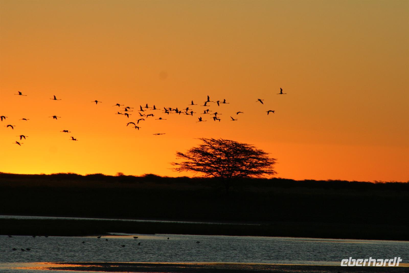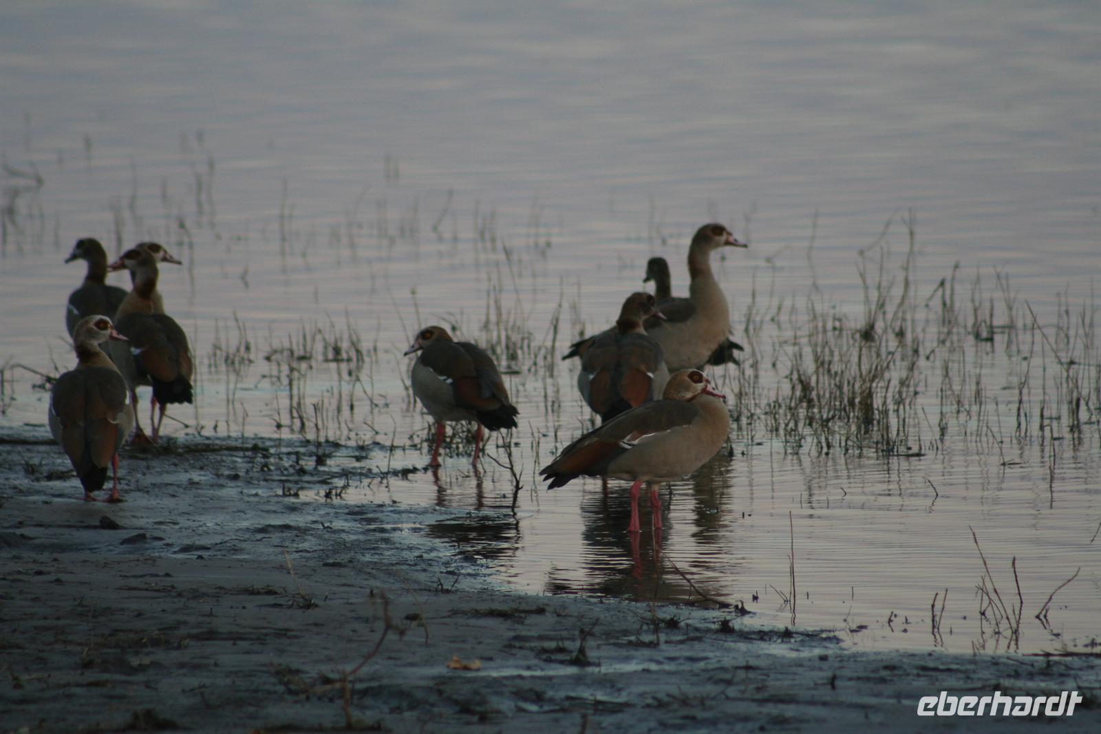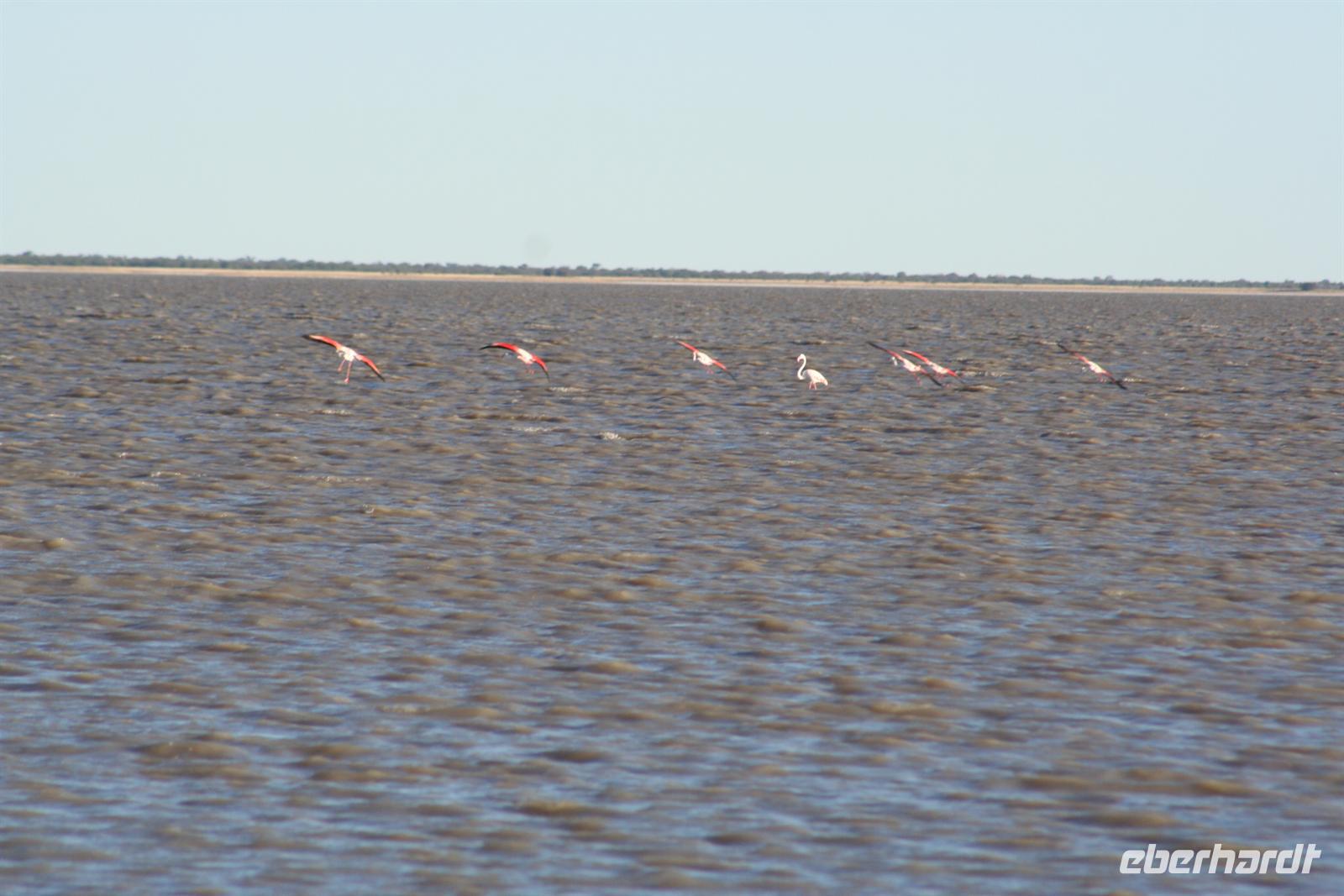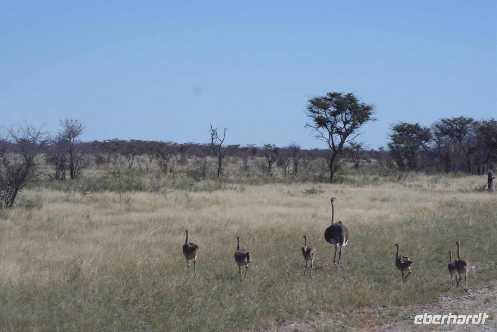 Hier gibt es keine Straßen, man kann die Wege nur erahnen. Deshalb sollten nur geübte Allradfahrer, dieses Gelände allein erkunden. Unterwegs versetzte uns die unendliche, ebene Weite ins Staunen, eine faszinierende Unwirklichkeit. Für uns unvorstellbar, dass hier noch vor 10.000 Jahren ein "Riesensee" (60.000 km2) war, der aber verdunstete. In der trockenen Zeit kann man kaum glauben, dass sich das Gebiet nach der Regenzeit in eine ausgedehnte Seenlandschaft verwandelt, die Massen von Tieren und Vögeln anzieht. Da wir Ende Mai/Anfang Juni reisten, sahen wir noch viele, kleine "Seen" und eine noch gut, gefüllte Sowa-Pfanne, die wie Kristall glänzte. Streifengnus, Schabrackenschakale, Impalas, Gackeltrappen, Strauße und Kronenkraniche durchstreiften das Gelände und am Wasser tummelten sich Flamingos und Pelikane, natürlich auch Mücken.