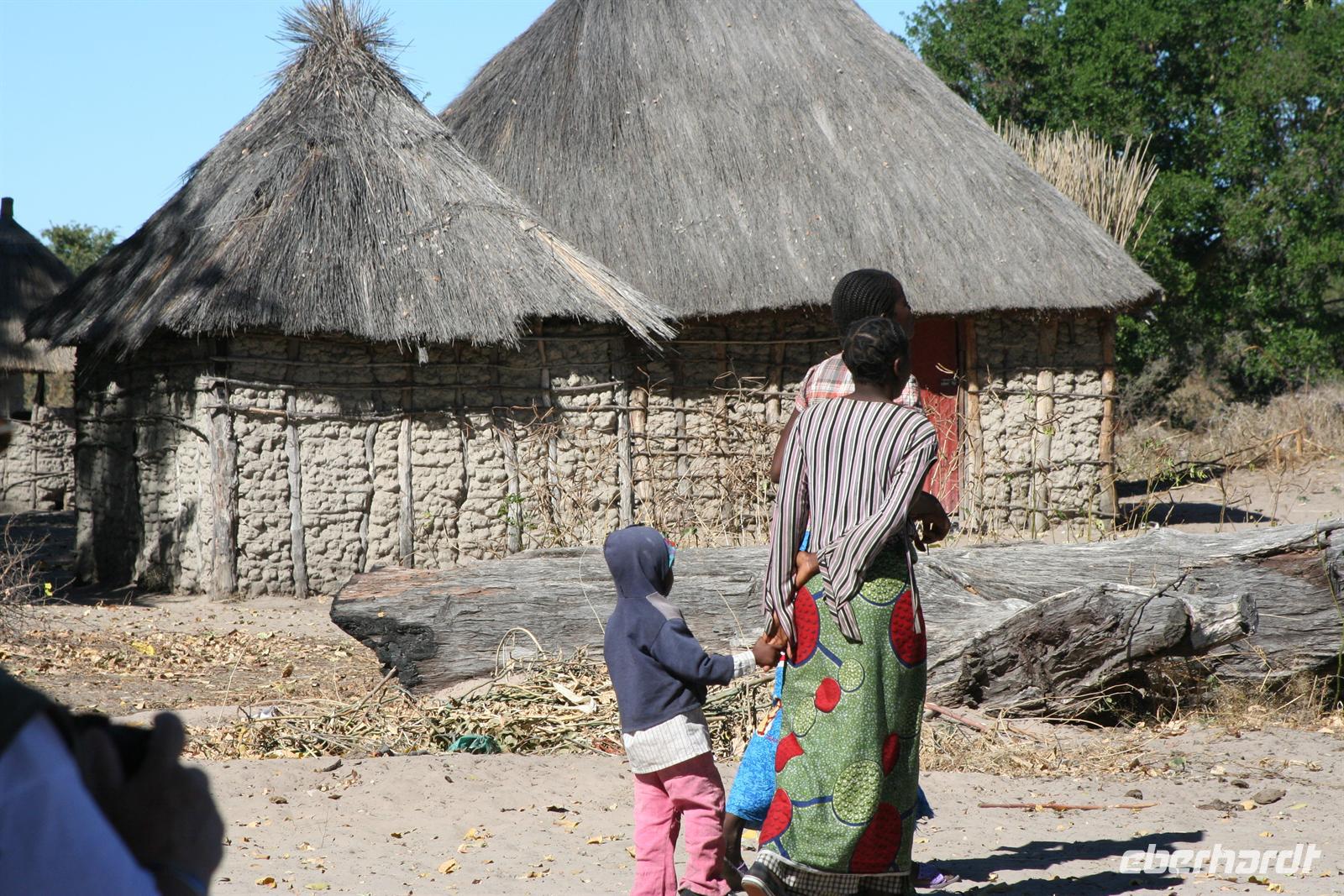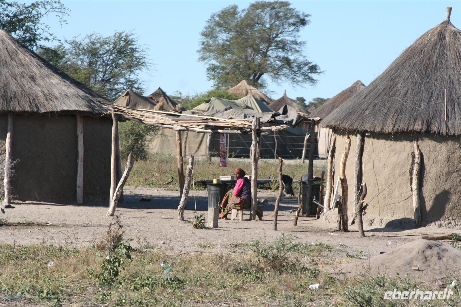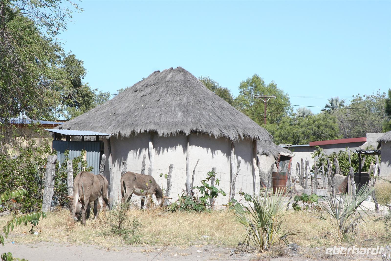Nach einem entspannten Frühstück verstauten wir unsere Koffer im Bus und fuhren am südlichen Rand zur östlichen Seite des Okavango-Deltas. Die asphaltierte, wenig befahrene Straße führte uns durch verstreute, kleine Ortschaften. Hier gingen die Menschen ihrem täglichen Leben nach. Zum Sonntag ging es natürlich in die Kirchen oder man fuhr mit dem Eselkarren zu Sonntagsbesuchen. Rinder weideten in den Büschen rechts und links der Straße, Elefanten suchten sich, ebenso wie die Esel schattige Plätze untern den Bäumen. Auch wir pausierten unter einem schattigen Baum beim obligatorischen Mittagspicknick und nutzen die "Buschtoi". Gegen 13 Uhr erreichten wir Etsha. In der Ortschaft Etsha leben 13 Hambukushu-Clans, die ursprünglich aus Angola stammen. Deshalb besteht Etsha aus 13 Dörfern, die ebenso nummeriert sind.