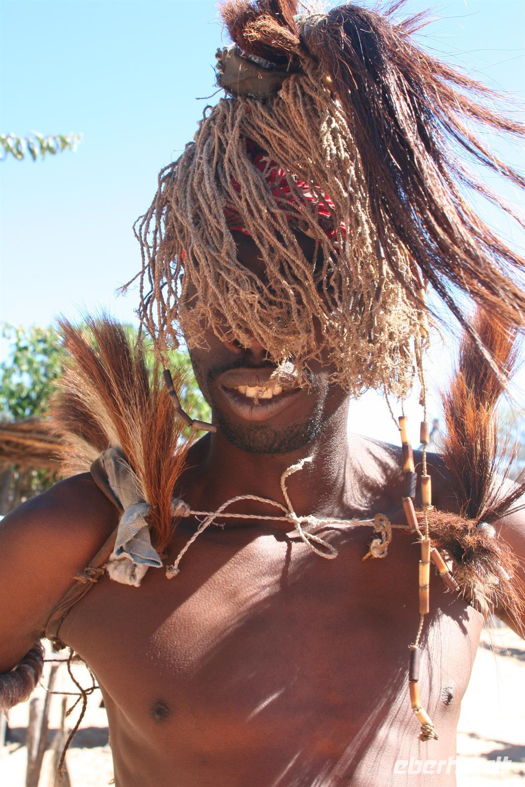 Wir waren beeindruckt und bedankten uns für die Gastfreundschaft. Anschließend besuchten wir ein "Culture Village", also ein "künstliches" Dorf, wo wir auf eine ganz andere Art und Weise Einblicke in die Kultur und auch frühere Lebensweise erhielten: Wie ist so ein Dorf aufgebaut, wie wohnt man, wer geht welcher Arbeit nach, wie baut und stellt man Fallen, was wird gekocht und gegessen, was ist ein Sangoma (Medizinmann) und wie wird getanzt und gesungen. Auch dieser Besuch war interessant und spannend, zu mal wir verschiedene Dinge auch selbst ausprobieren konnten, wie Schmiedearbeiten, Fallen stellen oder ins Horn blasen, um Flusspferde nachzuahmen. Nach dem uns der Sangoma persönlich begrüßte, wurde gesungen und getanzt.