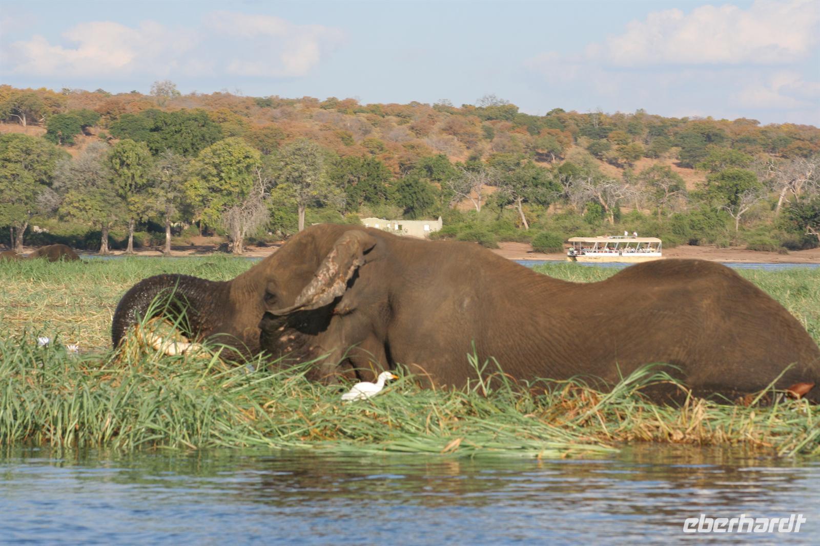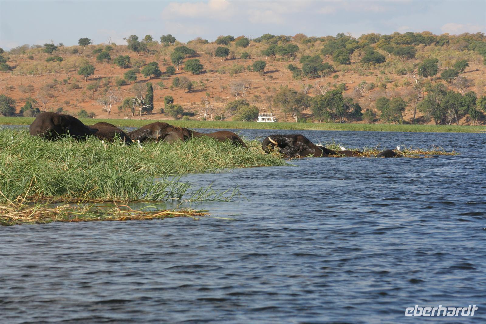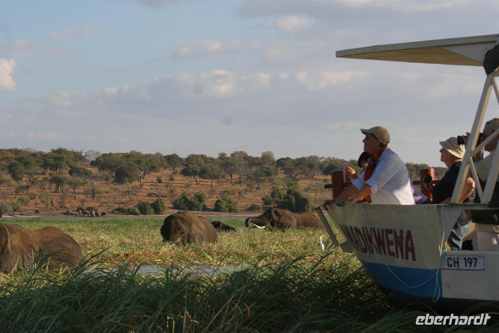 , Wasserwarane und Krokodile am Ufer. Bald darauf wurde es noch "tierischer": Elefantenherden, Giraffen, Flusspferde, Wasserböcke kamen am späten Nachmittag zum Fluss, um zu trinken. Tom war mit seinen fachmännischen Erklärungen immer präsent. Zwar wimmelte es von Booten auf dem Fluss, aber der Chobe ist so groß und es gibt aller 100 m Tiergruppen, so dass kein Gedränge entstand. Der Vorteil unseres kleinen, flachen Bootes war, dass wir überall hinkamen, ohne auf Grund zu laufen. In der Mitte des Flusses entdeckten wir plötzlich eine Elefantengruppe, die bauchhoch im Wasser graste. Natürlich fuhren wir hin, mußten aber immer wieder auf die gefährlichen Flusspferde achten, die man nicht so schnell im Wasser sieht. Auf 3 m waren wir dann an den grauen Riesen dran, die sich ganz ungestört von uns beobachten liessen. Auch die weißen Kuhreiher konnten die Elefanten nicht aus der Ruhe bringen. Auf dieses einzigartige, unvergessliche Erlebnis leerten wir die Bar und stießen gemeinsam an.