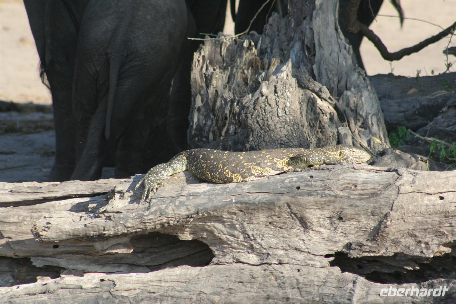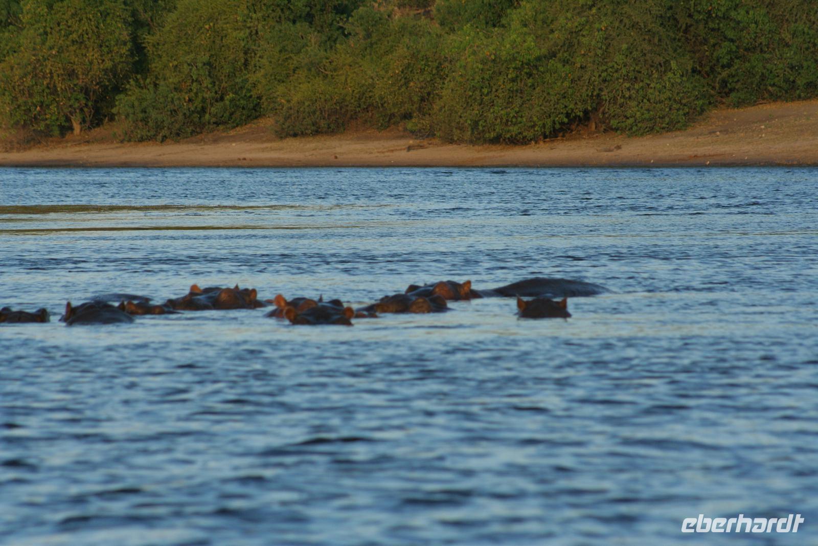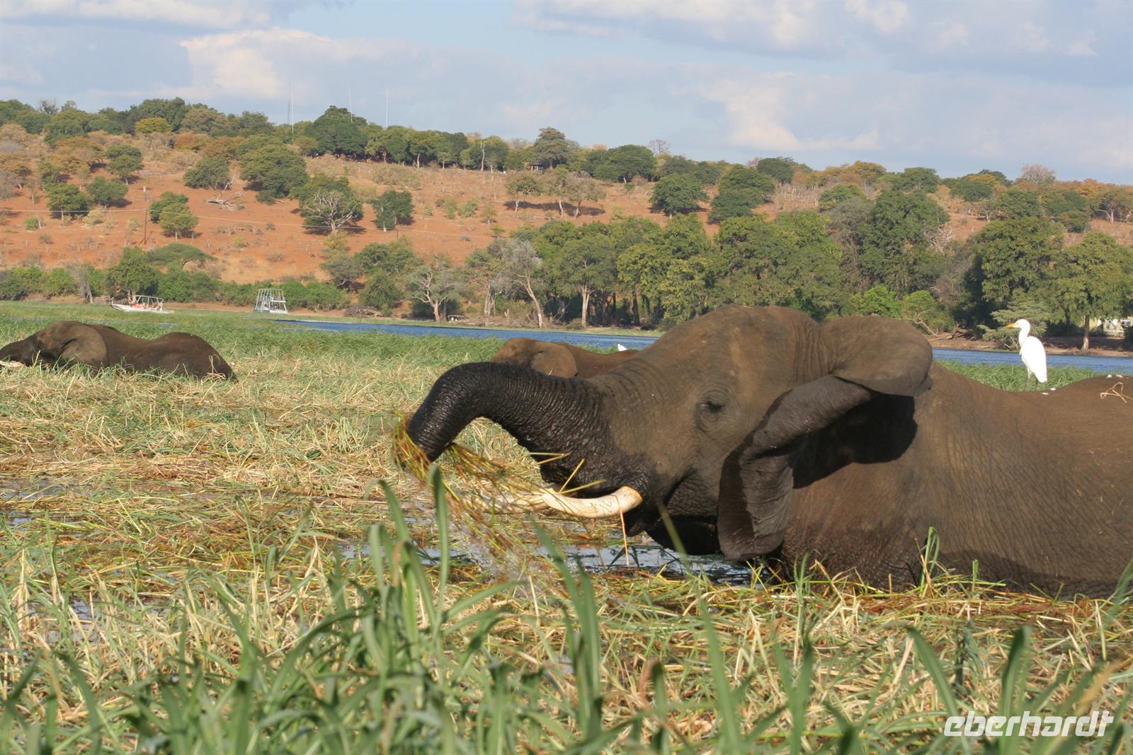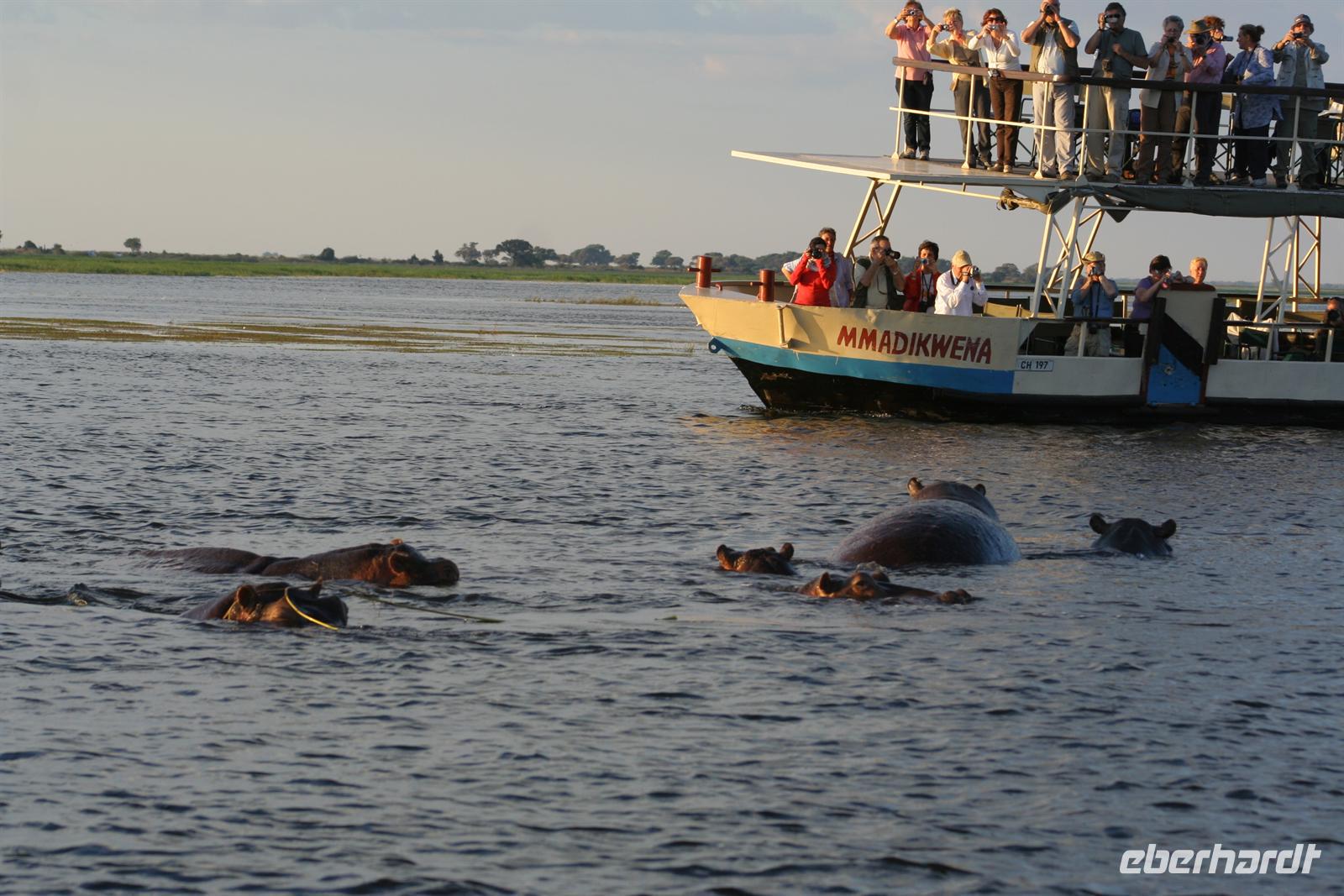 , Wasserwarane und Krokodile am Ufer. Bald darauf wurde es noch "tierischer": Elefantenherden, Giraffen, Flusspferde, Wasserböcke kamen am späten Nachmittag zum Fluss, um zu trinken. Tom war mit seinen fachmännischen Erklärungen immer präsent. Zwar wimmelte es von Booten auf dem Fluss, aber der Chobe ist so groß und es gibt aller 100 m Tiergruppen, so dass kein Gedränge entstand. Der Vorteil unseres kleinen, flachen Bootes war, dass wir überall hinkamen, ohne auf Grund zu laufen. In der Mitte des Flusses entdeckten wir plötzlich eine Elefantengruppe, die bauchhoch im Wasser graste. Natürlich fuhren wir hin, mußten aber immer wieder auf die gefährlichen Flusspferde achten, die man nicht so schnell im Wasser sieht. Auf 3 m waren wir dann an den grauen Riesen dran, die sich ganz ungestört von uns beobachten liessen. Auch die weißen Kuhreiher konnten die Elefanten nicht aus der Ruhe bringen. Auf dieses einzigartige, unvergessliche Erlebnis leerten wir die Bar und stießen gemeinsam an.