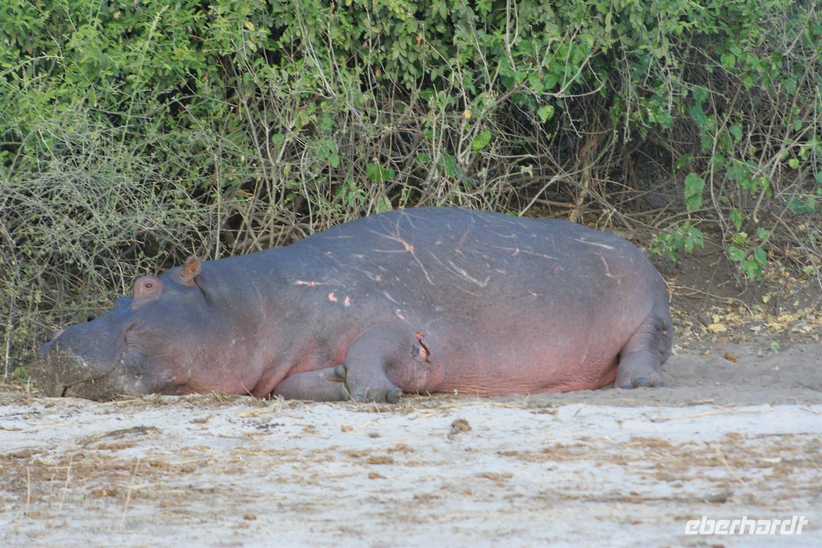 Mit dem Schnaufen und Grunzen der Hippos schliefen wir ein, was mir persönlich etwas schwieriger gelang. Der "Gesang" hörte sich an wie ein "Chor" von 1.000en Hippos, die immer näher kamen und auch direkt an meinem Zelt vorbei marschierten (wie die frischen Spuren am nächsten Morgen bewiesen).