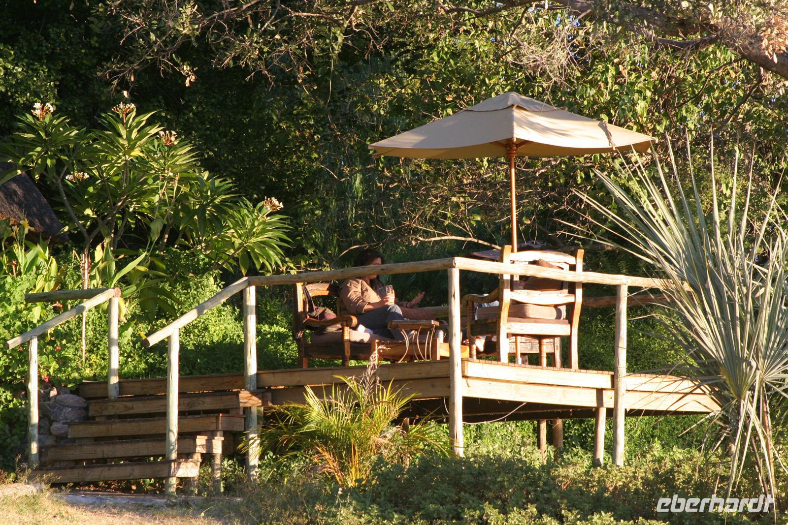 Die Zeltcahalets sind etwas einfacher, als die luxuriösen Unterkünfte der letzten Tage, aber sauber und man hat alles was man braucht. Die herrliche Lage, direkt am Wasser, die Ruhe und die Freundlichkeit des Personal versprechen auch hier einen perfekten Aufenthalt. Die kleine Insel ist nur wenige Meter breit und einige Hundert Meter lang. Im östlichen Teil befinden sich das Mainhouse und die Zeltchalets, am anderen Ende der Camping-Site mit Safari-Zelten auf Stelzen (gemeinschaftliche Sanitäranlagen), Grillplatz, Bar und Aussichtsterrasse. Da die Lodge nur wenige Zeltchalets hat und in unserer Gruppe viele Alleinreisende waren, bezogen Jens (Abenteurer, Afrika-Fan und langjähriger Stammkunde) und ich je ein Safarizelt. Das war Abenteuer pur, zumal gleich an unseren Zelten die frischen Hippo-Spuren sichtbar waren! Aber wir wollten ja das Abenteuer, in welches wir am Nachmittag eintauchten. Nach einem Käffchen und lecker selbst gebackenem Kuchen unternahm die ganze Gruppe einen fakultativen Bootsausflug ins Delta zum Sonnenuntergang mit "Sundowner". Wir sahen 2 Krokodile, Bienenfresser, Papyrus und einen wiederum fantastischen Sonnenuntergang, bevor wir vorzüglich von Nookie zum Abend bewirtet wurden.