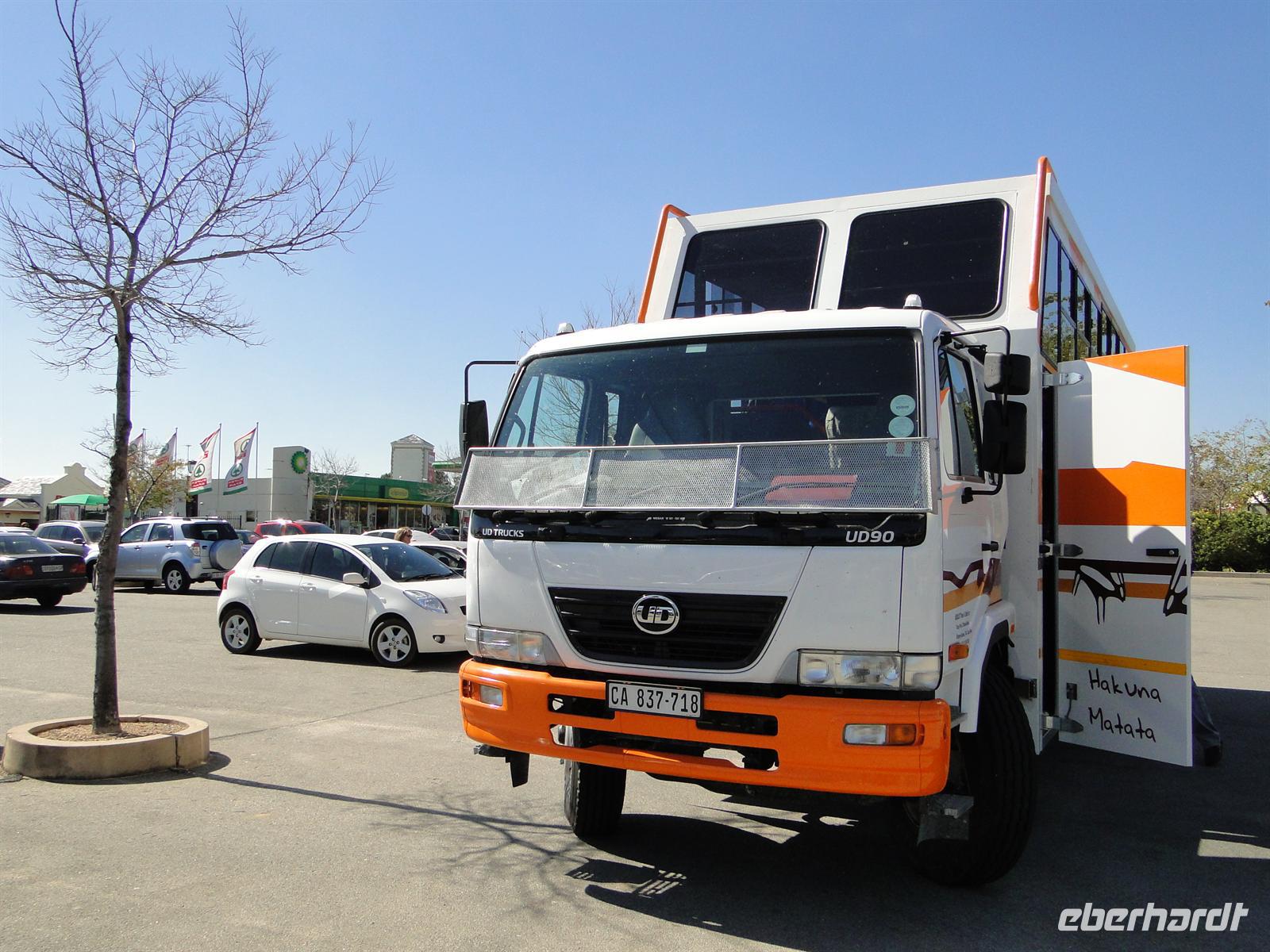 Direkt am Flughafen versorgten wir uns mit Südafrikanischen Rands. Da ich ja weiss, dass die Europäer (= Schweizer) die Uhr erfunden haben und die Südafrikaner die Zeit, auch beim Geldwechsel, sammelte ich die diversen Umtauschwünsche der Reisegäste und tauschte das Geld. Die Verteilung erfolgte dann im Bus, so hatten wir jede Menge Zeit gespart. Am Bus oder besser gesagt Expeditionsfahrzeug begrüßte uns Ernst, unser Fahrer und waschechter Herero aus Namibia.