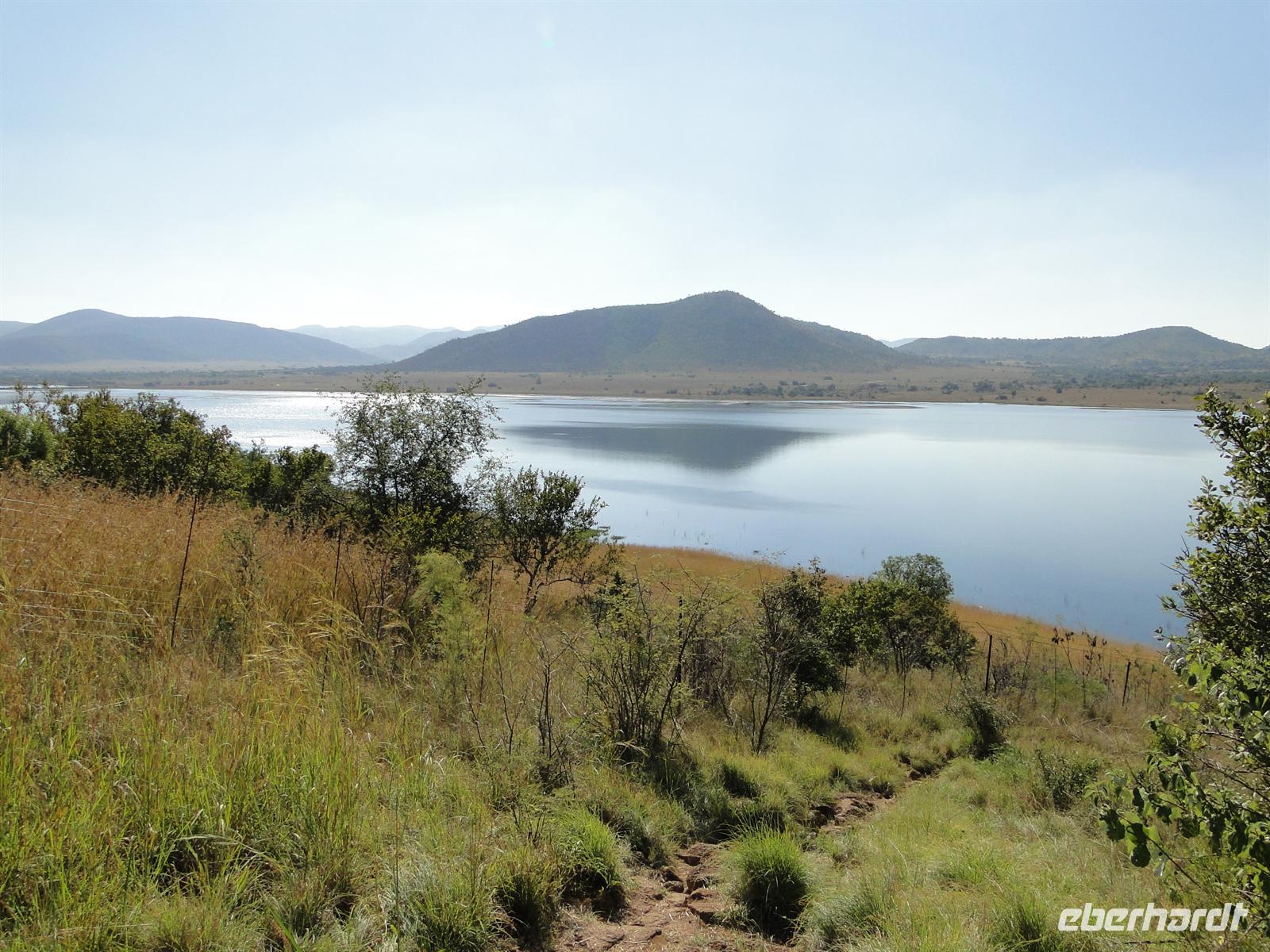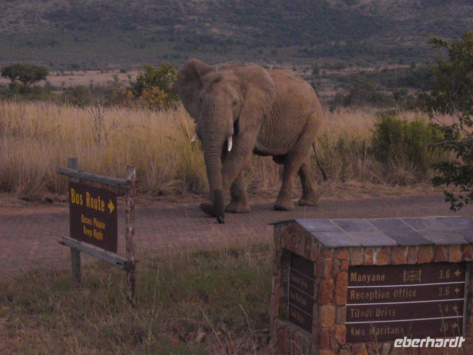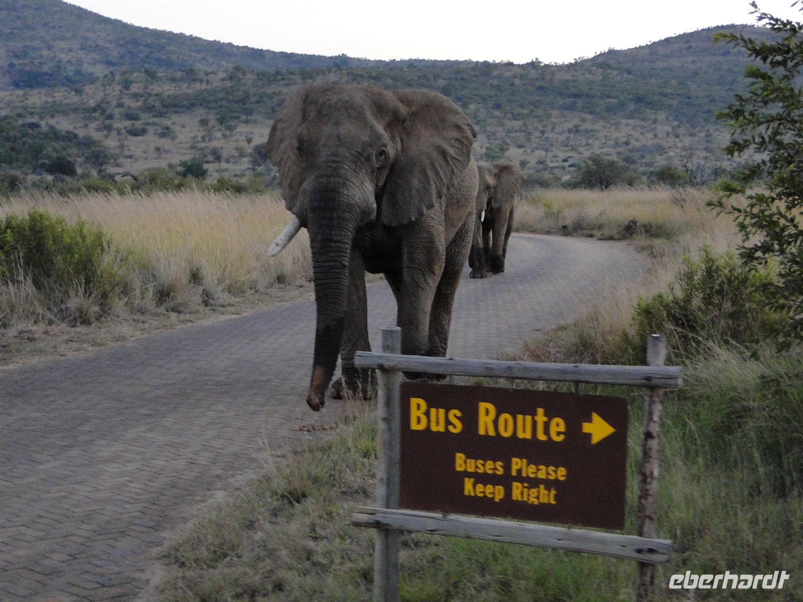 Auf unserer Wanderung zurück erfuhren wir Interessantes über verschiedene Pflanzen und Büsche und konnten auch selbst erste Spuren lesen. Schnell verging die Zeit und die viele frische Luft stärkte unser Verlangen nach Frühstück, es war schon 10:30 Uhr. In der Lodge war das Frühstücksbuffet noch reichlich bestückt, so dass wir es uns schmecken liessen. Am Mittag durchstöberten wir dann mit unserem Bus den Park. Unterwegs begegneten uns Zebras, Nashörner, Dassys, Warzenschweine, Springböcke, Impalas, Elefanten, Strauße, Gnus, Giraffen ...... Am Fish Eagle Aussichtspunkt picknickten wir mit fantastischen Ausblick auf den Mankwe Damm. Die aufdringlichen Meerkatzen ignorierten unser aufgebautes Buffet, sie hatten sich schon ausgiebig und frech bei einer anderen Familie bedient. Um das Programm im Pilanesberg NP komplett zu machen, unternahmen wir am späten Nachmittag noch eine Pirschfahrt im Jeep. Unseren Ranger Patrick "instruierten" wir, dass uns für heute noch die Grosskatzen in der Sammlung fehlten. Also auf zur Katzen-Safari! Gleich darauf hatten wir ein lustiges Date mit einem von "Leoparden" besetzten Jeep. Ein motorisiertes "Rudel" Touristen in Leoparden-Decken eingehüllt war ebenfalls auf der Suche nach großen Tieren. Nach dem wir einen Elefanten-Angriff erfolgreich abgewehrt hatten und es schon dunkel war, folgten wir der Löwen-Spur.