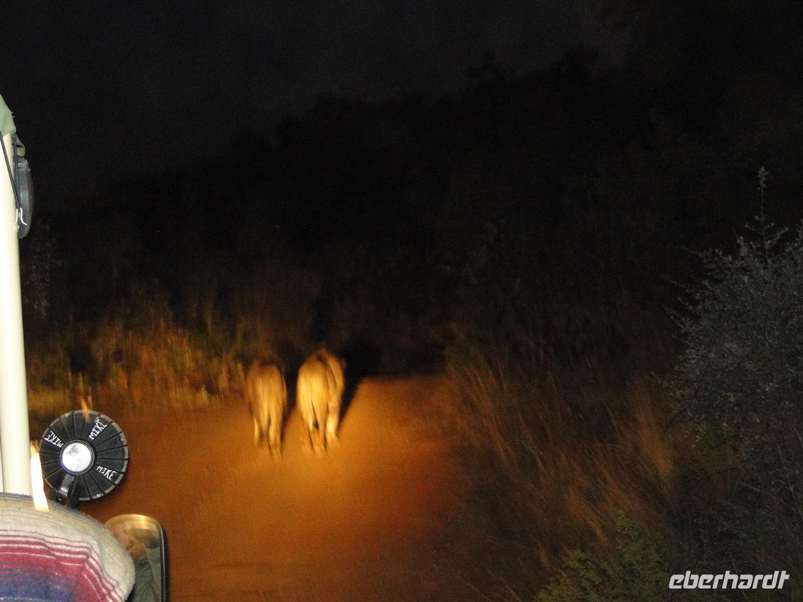 Später dann, in einem etwas unwegsamen Gelände, kamen 2 Löwenpaare aus dem Busch und spazierten gemütlich eine Weile vor unserem Jeep her, bis sie wieder im Dickicht verschwanden. Die Ausbeute an unserem ersten Safaritag war nicht schlecht. Zum Abendessen gab es heute leckeres Chicken-Curry und andere Köstlichkeiten. Jens, unser Geburtstag"kind" wurde mit einer Riesentorte überrascht. Das perfekte Kerzenausblasen muß aber noch geübt werden!
