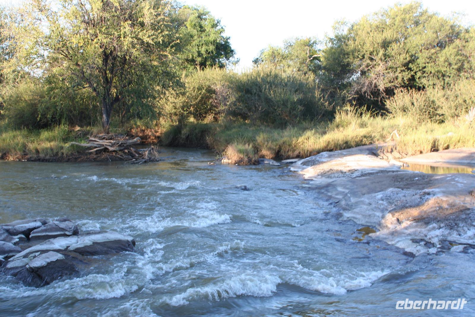 Unsere Reise führte uns ca. 350 km in nordöstliche Richtung, durch Thabazimbi und Lephalale zur Grenze nach Martins Drift/Groblers Bridge. Unterwegs picknickten wir natürlich wieder. Ausreise- und Einreiseformulare erledigt und schon waren wir in Botswana. Überall im Land gibt es Veterinärschleusen und -zäune, die zur Prophylaxe und Vorbeugung von Seuchen errichtet worden. So auch an der Grenze. Mit unseren Zweitschuhen in der Hand mußten wir aussteigen, über die Seuchenmatte laufen und auch das zweite Paar Schuhe auf der Matte abstreifen. Tom hatte uns schon am Vorabend informiert, dass wir ein zweites Paar Schuhe oben im Bus haben, um nicht erst in unseren Koffern kramen zu müssen. Die Kontrolleure wissen nämlich genau, dass man nicht nur mit ein Paar Schuhen (an den Füßen) verreist. Gleich hinter der Grenze an einer Tanke deckten wir uns mit der neuen Währung, dem "Pula" ein. Noch ein kurzes Stück in östlicher Richtung entlang des Limpopo und schon erreichten wir am Nachmittag die wunderschöne "Lotsane Lodge". Die komfortable, familiär geführte Lodge, am Ufer des Lotsane Flusses gelegen, befindet sich einem großen, privaten Jagdgelände am Rande des Tuli Blocks. Von den Managern Aline und Tom, beide auch zertifizierte, passionierte Jäger samt ihrem Baby wurden wir herzlich mit einem Sherry begrüßt.