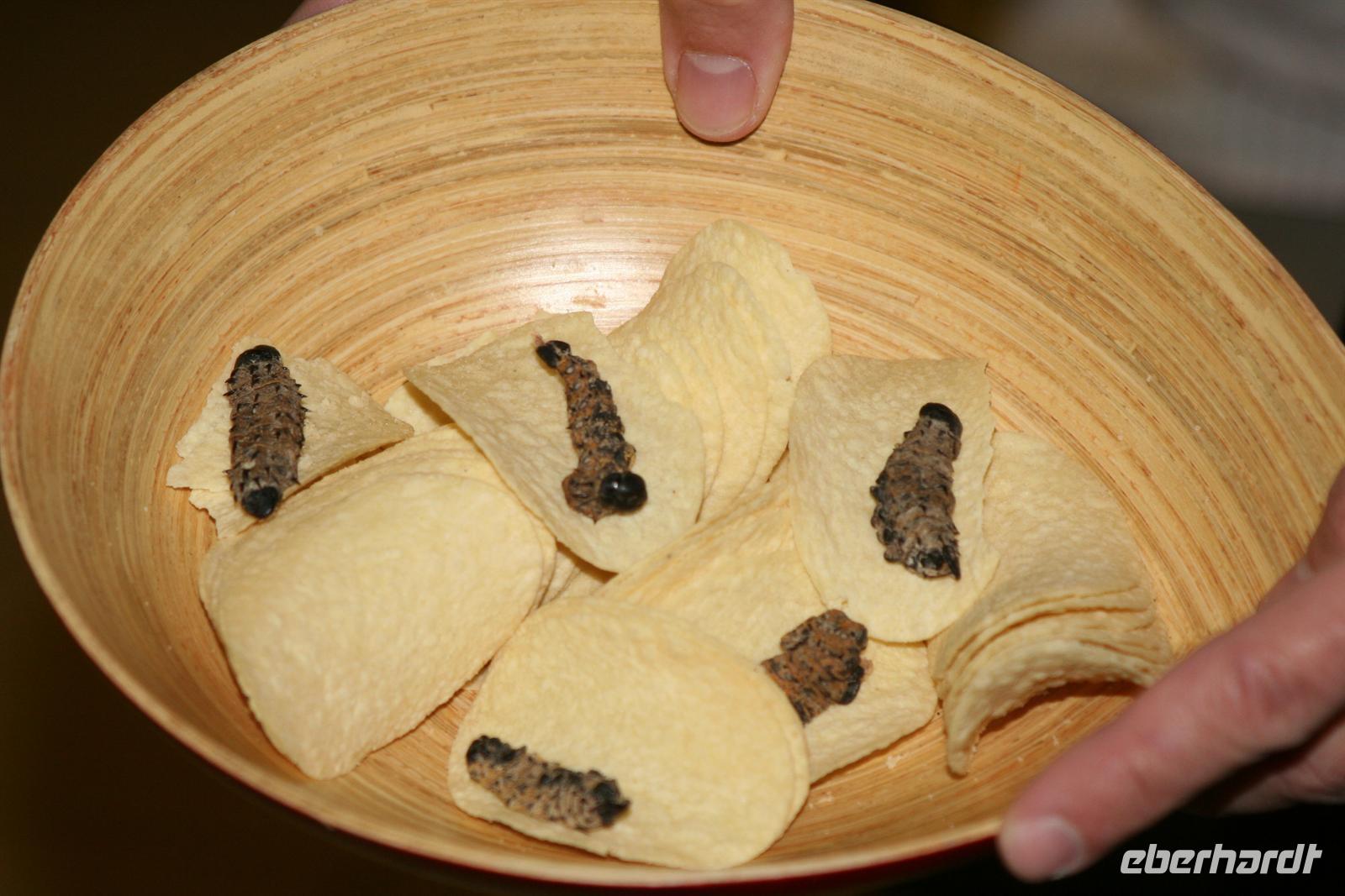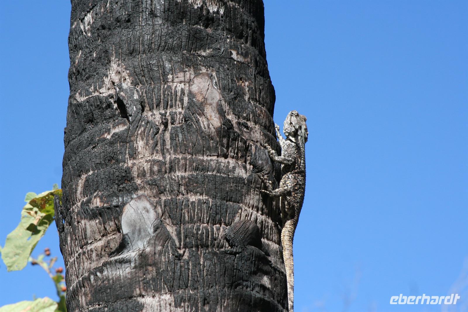 Nach einem liebevoll zubereiteten Frühstück bildeten wir wieder 2 kleine Gruppen, um die Aktivitäten noch intensiver erleben zu können. Die eine Gruppe startete mit dem passionierten Jäger Tom zu einer Wanderung, die andere ging auf Jeep-Safari mit Tom, unserem Guide durch das 4.500 ha große Gelände. Entlang des Flussbettes des Lotsane wanderten wir bis zum Zusammenfluss mit dem Limpopo - ein heiliger Ort der Einheimischen. Unterwegs wurden wir in die Geheimnisse des Spurenlesens eingeweiht, interessante und spannende Geschichten über Flora und Fauna erzählt. Wir probierten Kaktusfeigenfrüchte, checkten einen Termitenhügel, rannten auf dem Ameisen-Highway um die Wette, schnüffelten in Dachskuhlen und beobachteten natürlich jede Menge Tiere wie Wasserböcke, Buschböcke, Impalas, Warzenschweine, einen Fish Eagle, Schildkröten, Schnecken, Krokodile und einen King Fisher. Ein Mitarbeiter der Lodge machte auch einen kleinen Umweg zu seiner Hütte, um uns die berühmten Mopane-Würmer zu kredenzen, eine Delikatesse für die Einheimischen. In guten Zeiten sammelt er ca. 70 kg Lebendgewicht.
