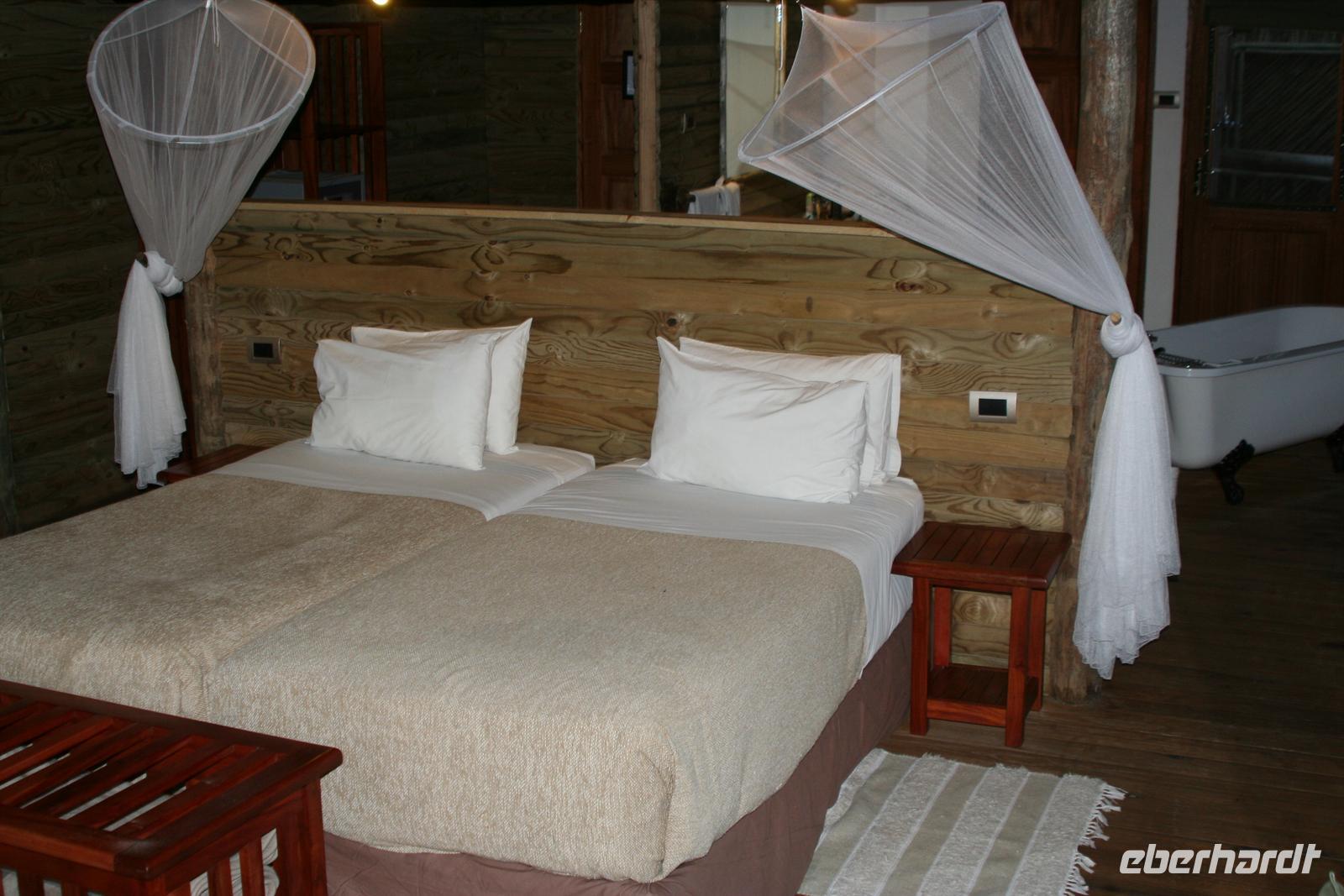 Die Chalets aus Stein sind sehr geschmackvoll eingerichtet, mit Dusche, Moskitonetz, Wasserkocher (Tee/Kaffee), Safe und eigener Terrasse. Wieder ein idealer Ort zum Wohlfühlen. Zu Abend genossen wir das ausgezeichnete Abendessen mit perpekten Service (3- Gänge, individuell aus der Karte wählbar) und eine gute Flasche Wein. Fast alle entschieden sich als Main für das "Special of the day" - Kudufleisch (entweder als Schnitzel oder Burger) - hm, einfach lecker. An diesem Tag gingen wir zeitiger schlafen, denn ein weiteres Highlight erwartete uns am nächsten Tag.