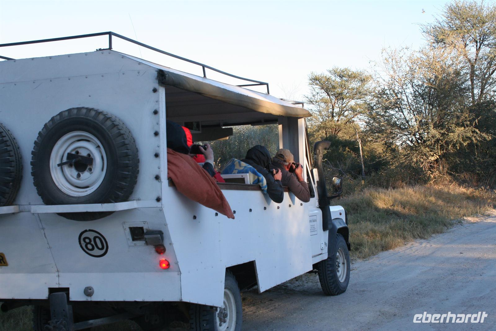 Um 5:30 Uhr trafen wir uns im Restaurant und stärkten uns mit Kaffee,Tee und Keksen, bevor wir eingehüllt in Decken und Jacken mit 2 offenen Fahrzeugen in Richtung Südtor des Wildreservats aufbrachen. Wir waren noch müde, es war noch kalt (ca.12 ° C) und die Straße holprig und staubig. Doch unsere Vorfreude und Spannung wischte die Unannehmlichkeiten des frühen Morgens weg. Auf einem schönen Campingplatz im Reservat frühstückten wir gemütlich mit heißen Kaffee oder Tee und packten unsere Lunchpakete aus. Auch wir entledigten uns der Decken, denn es wurde merklich wärmer. Gut gestärkt begannen wir unsere Pirschfahrt.