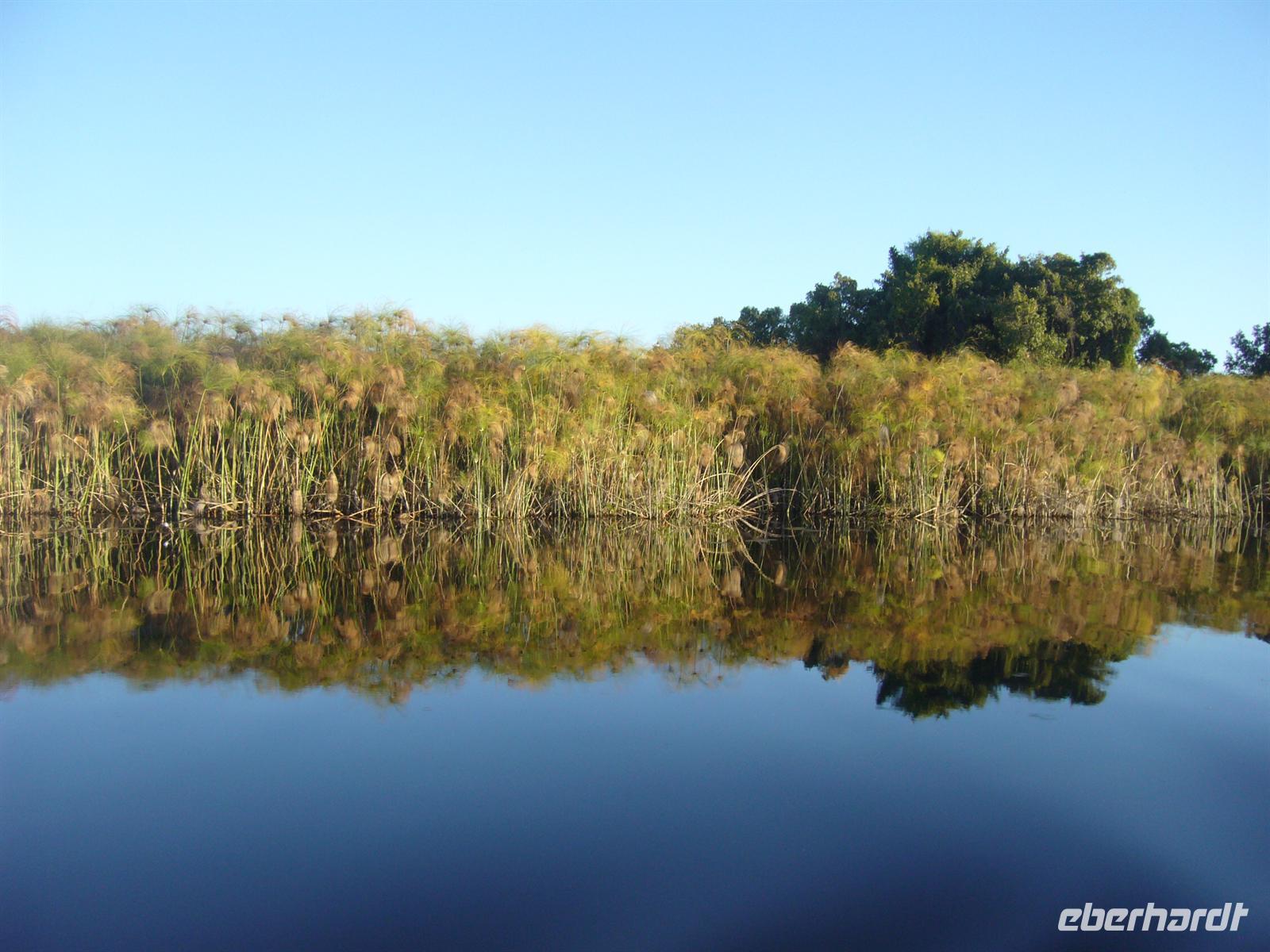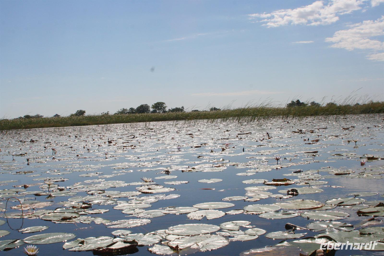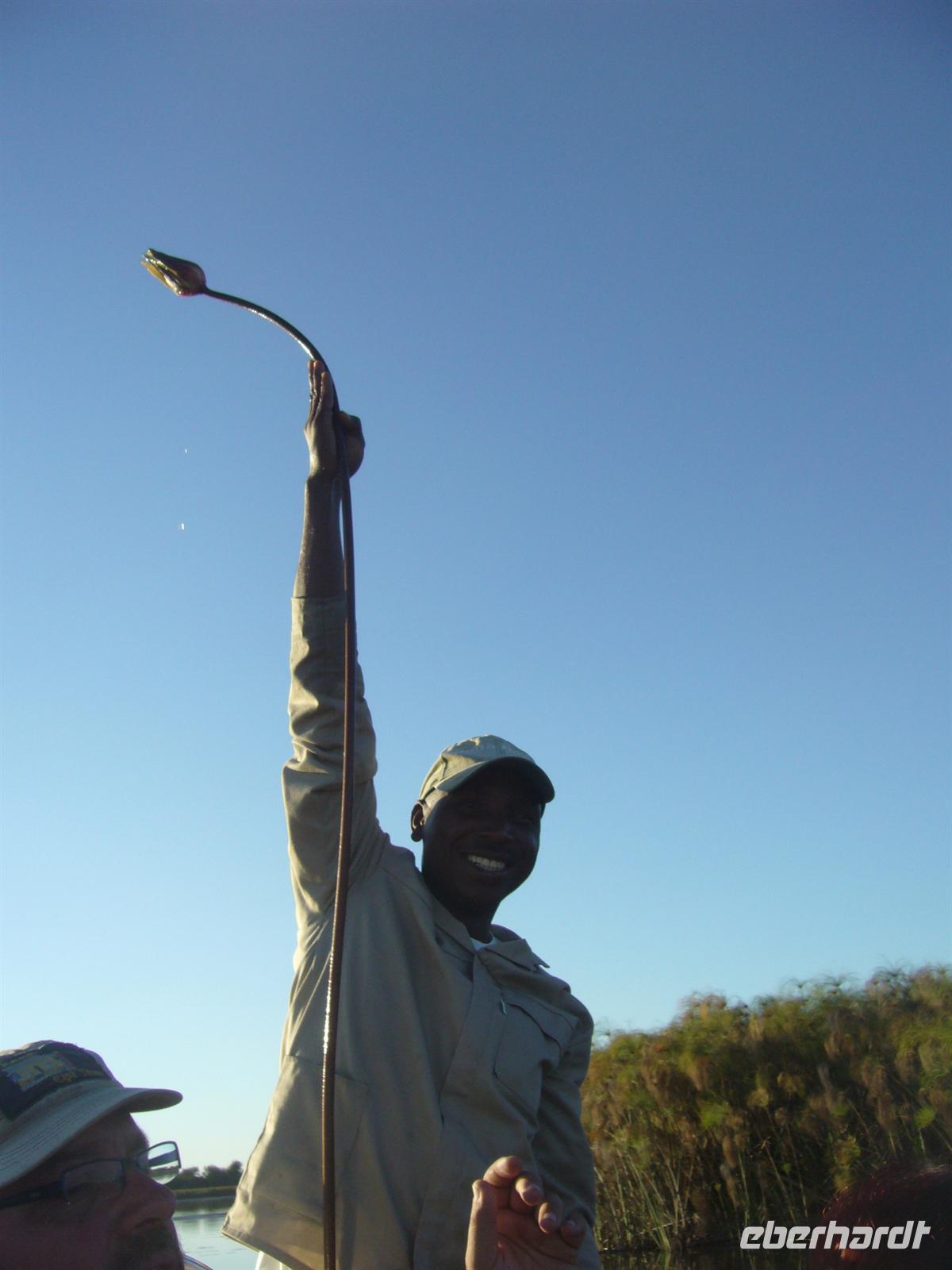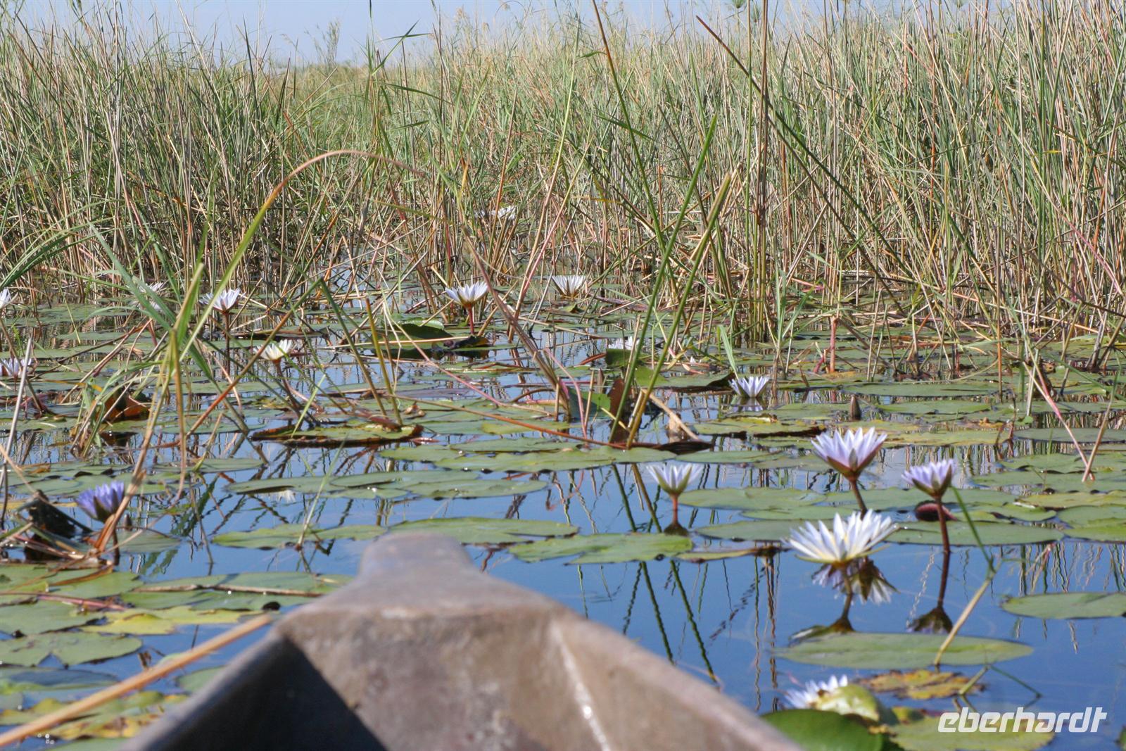 An diesem Tag erwartete uns wieder ein besonderes Abenteuer. Zunächst mit dem Motor-Aluboot fuhren wir auf den Hauptarmen in das immer dichter werdende Delta hinein. Kleine Papyrus-Inselchen durchzogen das Wasser, auf denen sich Teppiche von weiss blühenden Wasserlilien ausbreiteten. Später begrüßten uns einheimische "Poler" (Bootsführer) mit ihren Mokoros (Einbäume), in denen wir je zu zweit Platz nahmen. Lautlos glitten wir durch das seichte Gewässer des Deltas, das uns mit einer unwerfenden Schönheit zunächst sprachlos werden ließ. Die Sonne strahlte mit uns um die Wette. Unsere Poler erklärten uns viele Dinge über das Delta, deren Wasserläufe und dessen Flora und Fauna. Auch konnten sie Spuren im und am Wasser lesen. Die Einheimischen kannten sich im Wasserlabyrinth, für uns ein riesiger Irrgarten, bestens aus.