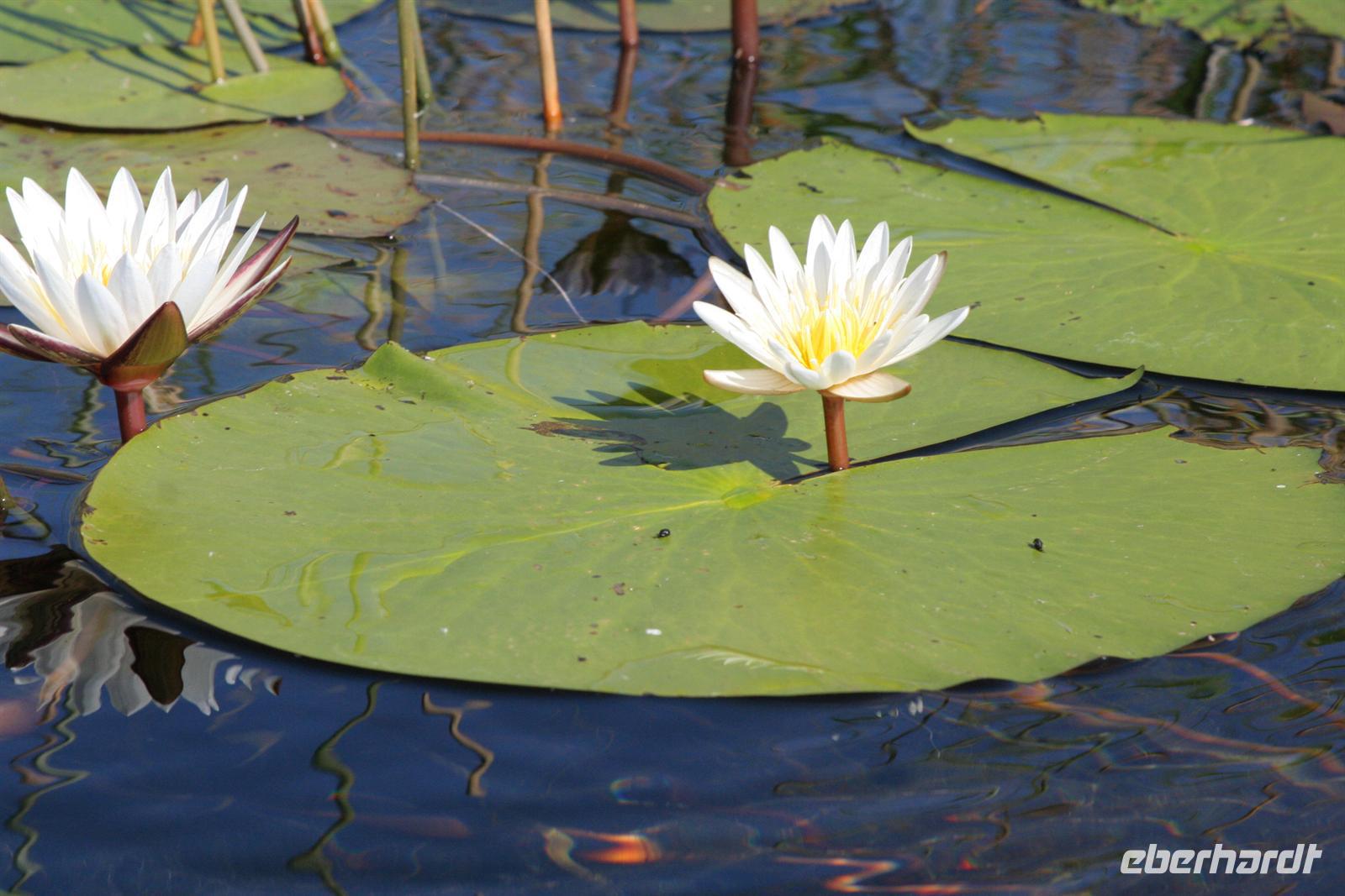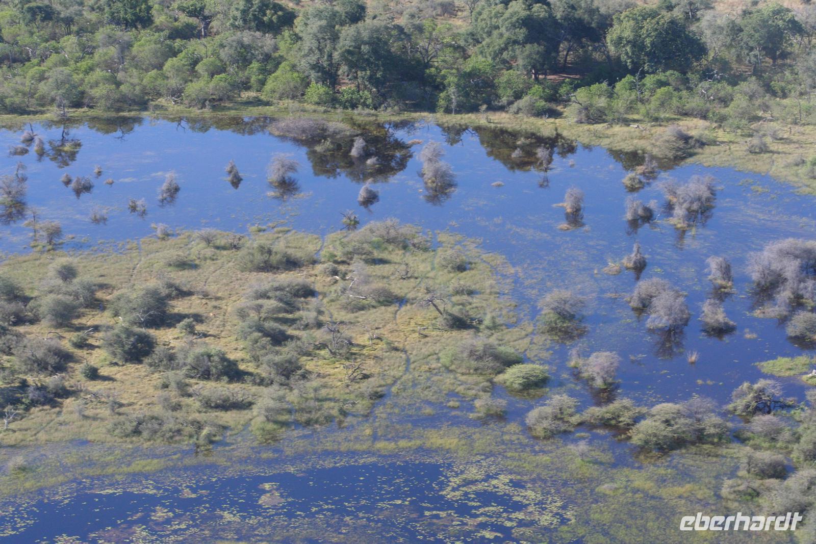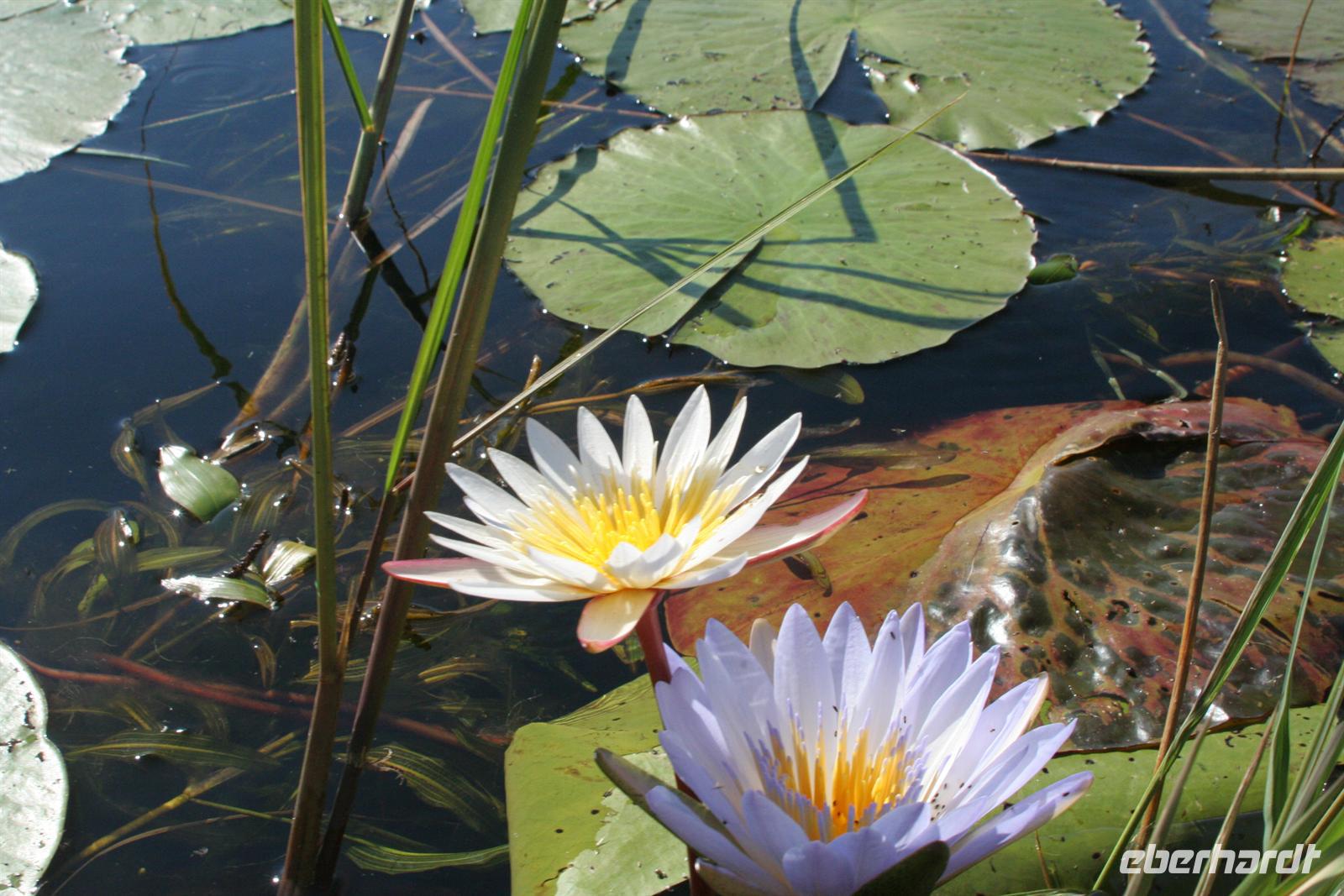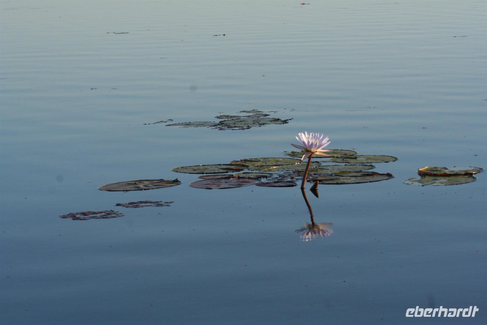 An diesem Tag erwartete uns wieder ein besonderes Abenteuer. Zunächst mit dem Motor-Aluboot fuhren wir auf den Hauptarmen in das immer dichter werdende Delta hinein. Kleine Papyrus-Inselchen durchzogen das Wasser, auf denen sich Teppiche von weiss blühenden Wasserlilien ausbreiteten. Später begrüßten uns einheimische "Poler" (Bootsführer) mit ihren Mokoros (Einbäume), in denen wir je zu zweit Platz nahmen. Lautlos glitten wir durch das seichte Gewässer des Deltas, das uns mit einer unwerfenden Schönheit zunächst sprachlos werden ließ. Die Sonne strahlte mit uns um die Wette. Unsere Poler erklärten uns viele Dinge über das Delta, deren Wasserläufe und dessen Flora und Fauna. Auch konnten sie Spuren im und am Wasser lesen. Die Einheimischen kannten sich im Wasserlabyrinth, für uns ein riesiger Irrgarten, bestens aus.
