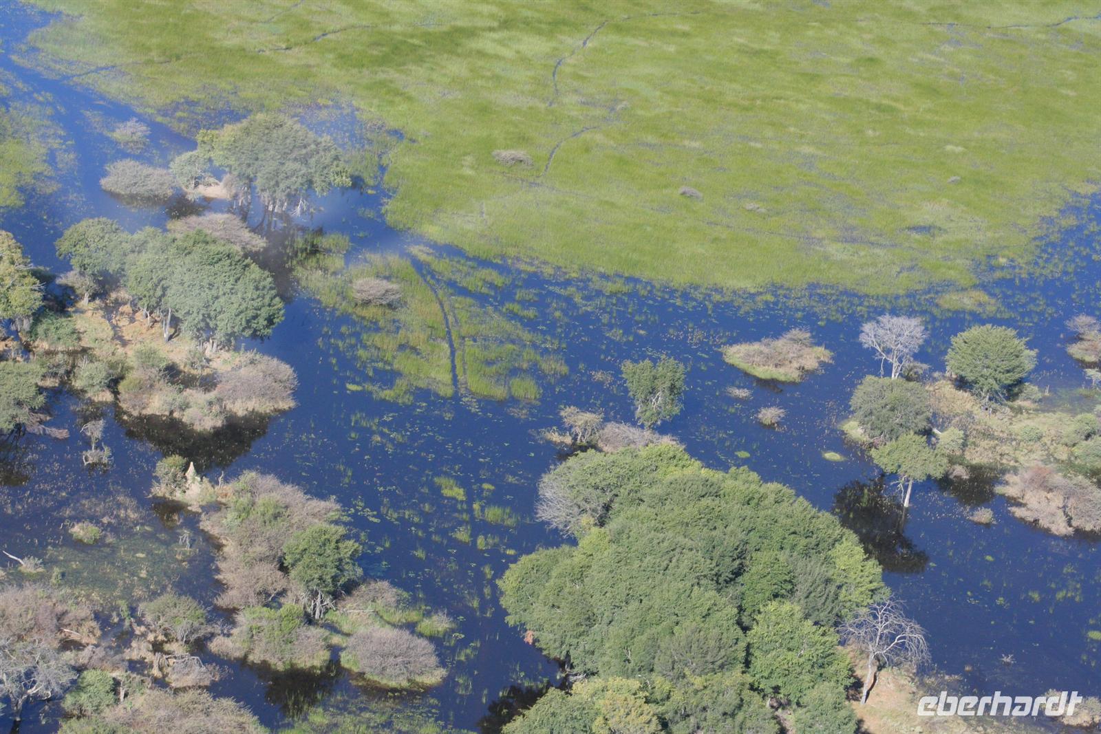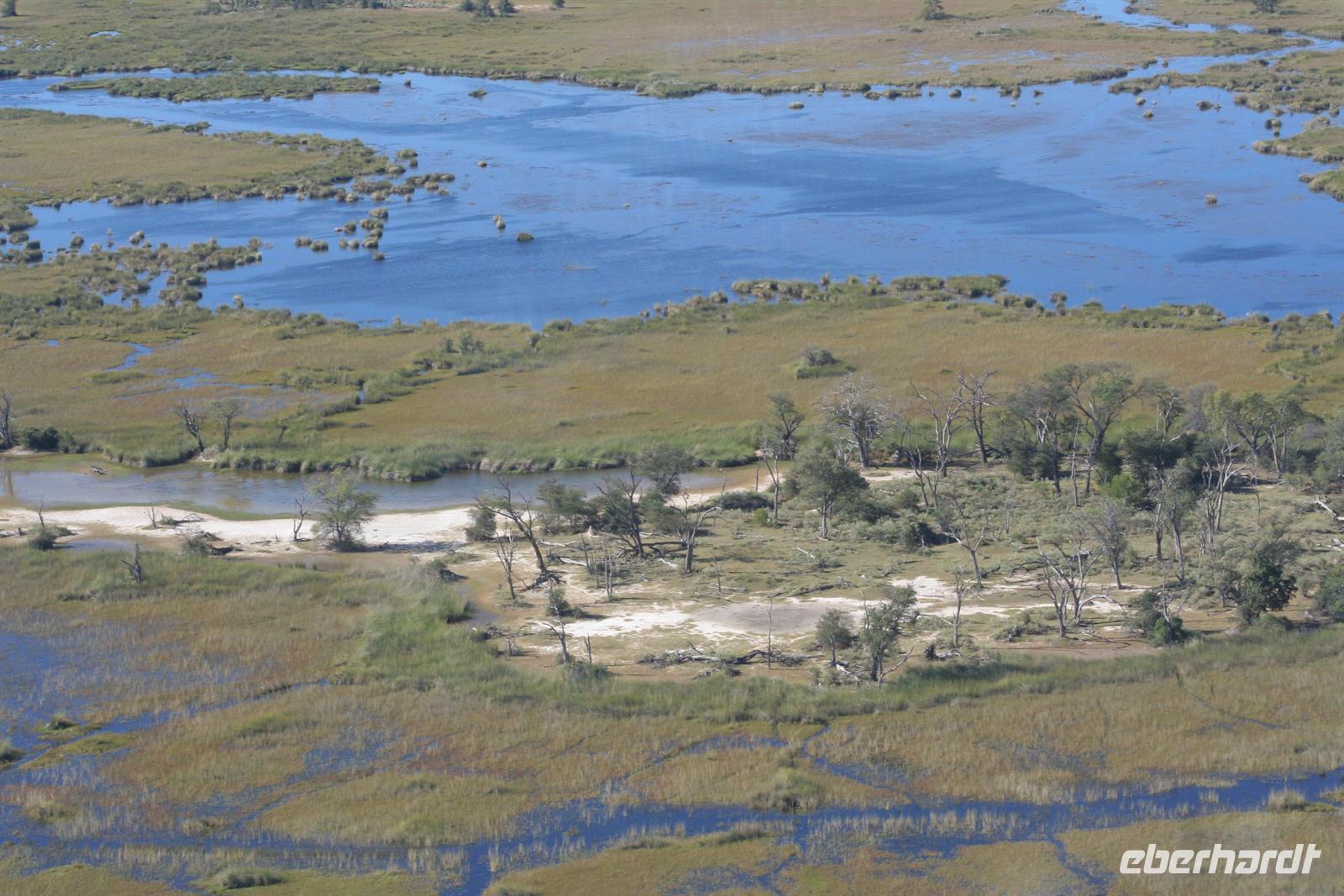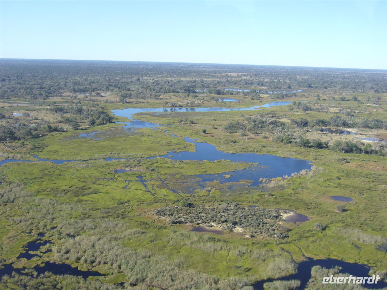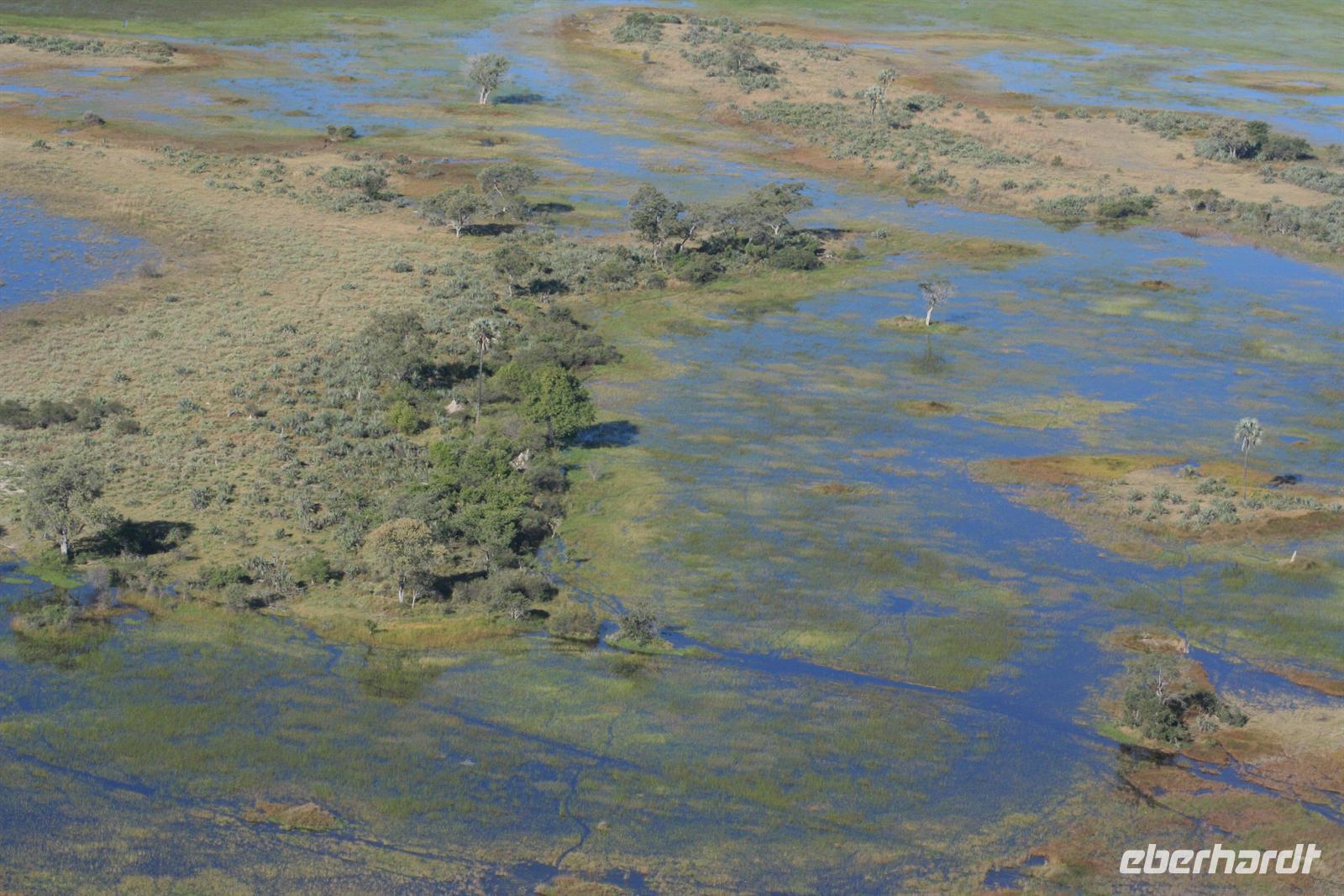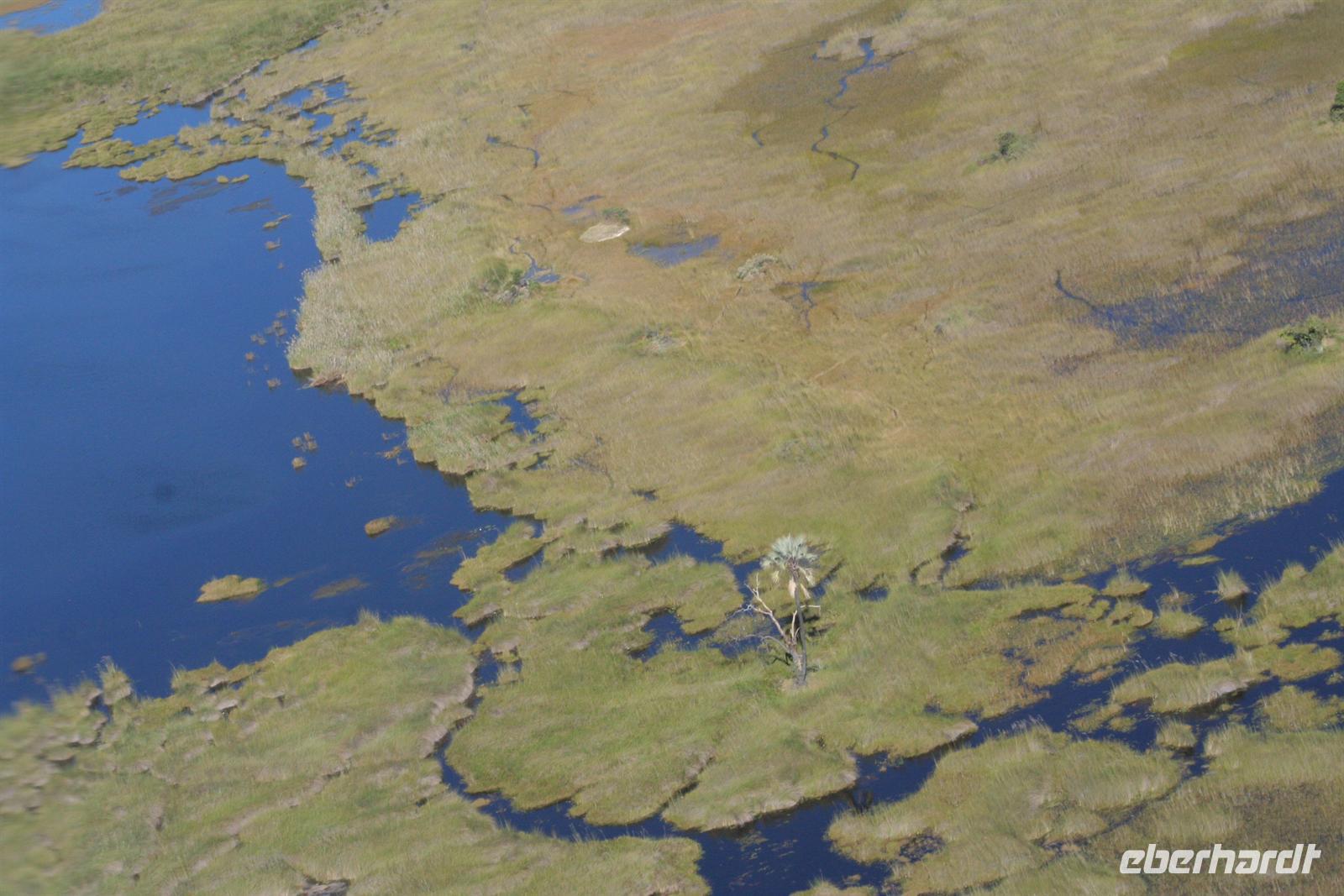 An diesem Tag erwartete uns wieder ein besonderes Abenteuer. Zunächst mit dem Motor-Aluboot fuhren wir auf den Hauptarmen in das immer dichter werdende Delta hinein. Kleine Papyrus-Inselchen durchzogen das Wasser, auf denen sich Teppiche von weiss blühenden Wasserlilien ausbreiteten. Später begrüßten uns einheimische "Poler" (Bootsführer) mit ihren Mokoros (Einbäume), in denen wir je zu zweit Platz nahmen. Lautlos glitten wir durch das seichte Gewässer des Deltas, das uns mit einer unwerfenden Schönheit zunächst sprachlos werden ließ. Die Sonne strahlte mit uns um die Wette. Unsere Poler erklärten uns viele Dinge über das Delta, deren Wasserläufe und dessen Flora und Fauna. Auch konnten sie Spuren im und am Wasser lesen. Die Einheimischen kannten sich im Wasserlabyrinth, für uns ein riesiger Irrgarten, bestens aus.