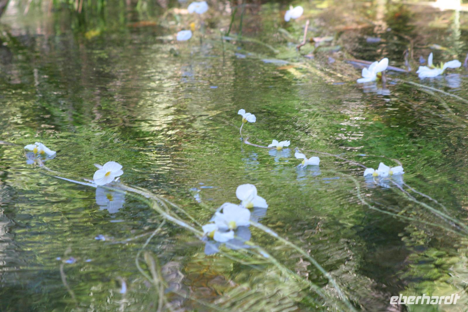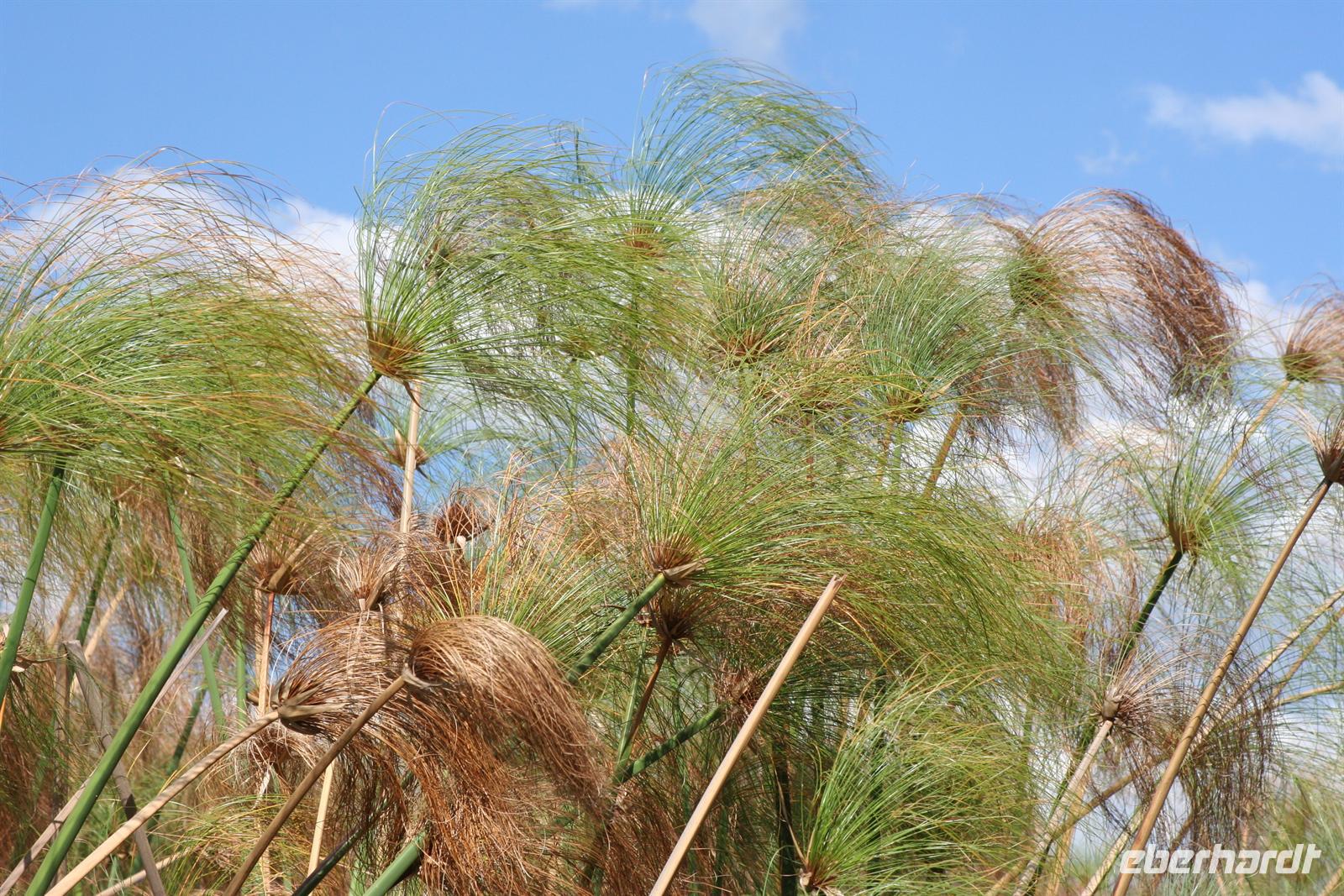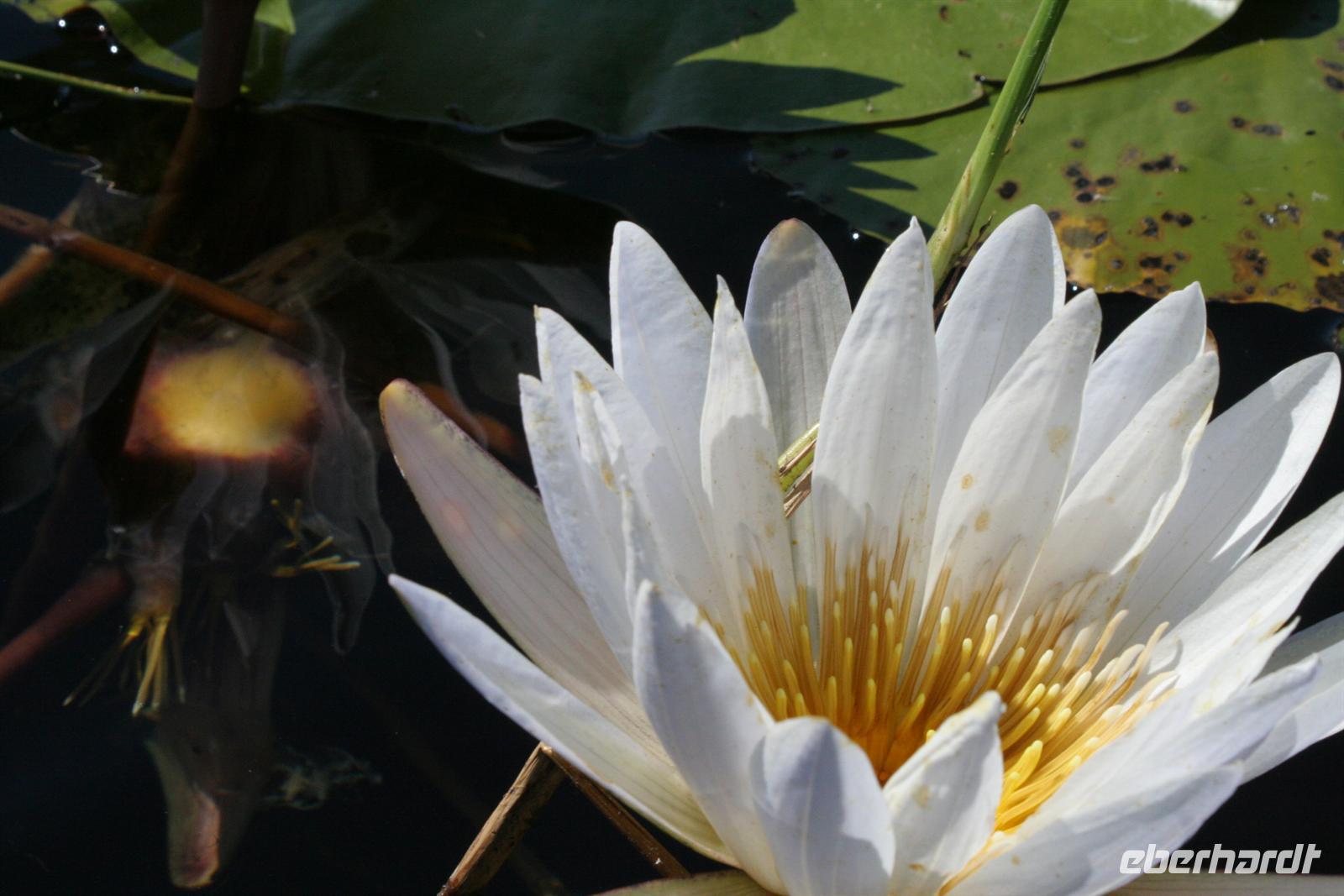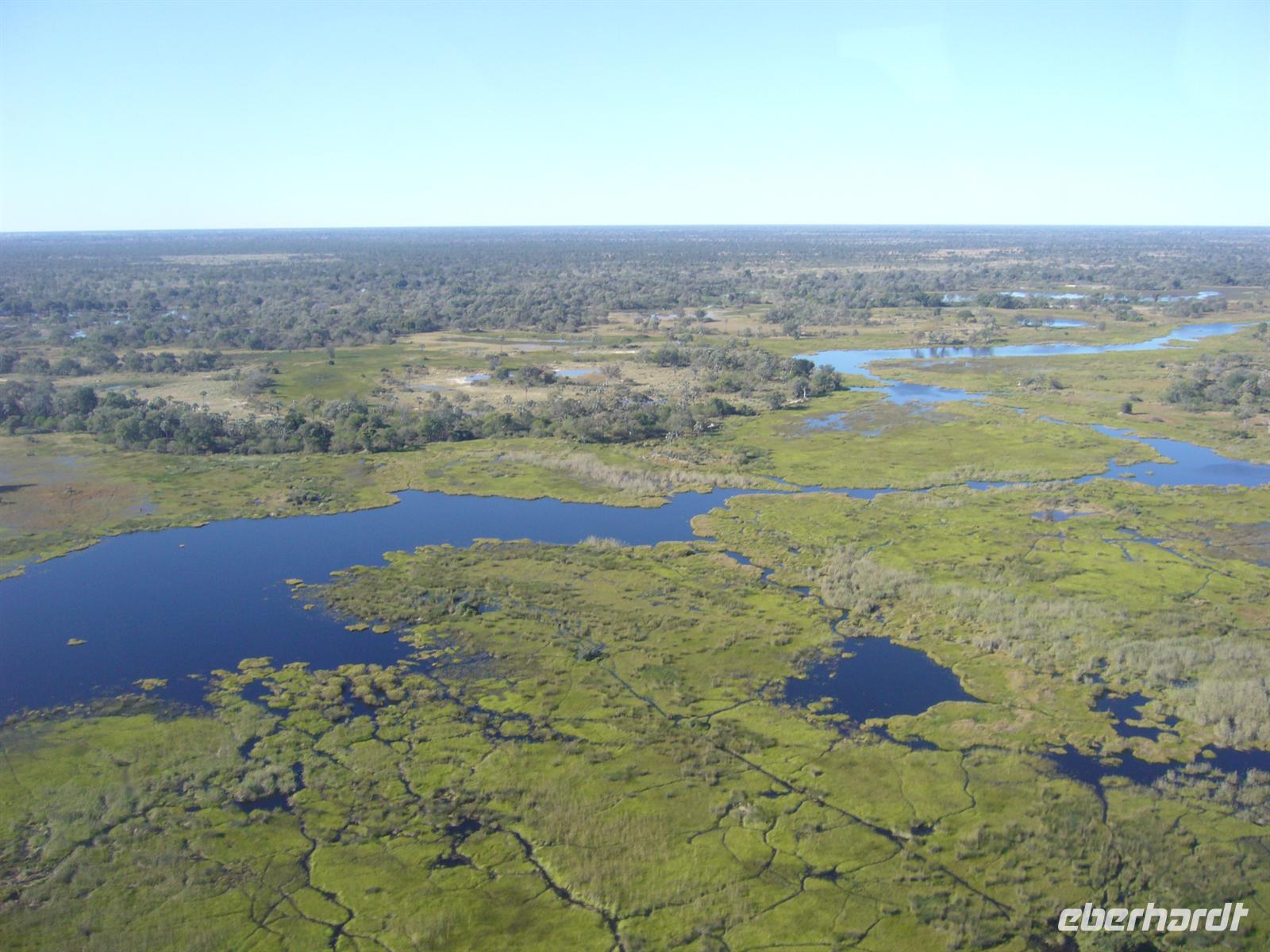 An diesem Tag erwartete uns wieder ein besonderes Abenteuer. Zunächst mit dem Motor-Aluboot fuhren wir auf den Hauptarmen in das immer dichter werdende Delta hinein. Kleine Papyrus-Inselchen durchzogen das Wasser, auf denen sich Teppiche von weiss blühenden Wasserlilien ausbreiteten. Später begrüßten uns einheimische "Poler" (Bootsführer) mit ihren Mokoros (Einbäume), in denen wir je zu zweit Platz nahmen. Lautlos glitten wir durch das seichte Gewässer des Deltas, das uns mit einer unwerfenden Schönheit zunächst sprachlos werden ließ. Die Sonne strahlte mit uns um die Wette. Unsere Poler erklärten uns viele Dinge über das Delta, deren Wasserläufe und dessen Flora und Fauna. Auch konnten sie Spuren im und am Wasser lesen. Die Einheimischen kannten sich im Wasserlabyrinth, für uns ein riesiger Irrgarten, bestens aus.