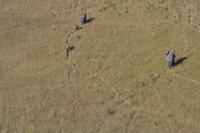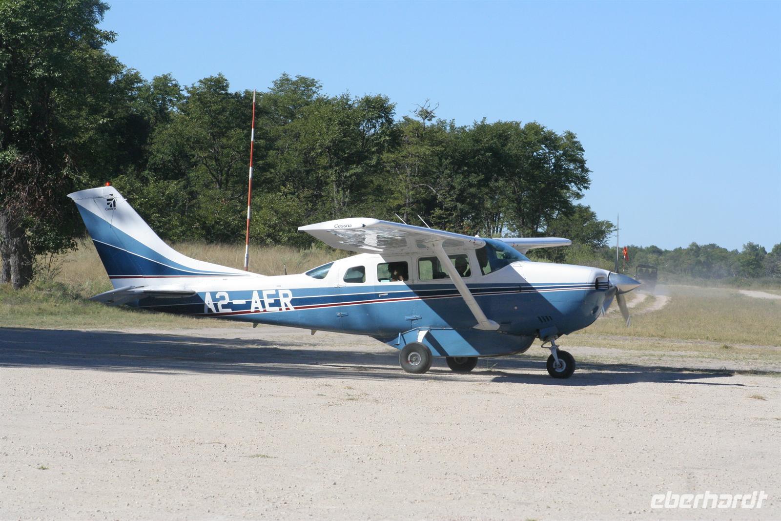 Unterwegs begegneten wir (oder die Tiere uns?) einer seltenen Kuhantilope (eine der schnellsten) und Tshesebe (Leierantilope), Gnus, Wasserböcken und Impalas, Elefanten, Straußen, Zebras, Giraffen, grünen Meerkatzen, Warzenschweinen, Schakalen, Pavianen, Wasserbüffeln (sicher hab ich was vergessen!) und jede Menge Vögel- und Reiherarten (u.a. einen Hammerkopf und dessen Nest). Unser ausgiebiges Mittagspicknick nahmen wir auf dem Campingplatz "Third Bridge" ein und stärkten uns an leckeren Salaten, Hühnerbeinchen und Steaks. Auf dem Weg zum kleinen Flughafen im Moremi trafen wir noch auf ein Löwenpäarchen, welches ebenfalls nach einer Mittagspause wieder aktiv wurde. Eines der schönsten Erlebnisse dieser Reise war nun der Flug vom Moremi Crossing über das südliche Okavango-Delta zurück nach Maun. Nach einer Einweisung der Piloten hoben wir mit 2 modernen "Buschfliegern" ab und genossen den fast 1stündigen Flug (ca. 100 USD). Durch fantastische Flugmanöver konnte jeder die Faszination erleben und atemberaubende Fotos "schießen": Elefantenherden mit Babyelefanten, Giraffen, Zebras, Wasserbüffel- und Hippoherden unter uns, ganz klein in der atemberaubenden Kulisse der türkisblauen (Wasser) und saftig grünen (Gras/Wald) Welt des Okavango-Deltas.