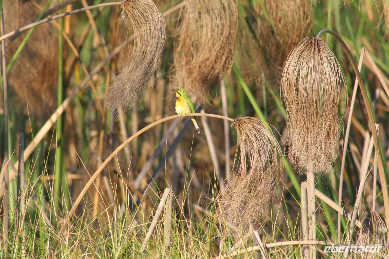 Mit den Mokoros schipperten wir gut gestärkt zum "Ankerplatz" des Motorbootes zurück und liessen die einzigartige Natur noch einmal auf uns wirken. Unterwegs begegneten wir wieder Krokodilen, zahlreichen Bienenfressern und anderen exotischen Vögeln. Tom zeigte uns, dass auch Papyrus essbar ist. Wir probierten natürlich und kauten etwas lustlos auf den nach Tapetenkleister schmeckenden, zähen Naturfasern herum. Besser und vorallem lustiger fanden wir dann schon die Idee mit dem längsten Strohhalm aus dem Stengel der Wasserlilie, getreu dem Motto eine Bootsfahrt, die ist lustig - eine Bootsfahrt, die macht Spass. Besonders als uns der Sprit im Bootstank ausging. Bevor wir uns aber überlegten, wie wir das Boot mit manueller Kraft in Bewegung setzen können, ohne dass unsere Arme als Delikatesse für Krokodile herhalten mußten, beobachteten wir, ganz entspannt bei einem kühlen "Sundowner" den Sonnenuntergang. Hilfe nahte schnell und so kamen wir rechtzeitig zum wiederum fantastischen Abendessen in unserer Lodge an. Den letzten Abend auf Nguma Island läuteten wir mit einer Amarula-Runde gebührend ein. Es waren 2 unvergessliche Tage, die wir hier verbringen durften.
