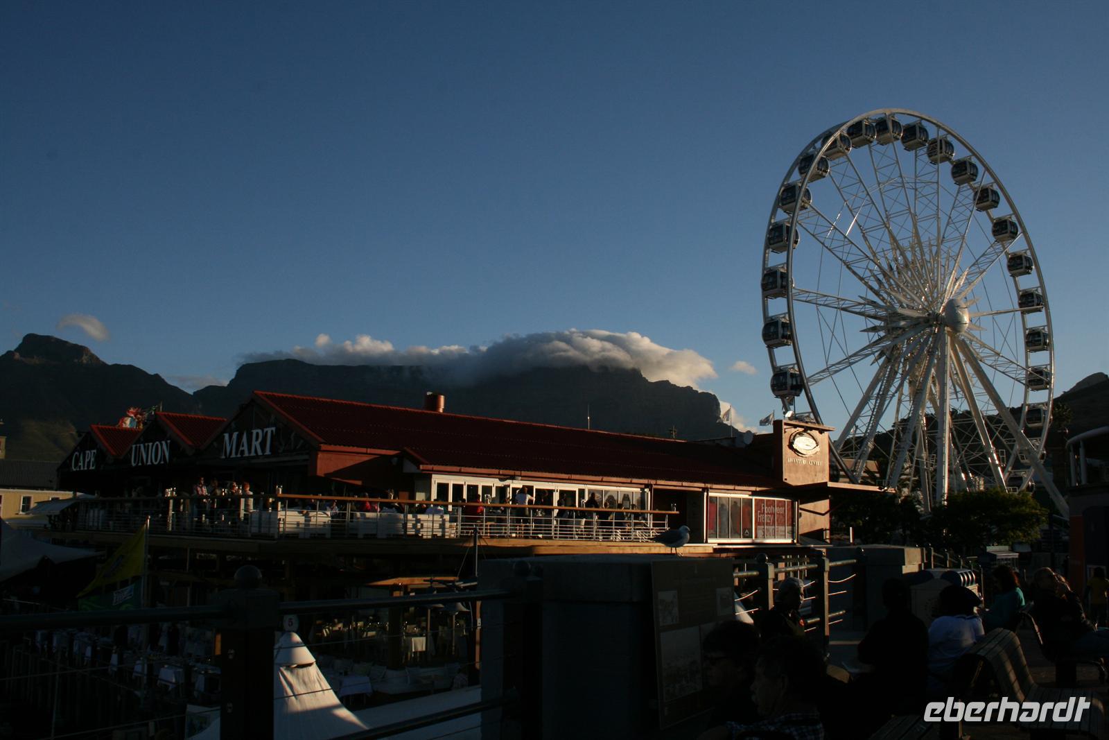 Heute morgen waren wir quasi eine neue Gruppe - alle ausgeschlafen und frisch . Wir fuhren zuerst nach Stellenbosch, eine wunderschöne Universitätsstadt. Dort besuchten wir das Freilichtmuseum, in dem Häuser im Stil von 4 Epochen eingerichtet sind. Dazu waren hübsche Gärten eingerichtet und wir hatten auch Zeit, uns mit Andrea einmal dem Thema der Apartheid und der heutigen Entwicklung zu widmen. Wir hörten alle gespannt zu und stellten unsere Fragen. Im Anschluss an diesen Besuch hatten wir alle Freizeit und schlenderten durch den kleinen Ort. Das Mittagessen in Franschhoek, der französischen Ecke, war von sehr guter Qualität und schmeckte vorzüglich! Auch in diesem kleinen Ort spazierten wir eine kleine Runde, bevor wir nach Paarl fuhren und vom Sprachdenkmal eine fantastische Aussicht genossen! Zurück in Kapstadt fuhren wir auf die Talstation der Tafelberg-Bahn und freuten uns auf den Blick von oben. Andrea besorgte uns Karten, während wir bereits von hier, in reichlich 300 Metern Höhe das riesige Kapstadt bewunderten. Auf dem Weg nach oben, bei dem man aufgrund der drehenden Gondel einen Rundum-Blick hat, sahen wir schon, wie sich das schwere weiße Tischtuch auf den Tafelberg legte. Somit hatten wir leider keine freie Sicht, aber eine interessante Stimmung war es auf jeden Fall. Zum Abschluss fuhren wir dann für einen kurzen Stopp an die Victoria und Alfred Waterfront und sogen ein bisschen der Stimmung auf, die das Vergnügungsviertel verbreitet.